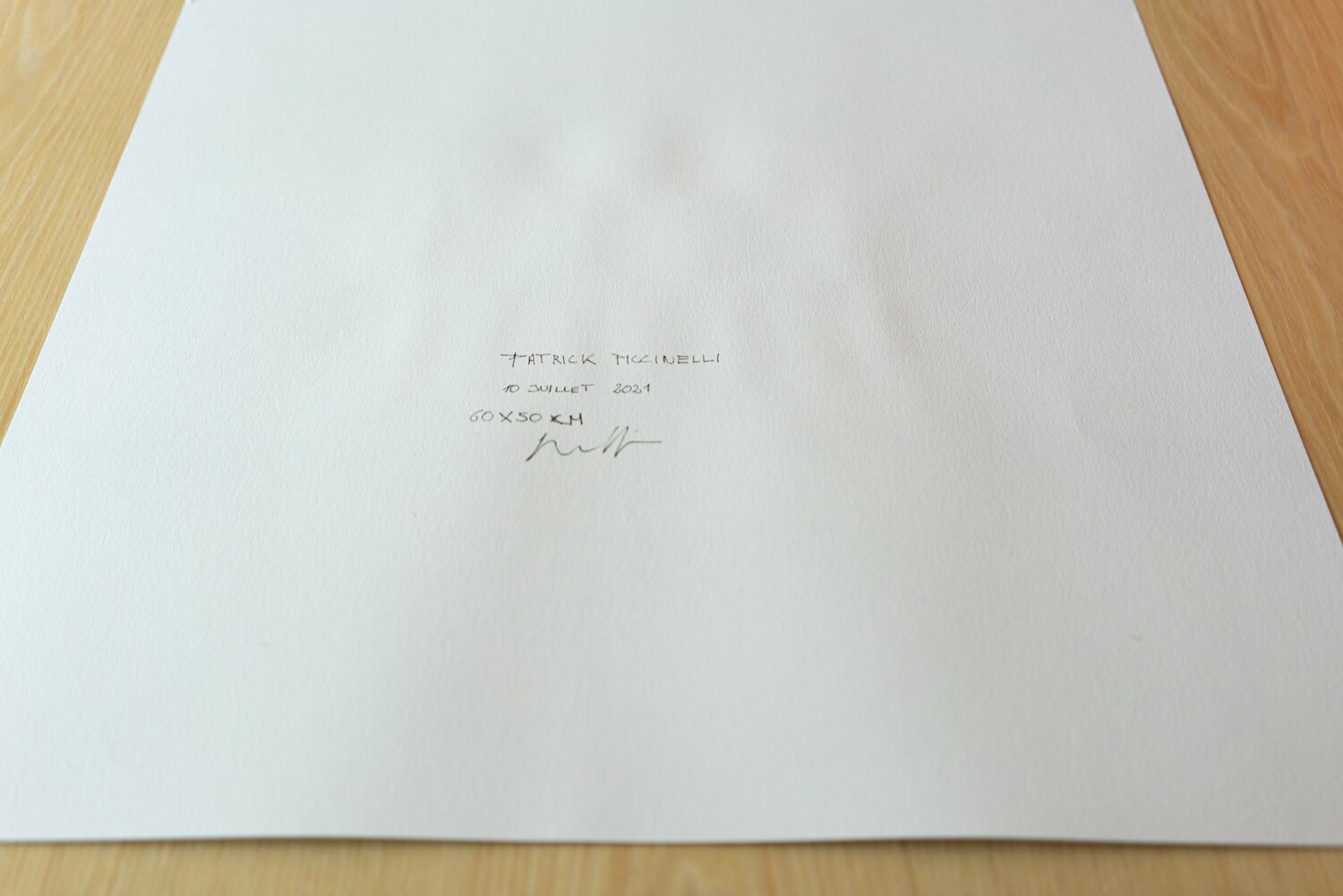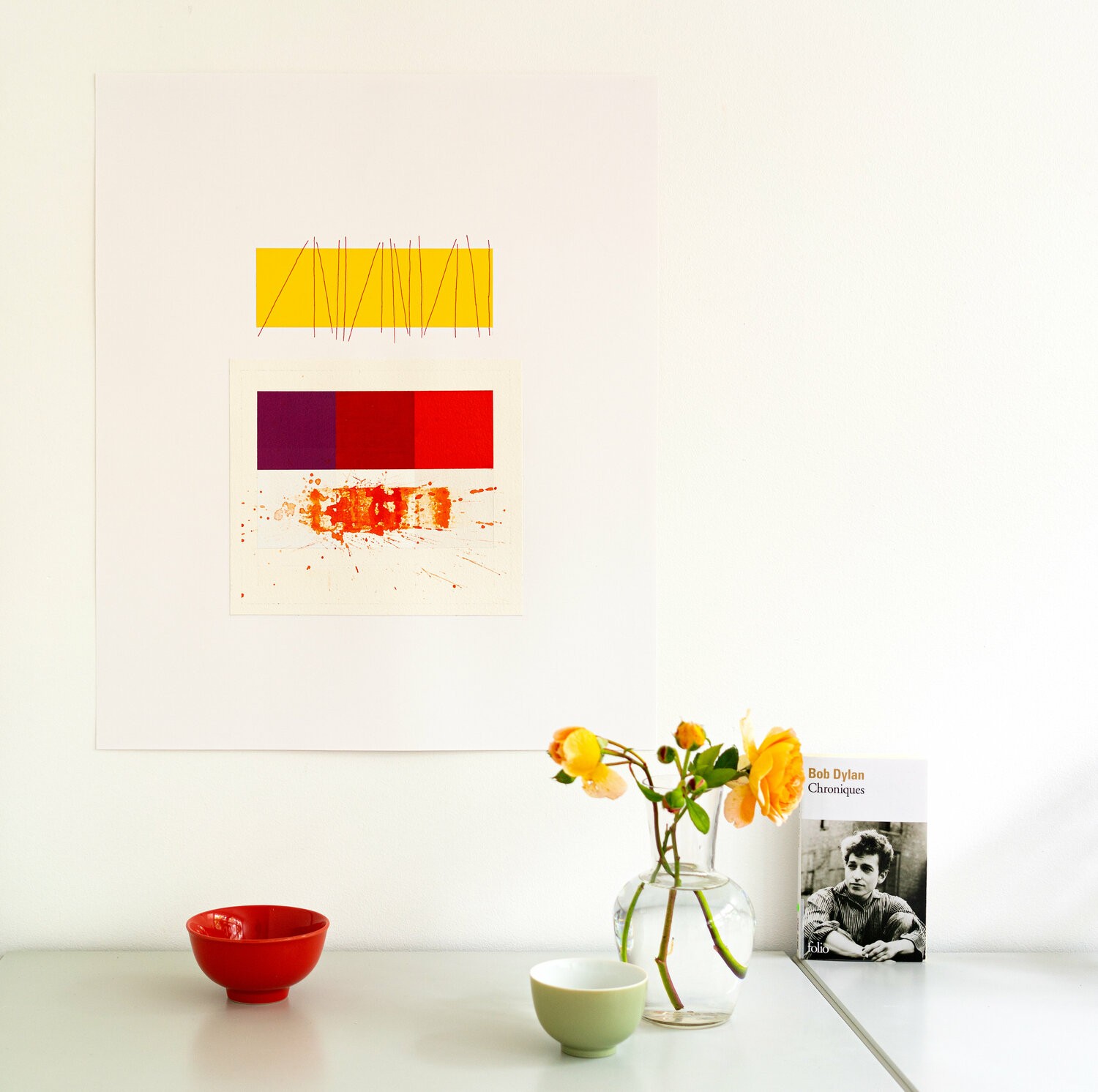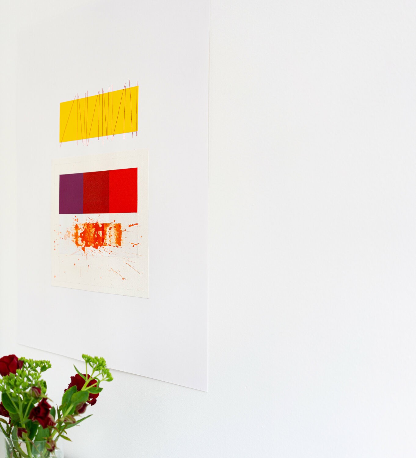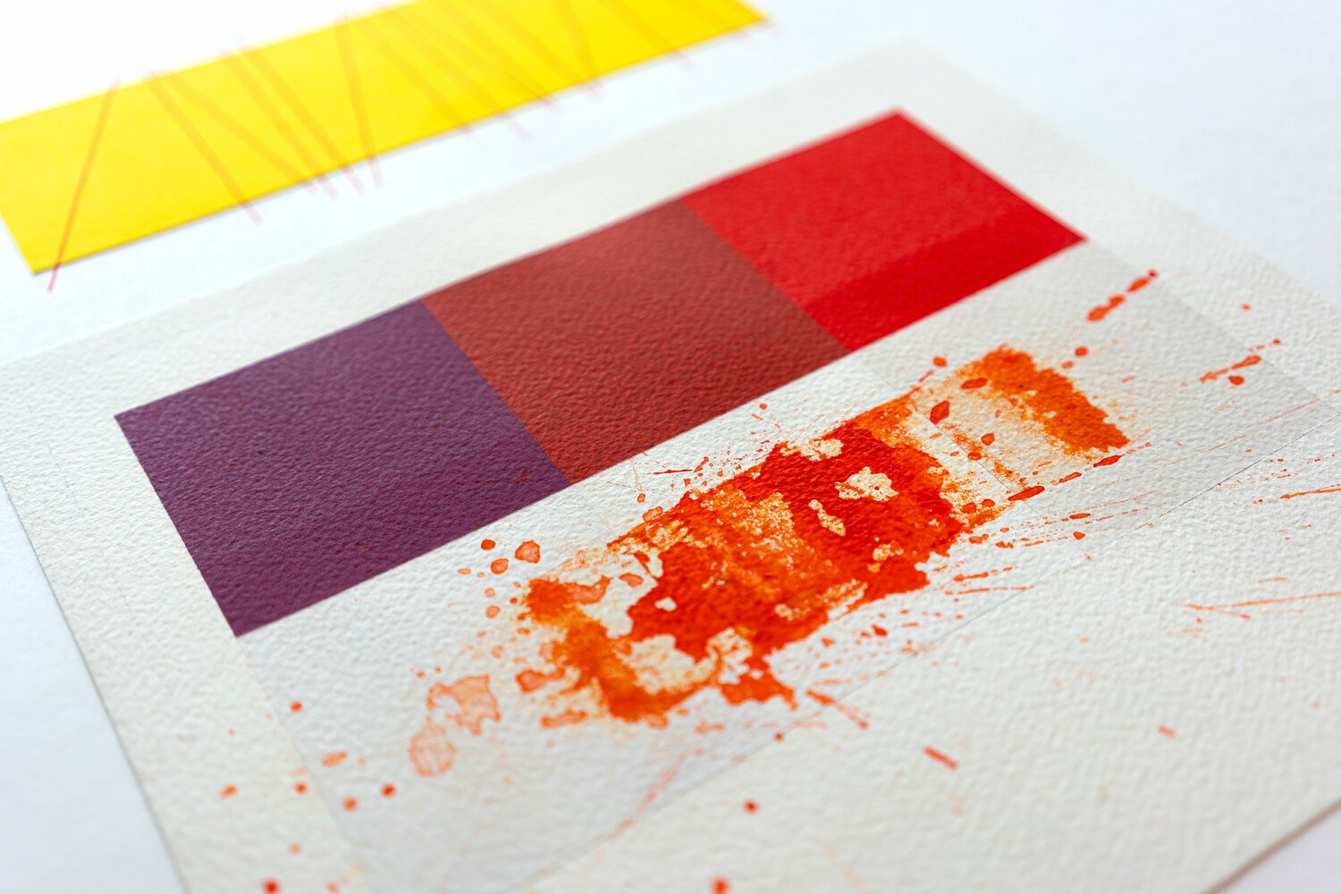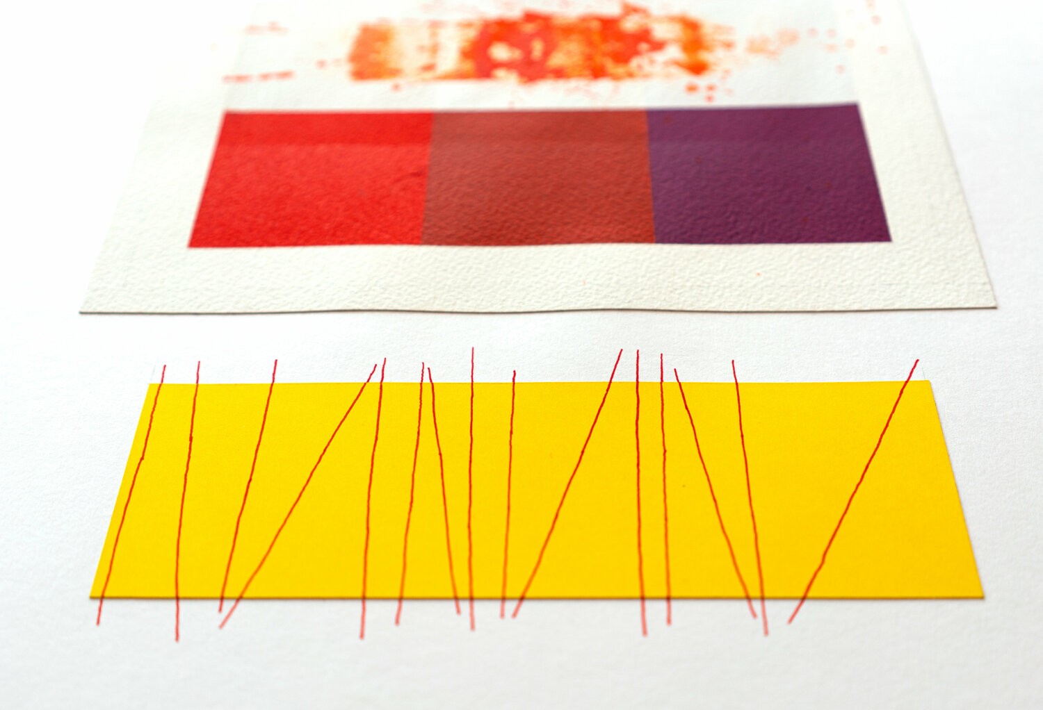 The center of the composition consists of a rectangle formed by 3 squares. On the left a purple square; on the right a light cadmium red square; the central square is a color formed by the addition of purple and red (in successive layers).This central rectangular element is put into a chromatic and formal dialogue with the top and bottom elements. The top rectangle is made by gluing yellow tinted paper cut to the same size as the central element.