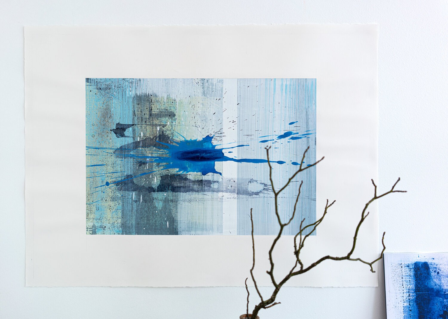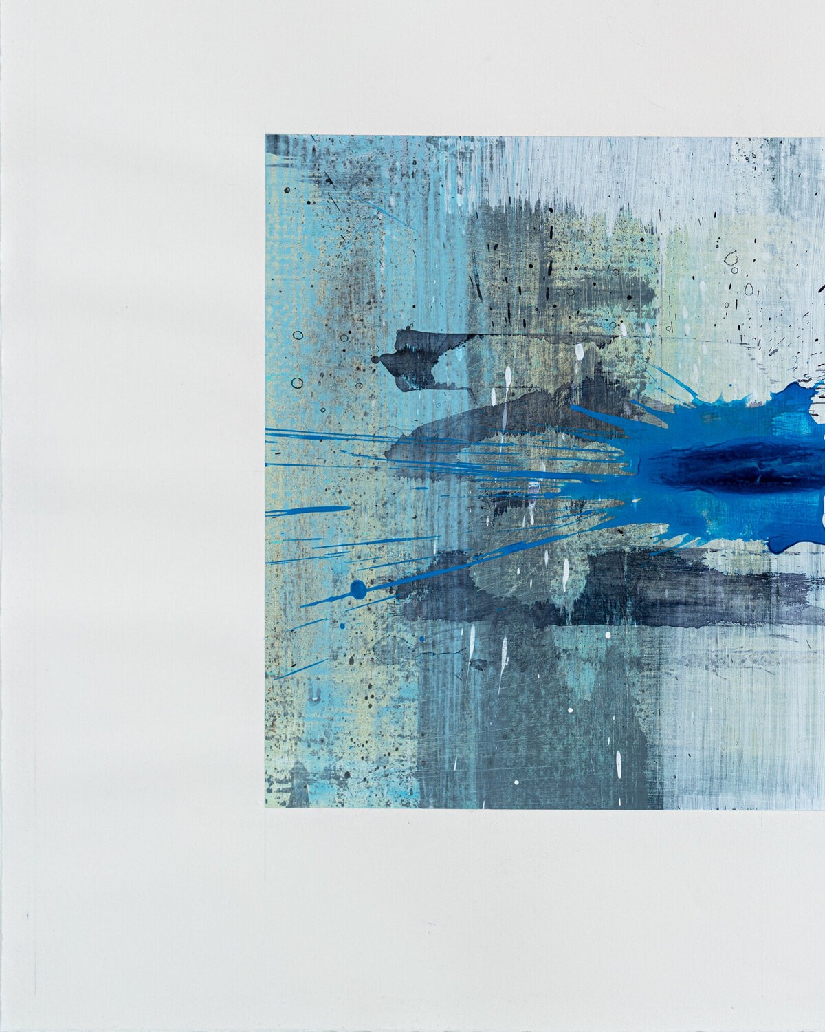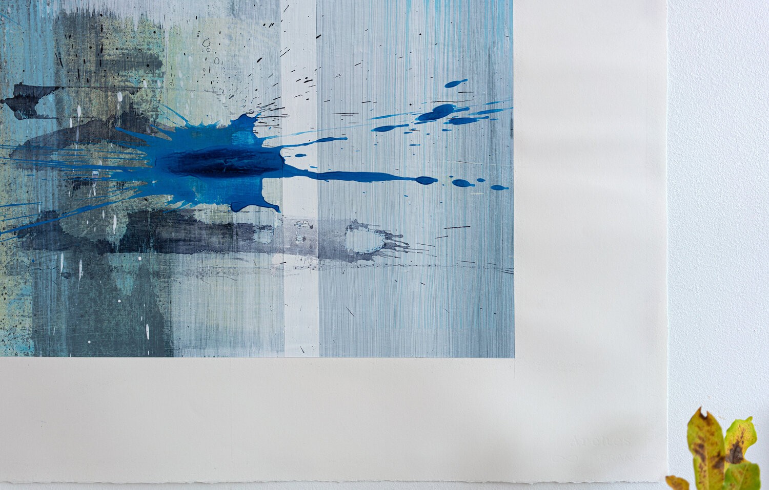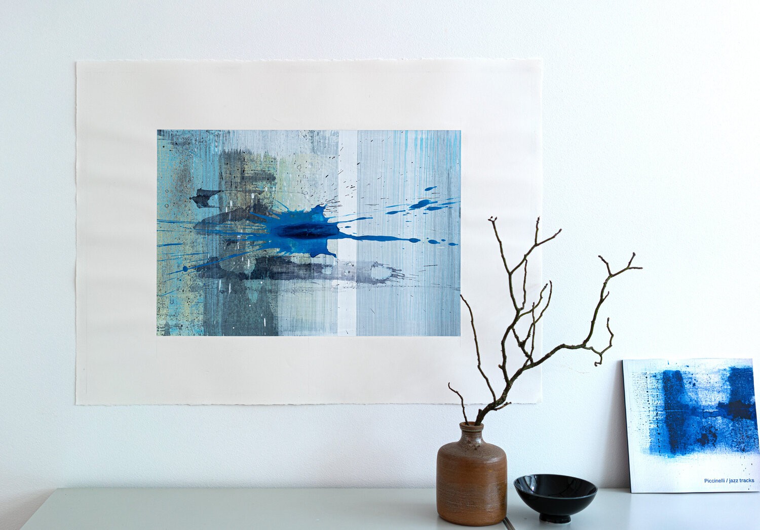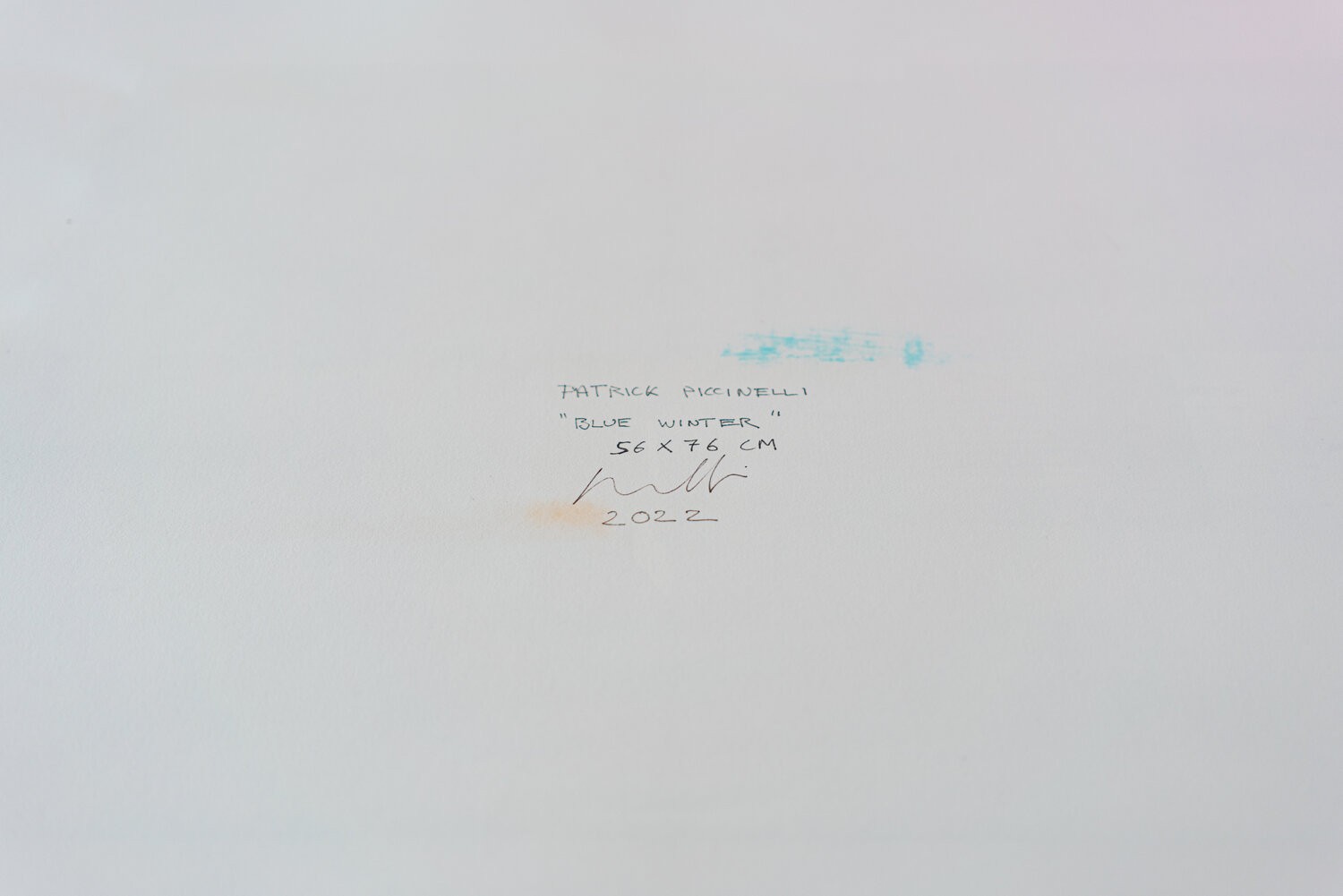 This work on paper evokes the winter landscape. Sometimes the snow totally covers the landscape and all you can see are white; gray and bluish shades. But the snow can also give a glimpse of plowed soil. These textures are found in the abstract painting of Piccinelli. These minimalist abstract "landscapes" are also influenced by the great American painter Robert Ryman known for his formal and rigorous exploration of monochrome painting. This pictorial work by multiple more or less thick layers also evokes the passage of time; the nostalgia of past days; a kind of happy melancholy. In this work on paper we also find the visual dialogue between the geometric structure and the random elements such as traces and splashes.