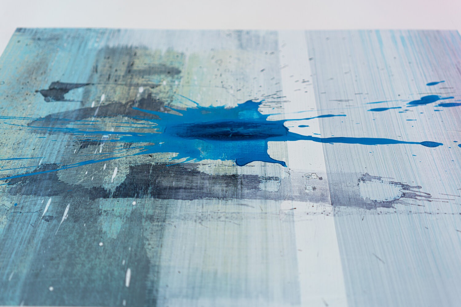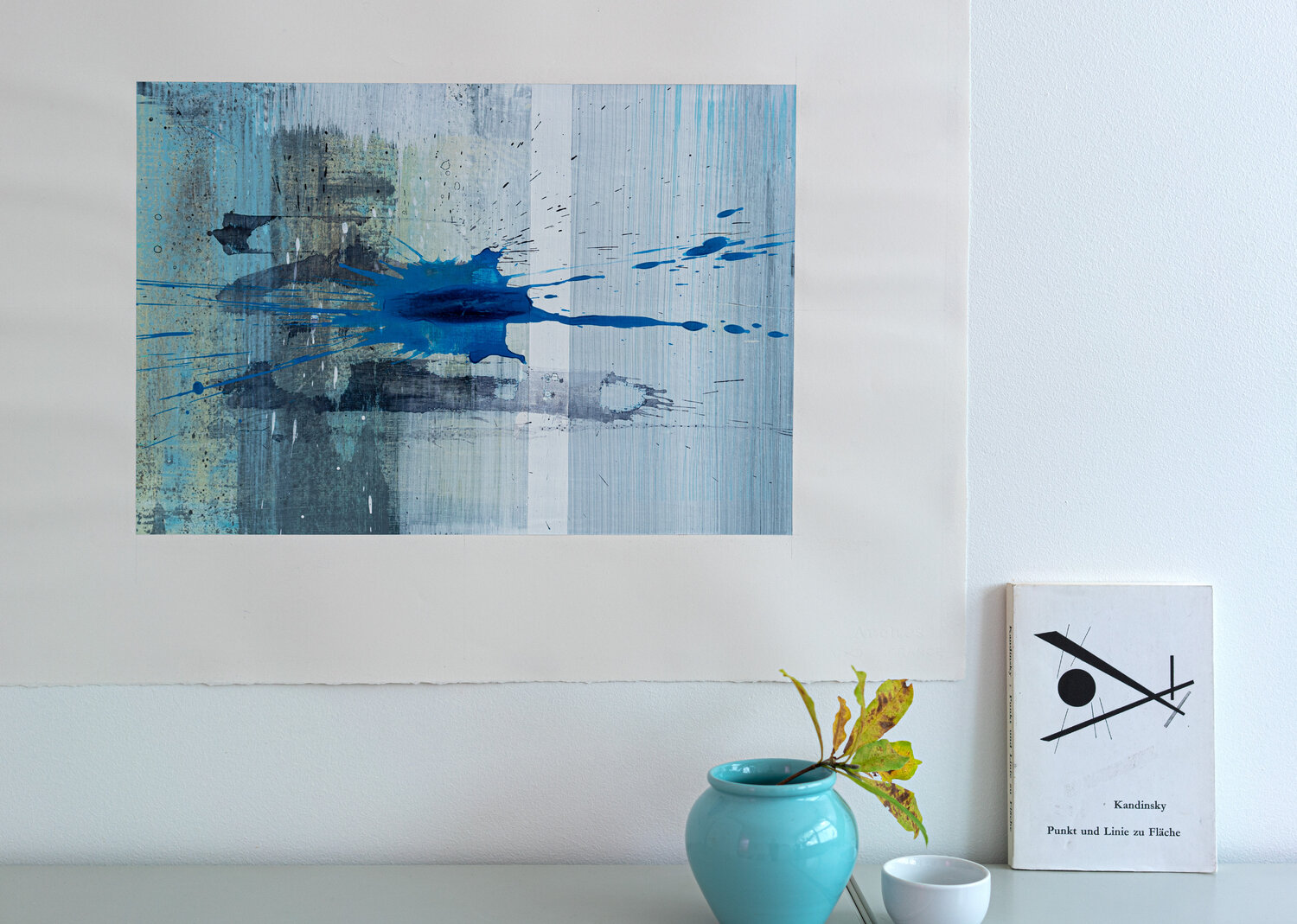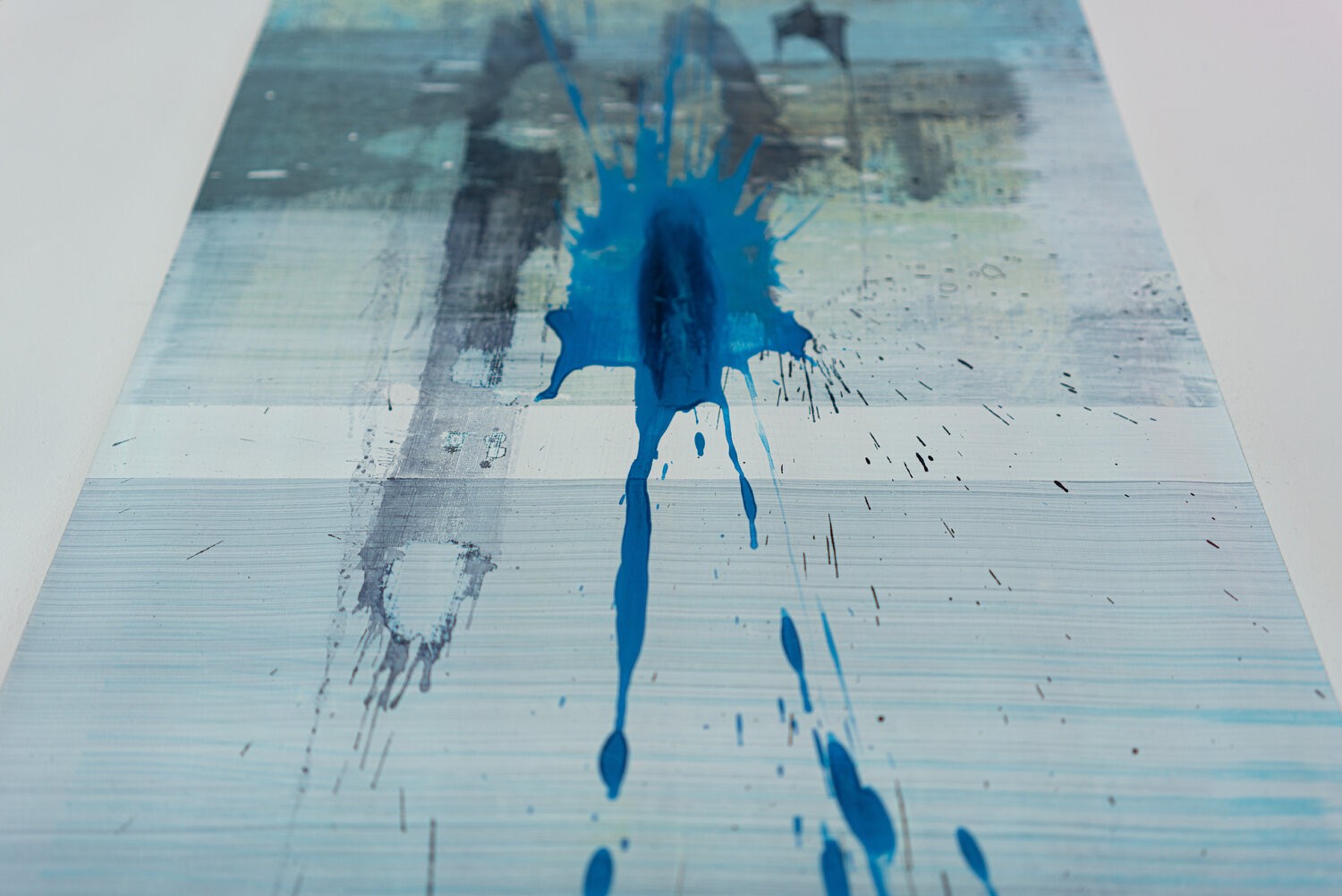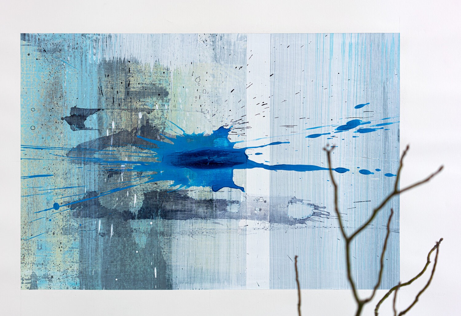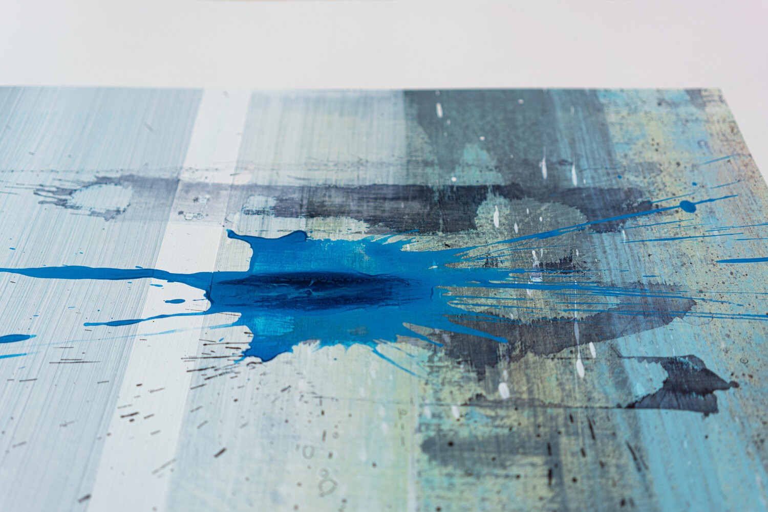 This work on paper evokes the winter landscape. Sometimes the snow totally covers the landscape and all you can see are white; gray and bluish shades. But the snow can also give a glimpse of plowed soil. These textures are found in the abstract painting of Piccinelli. These minimalist abstract "landscapes" are also influenced by the great American painter Robert Ryman known for his formal and rigorous exploration of monochrome painting. This pictorial work by multiple more or less thick layers also evokes the passage of time; the nostalgia of past days; a kind of happy melancholy. In this work on paper we also find the visual dialogue between the geometric structure and the random elements such as traces and splashes.