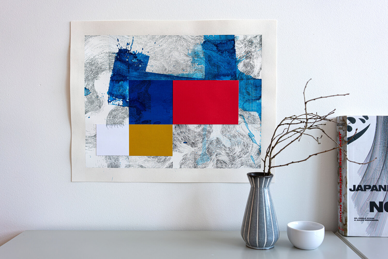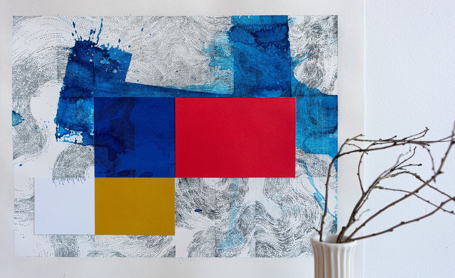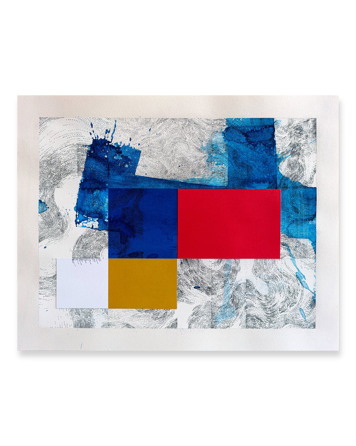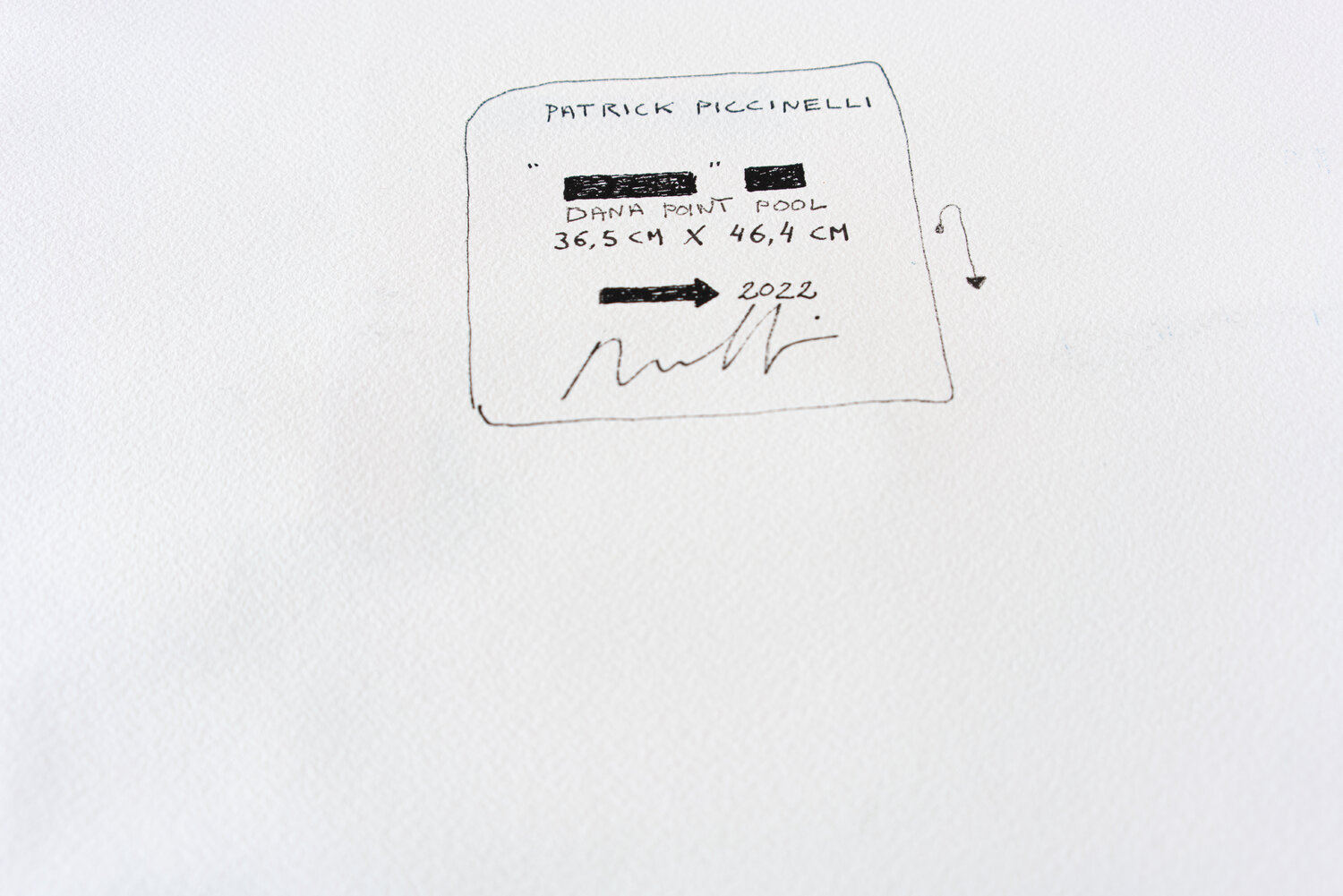 Work on paper; painting and drawing on Arches paper with collage of tinted papers and ink.The work is nourished by multiple references; the joy of living; the Côte d'Azur in the 1960s; the Italian Dolce Vita; the film "Pierrot Le Fou by Jean-Luc Godard and "Amarcord by Federico Fellini; but also the modernist architecture of Le Corbusier; the aesthetic research of Charles and Ray Eames in the field of design. For Piccinelli; the swimming pool represents a metaphor linked to his visual research. He is passionate about creating a visual dialogue between a rigorous and minimal geometric structure with random expressionist elements. The pool is a precise colored shape (often a blue rectangle). The reading of this rectangle is disturbed by the undulations of the water or a dive generating waves and splashes.