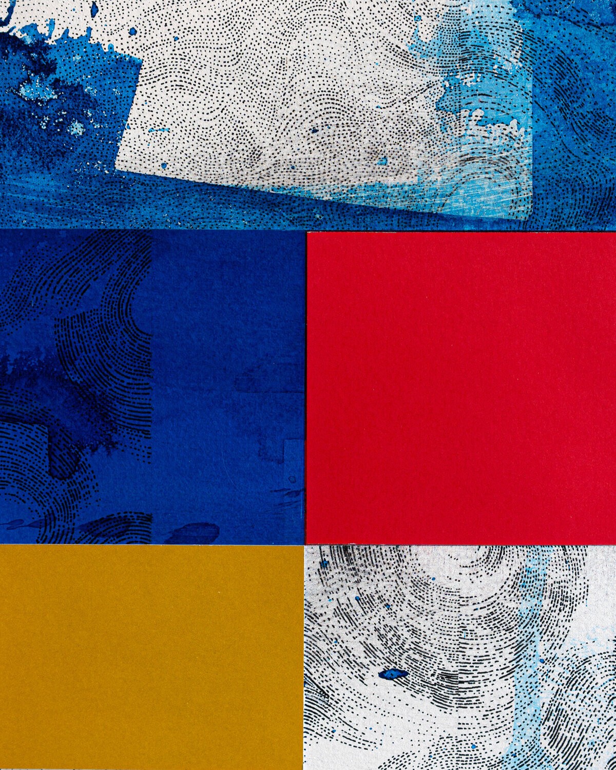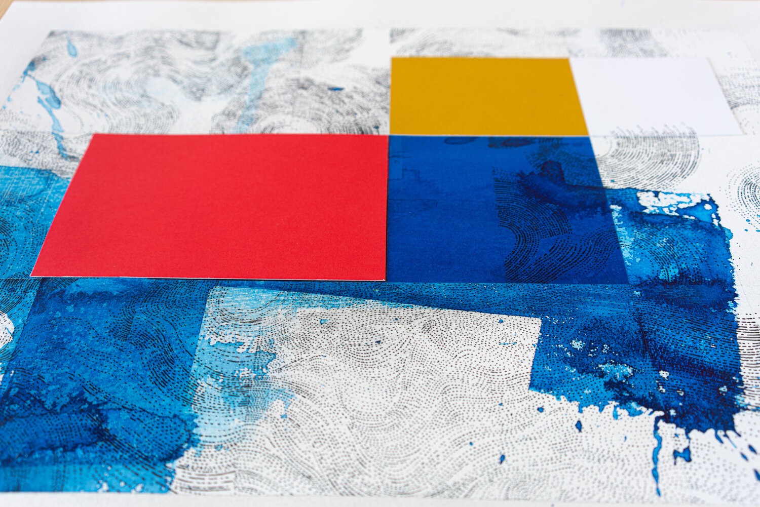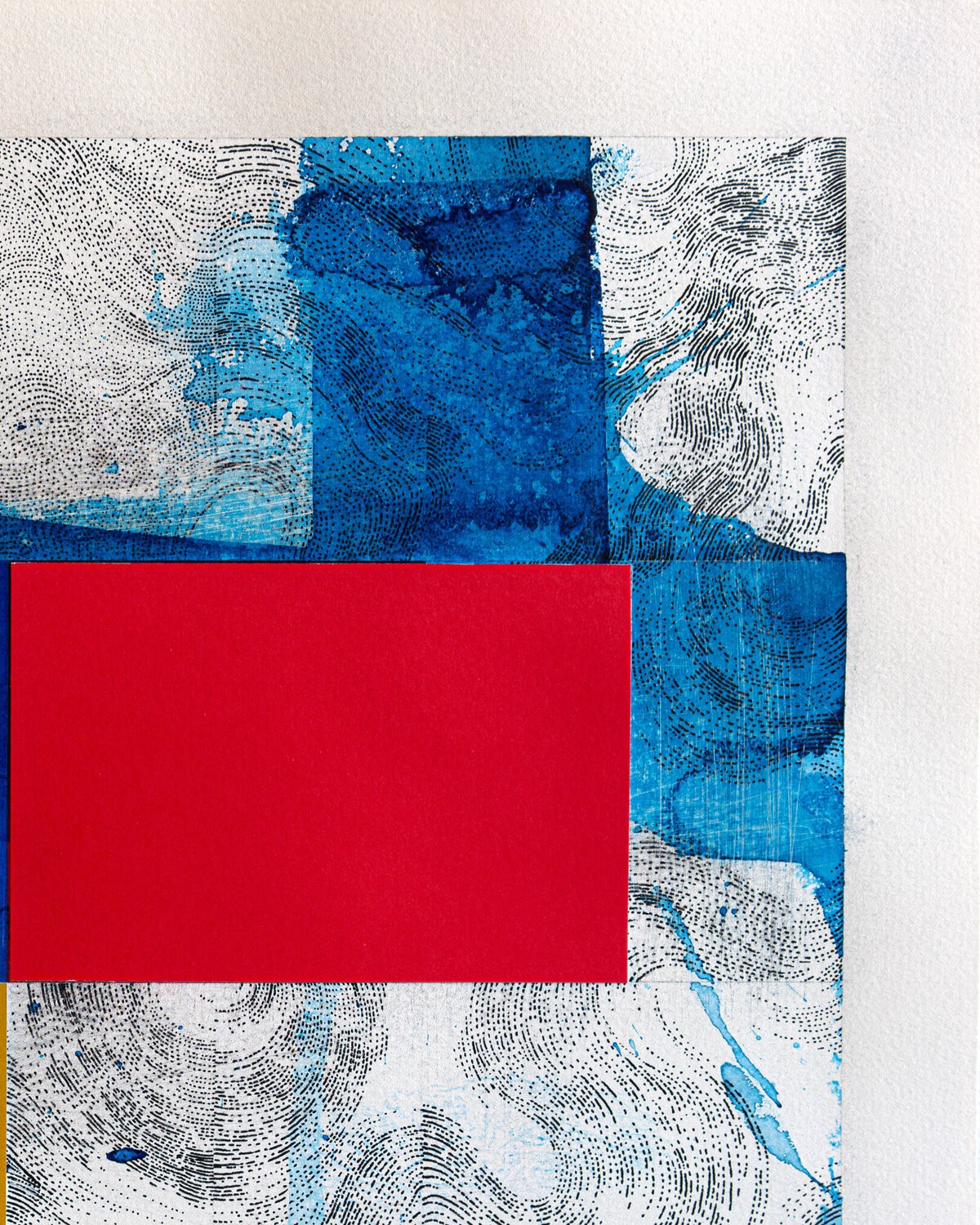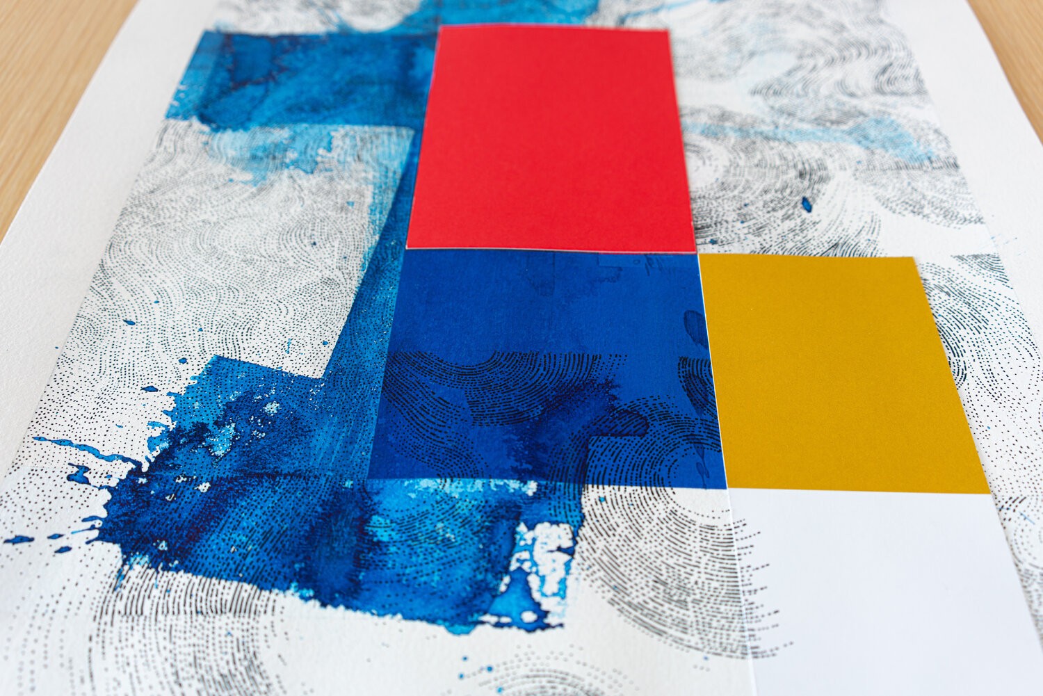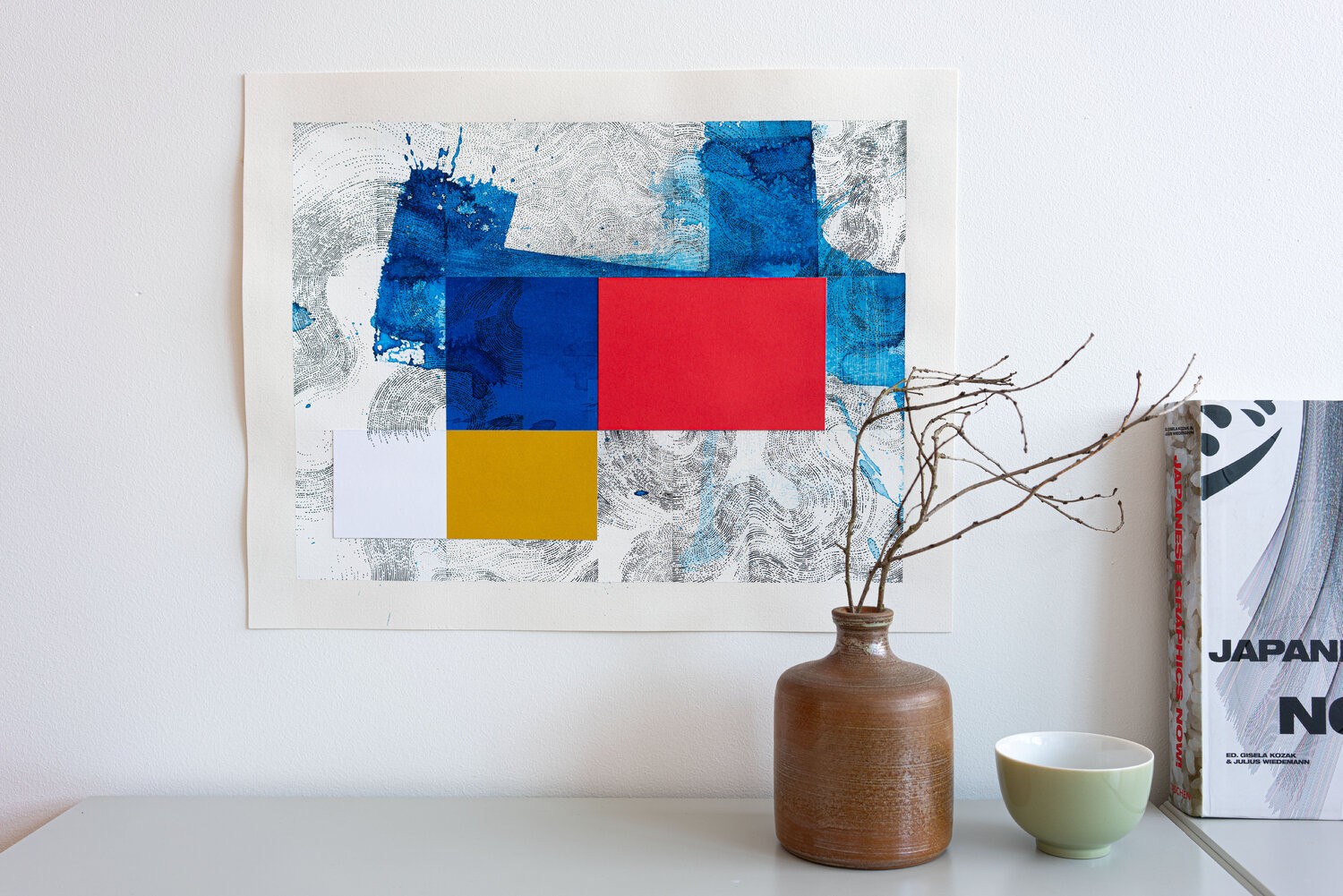 Work on paper; painting and drawing on Arches paper with collage of tinted papers and ink.The work is nourished by multiple references; the joy of living; the Côte d'Azur in the 1960s; the Italian Dolce Vita; the film "Pierrot Le Fou by Jean-Luc Godard and "Amarcord by Federico Fellini; but also the modernist architecture of Le Corbusier; the aesthetic research of Charles and Ray Eames in the field of design. For Piccinelli; the swimming pool represents a metaphor linked to his visual research. He is passionate about creating a visual dialogue between a rigorous and minimal geometric structure with random expressionist elements. The pool is a precise colored shape (often a blue rectangle). The reading of this rectangle is disturbed by the undulations of the water or a dive generating waves and splashes.