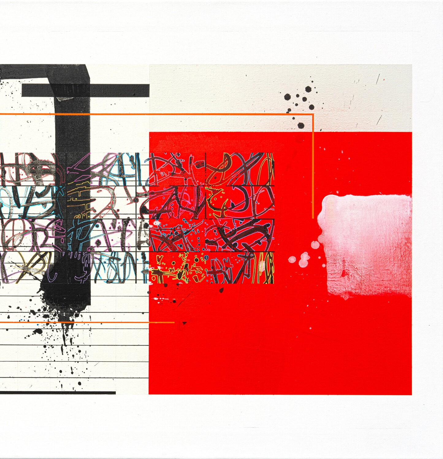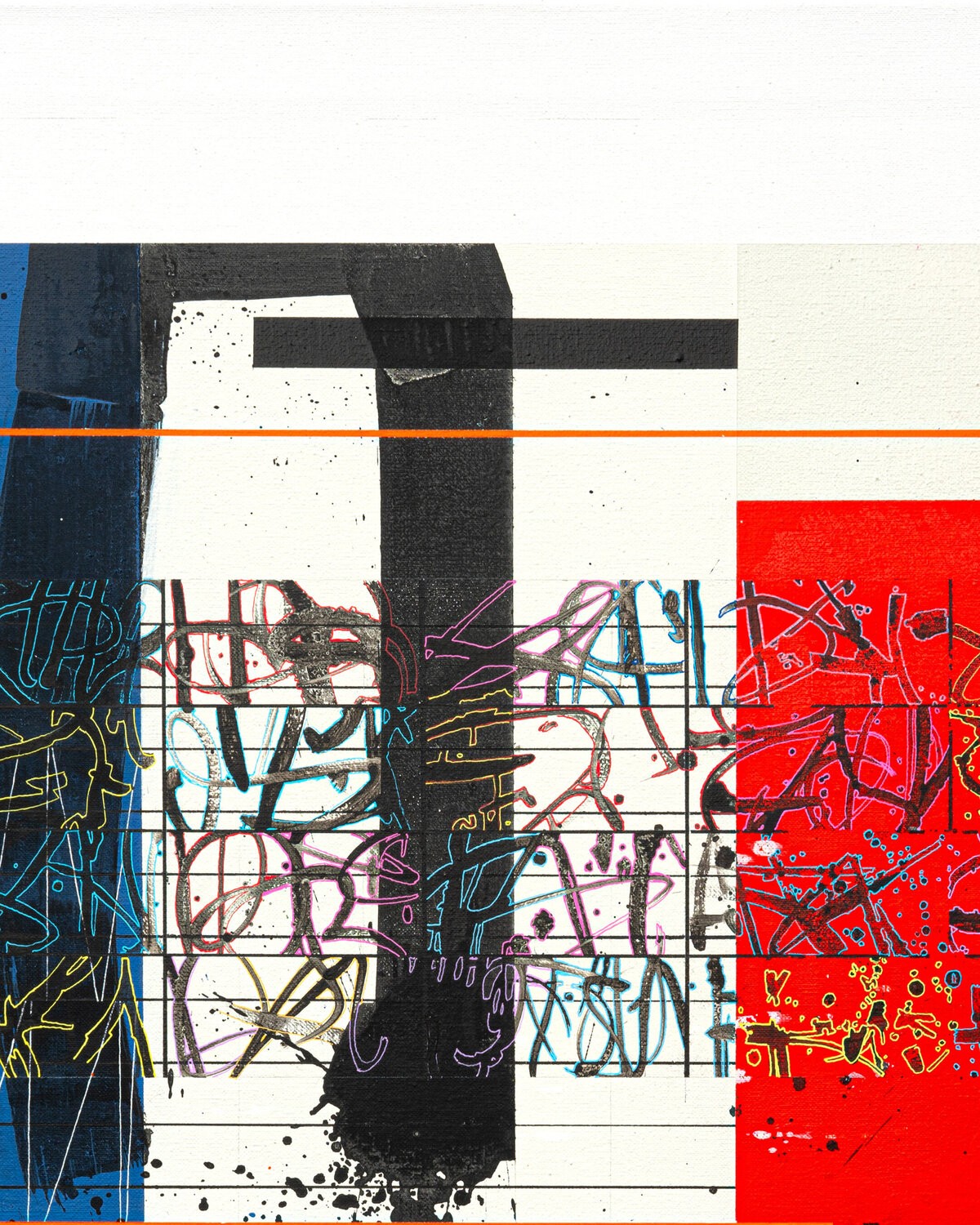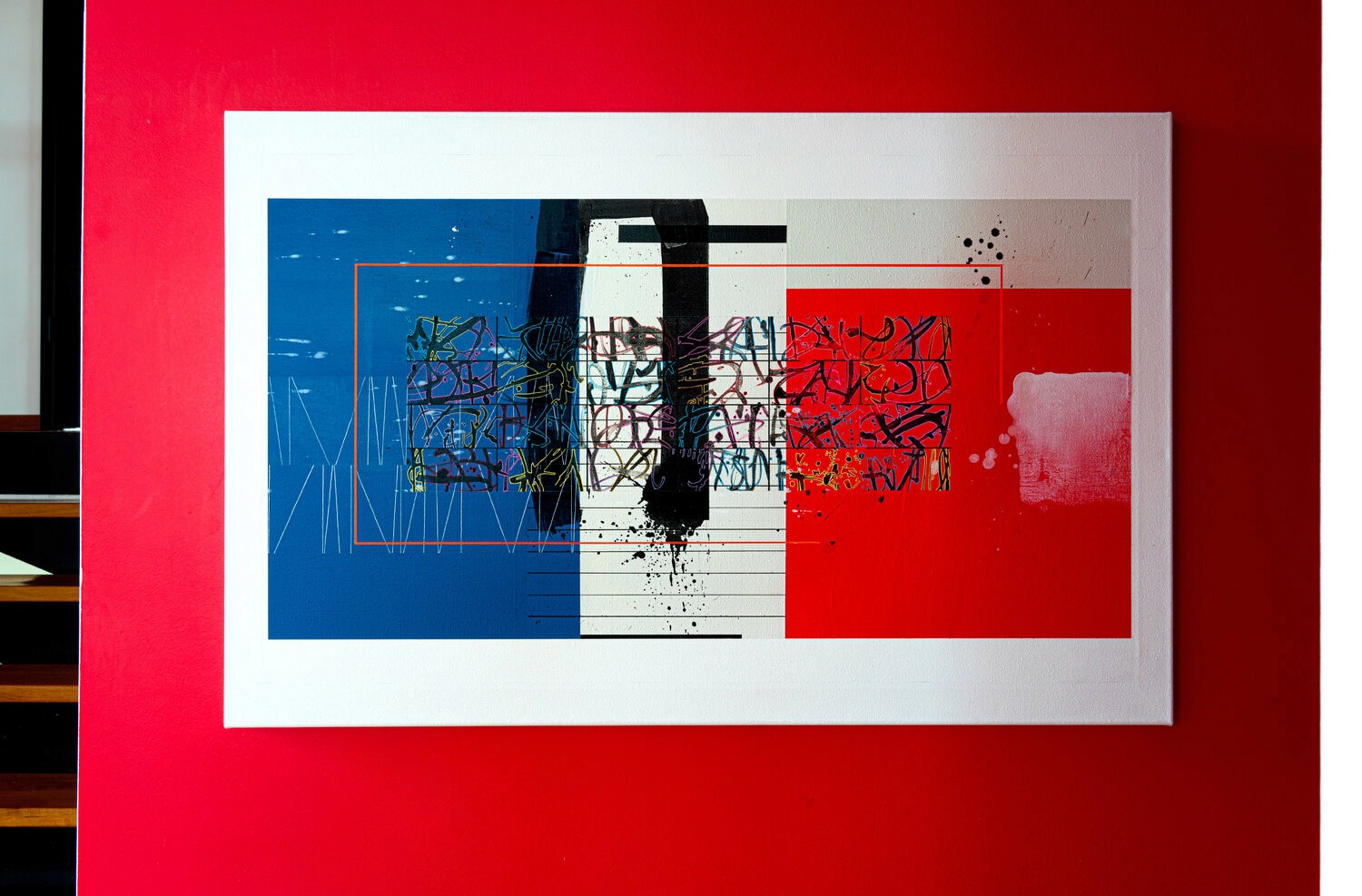 The geometric composition features elements that appear to "explode" out of the frames; expressing the tension between order and disorder; a central theme in free jazz.