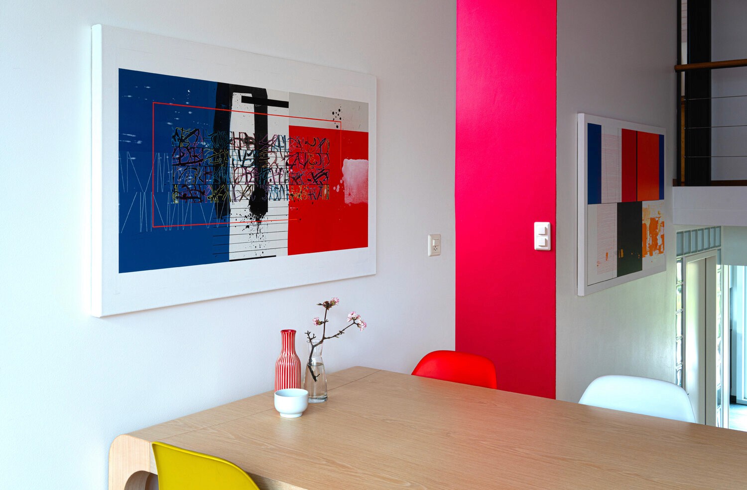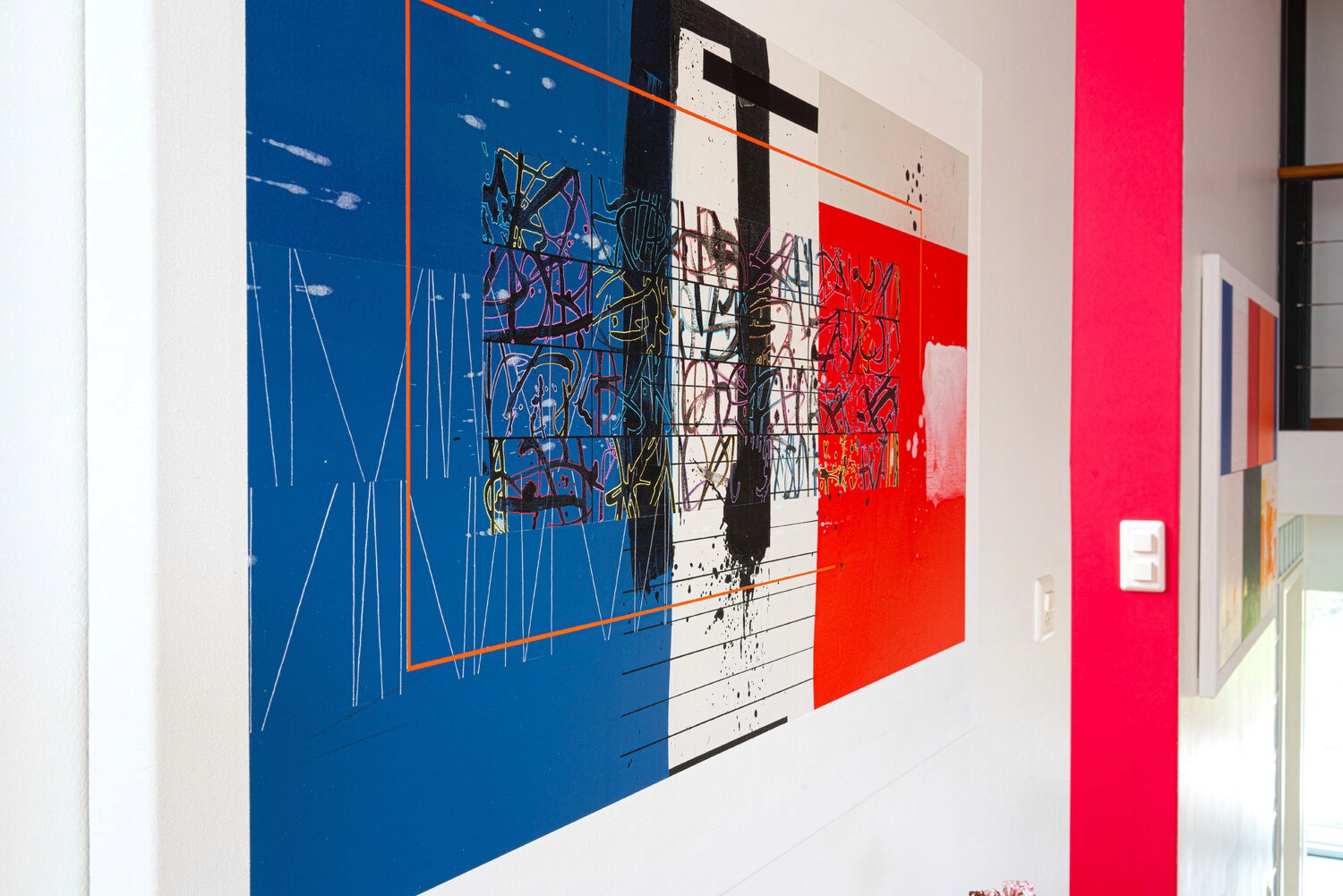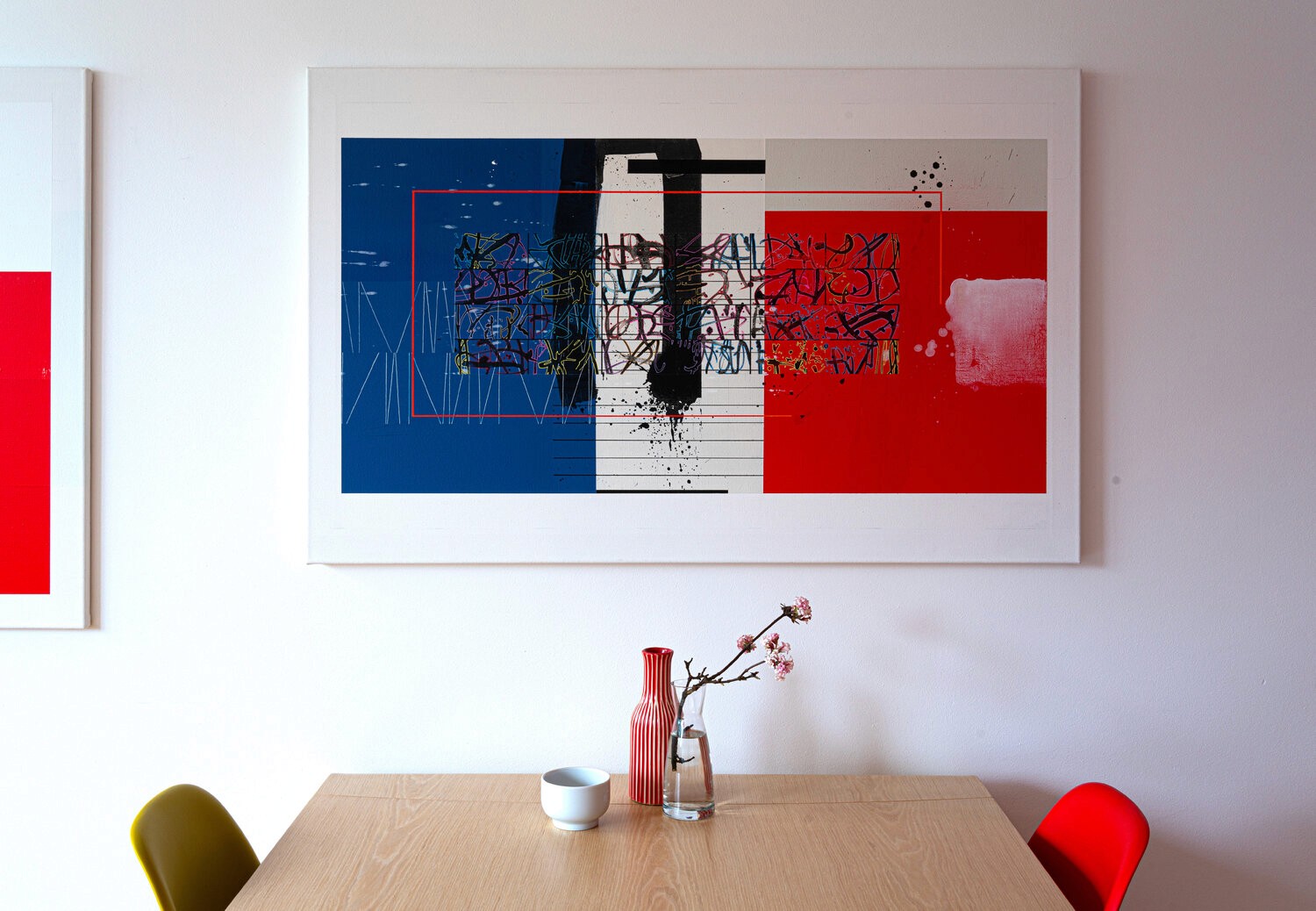 The geometric composition features elements that appear to "explode" out of the frames; expressing the tension between order and disorder; a central theme in free jazz.