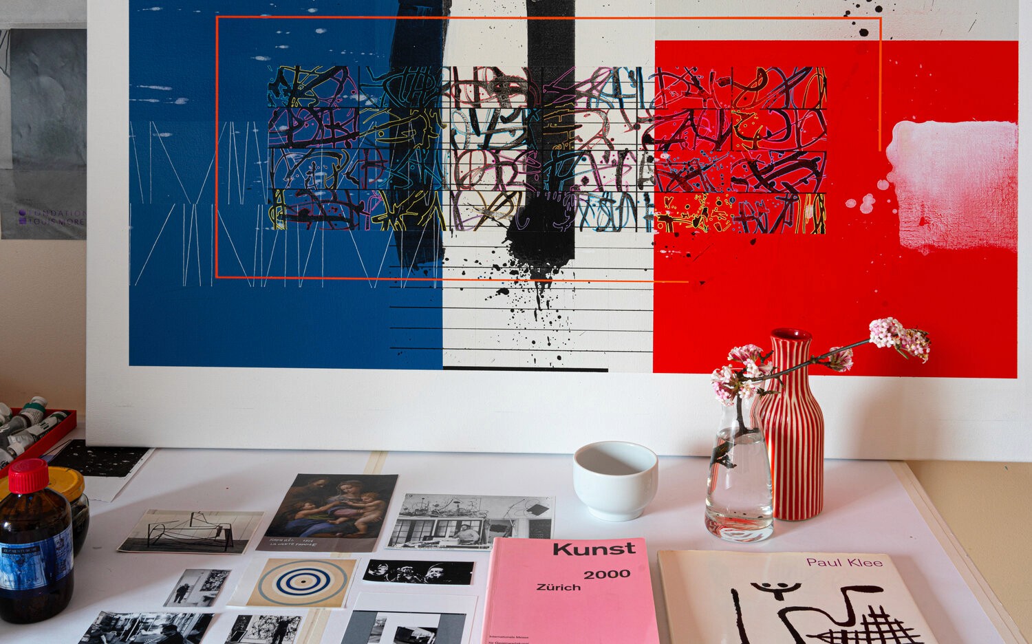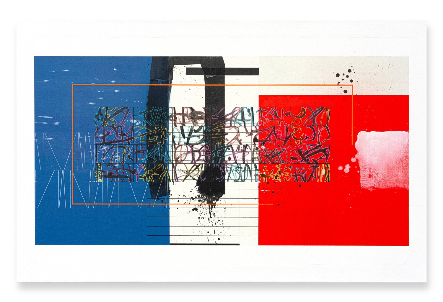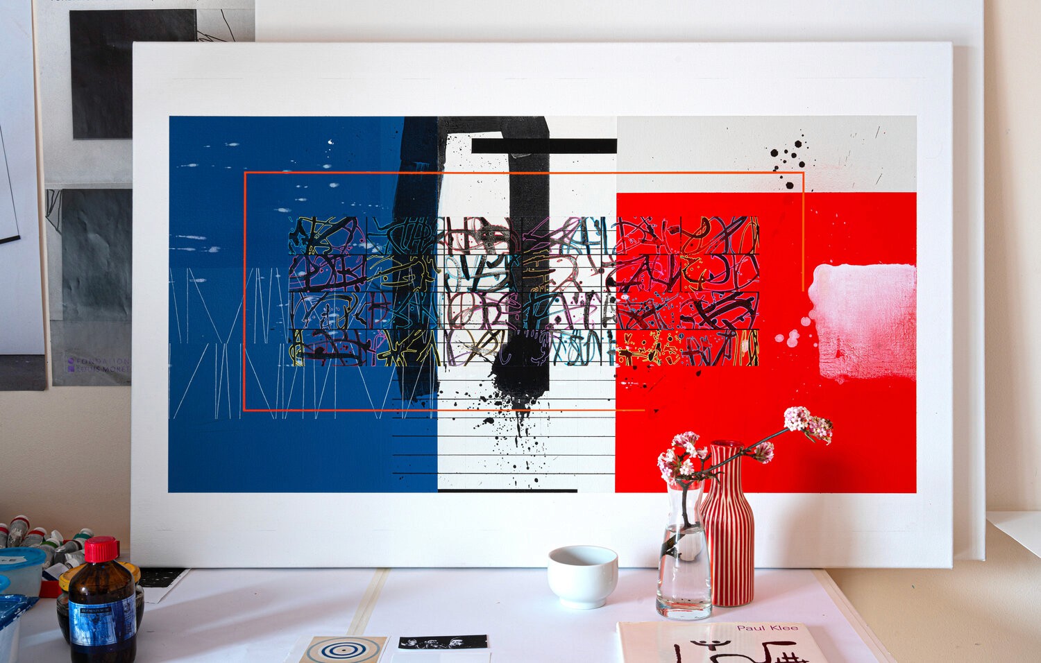 The abstract writing visible in the painting plays a key role in this analogy. The interlocking calligraphic lines and shapes recall improvisations where each musician freely explores sound patterns while remaining connected to the ensemble.