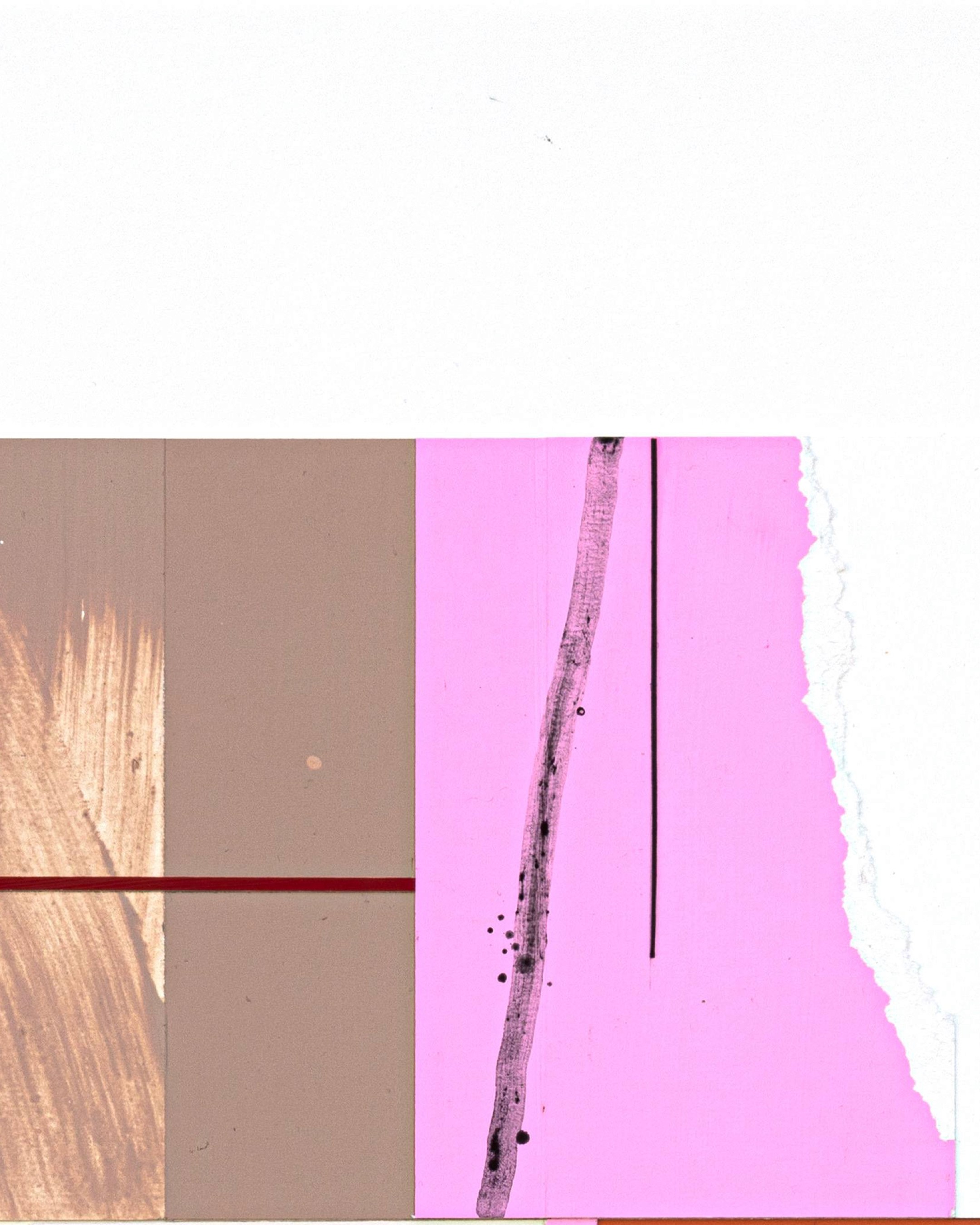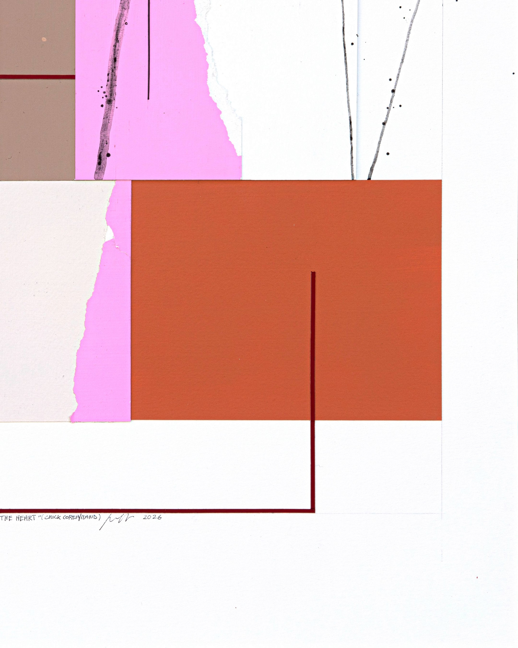 Chick Corea's Hymn Of The Heart is a piece based on a constant tension between form and improvisation—a clear, almost liturgical melody punctuated by unexpected harmonic flourishes. My work evokes this duality: the burgundy rectangle imposes an architecture, a formal rigor, but the torn edges of pink, the splashes of brown, and the spontaneous strokes constantly overflow it. The structure is there, but it holds nothing back.
