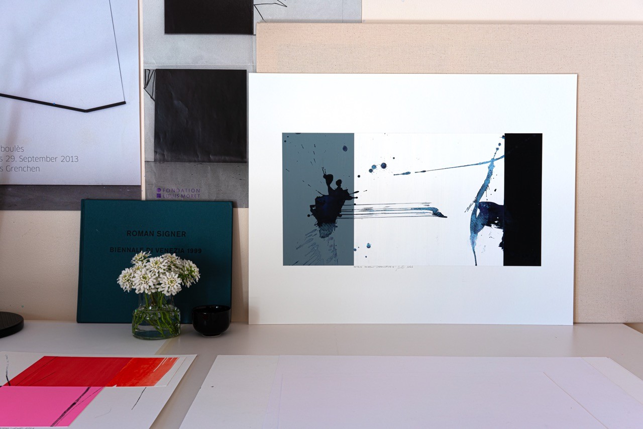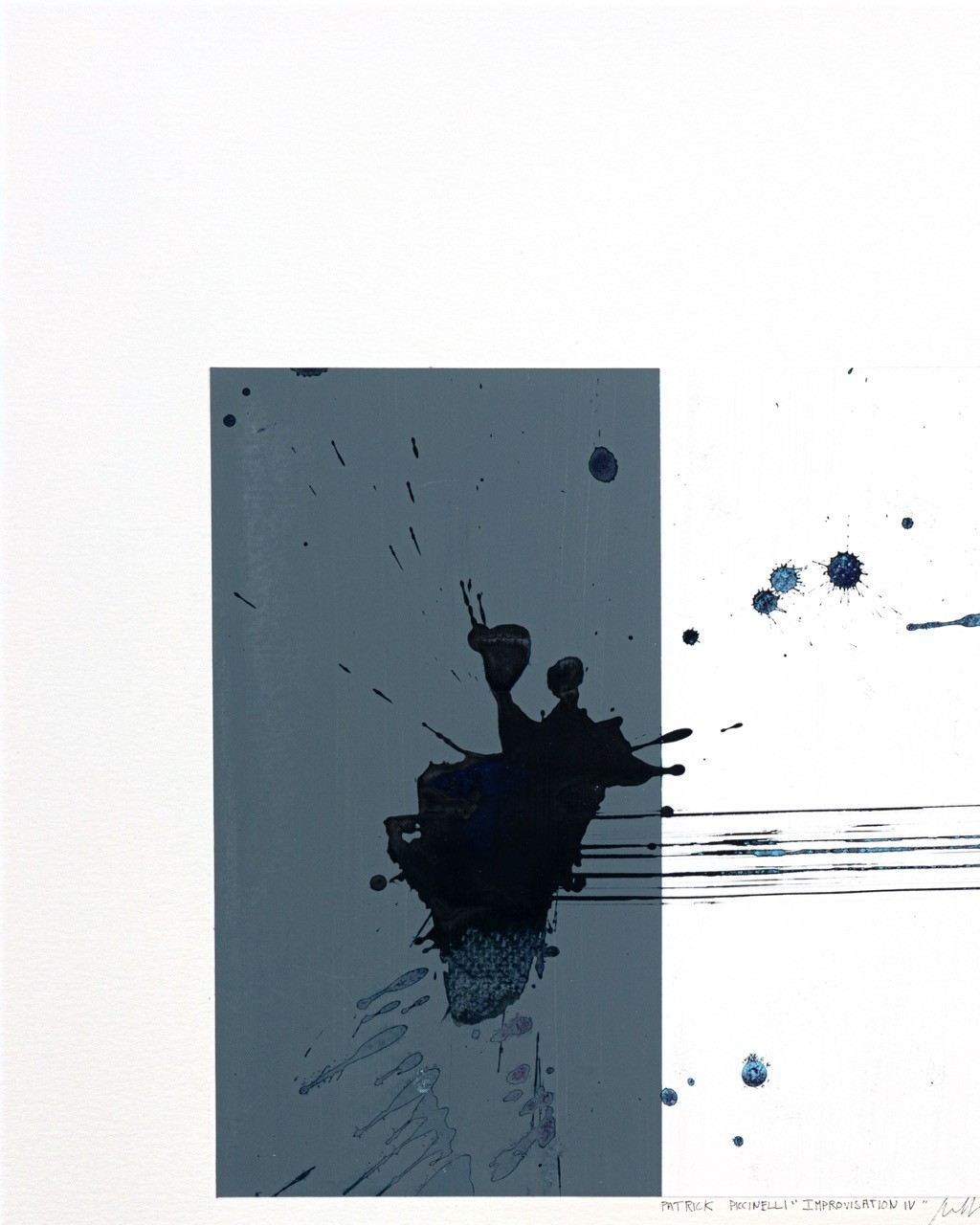 My approach can be defined in explicitly musical terms: I am interested in the visual dialogue between structure and chance, a field explored by jazz musicians who improvise within a melody. In "Improvisation IV," the rectangles are the harmonic grid; the splashes, traces, drips, and splatters are the improvised solo.