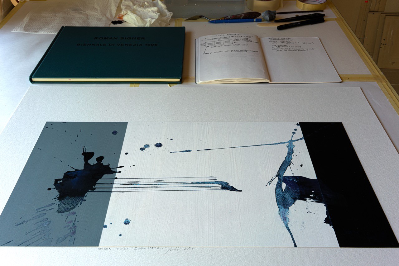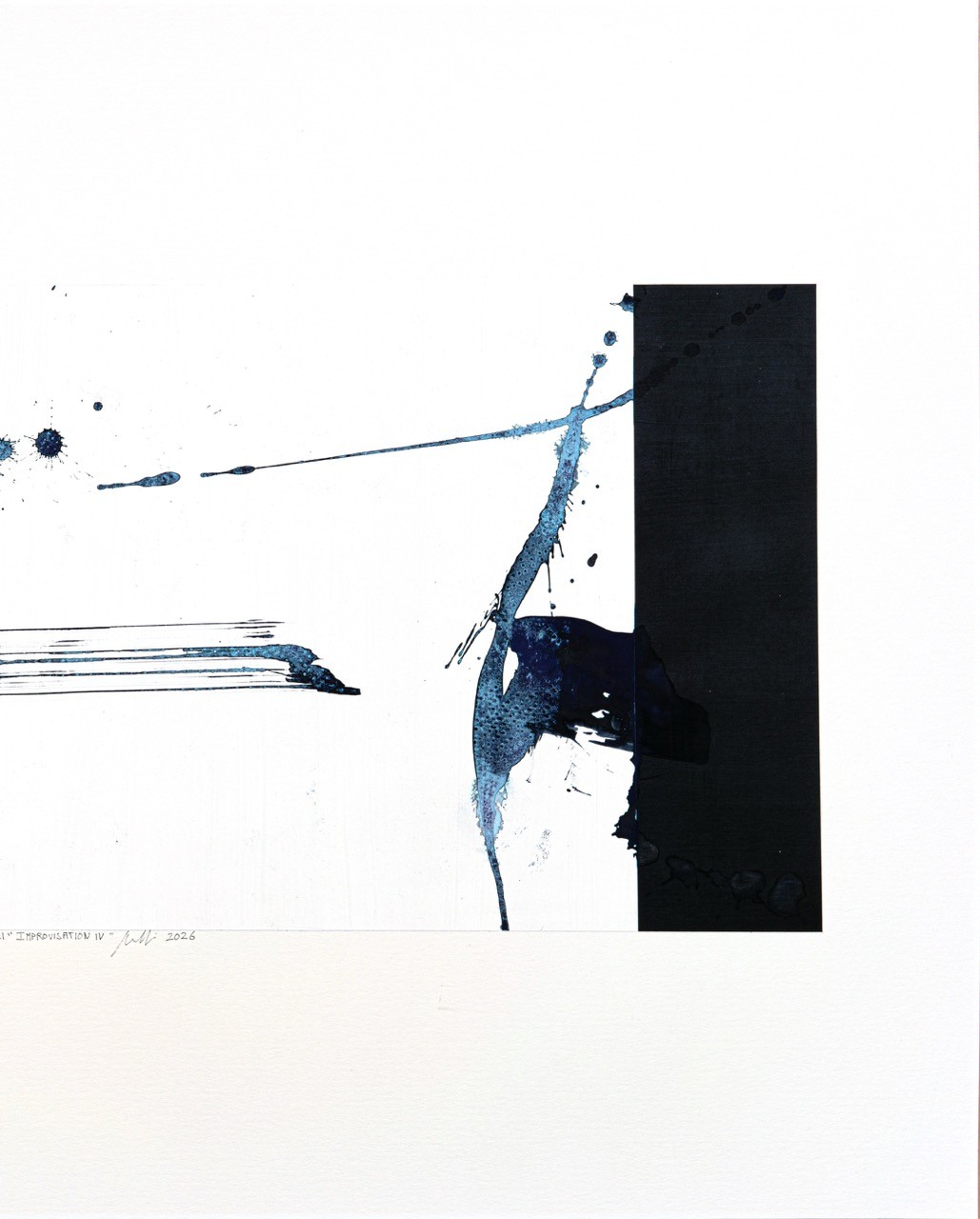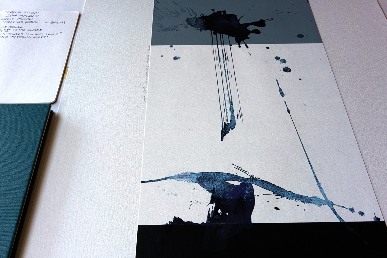 The lines that emerge from the black splash cannot be repeated—they were drawn in a single gesture. Similarly, Kikuchi always resisted closure; he preferred the question to the answer, the gesture to the statement, silence to the resolution. Both works reject repetition and explanation: they are, in their entirety, a single gesture. My work on paper, "Improvisation IV," and Kikuchi's Improvisation IV share the same ethic of the moment: accepting that beauty arises from rupture, that structure is not a prison but an invitation, and that improvisation is not the absence of form—but its most honest form. I paint what Masabumi plays: an unstable, luminous, never-resolved equilibrium.