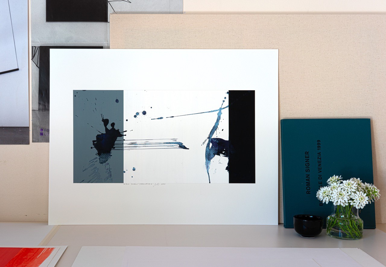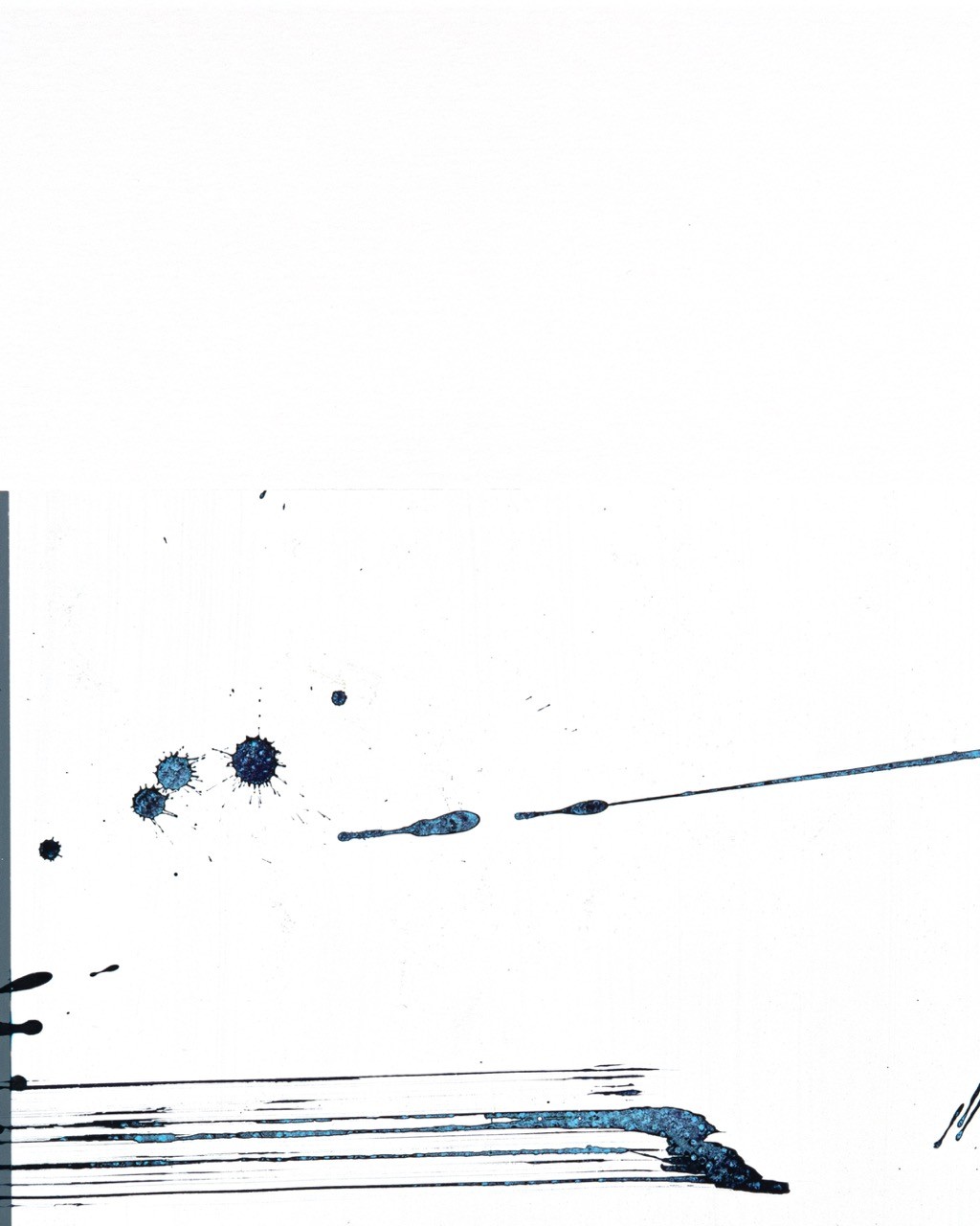 In the center, the white of the paper reigns supreme—empty space, suspension, breath. Splashes of midnight blue wander there, isolated, and a thin, swift horizontal line cuts through the air like an arrow or a conductor's baton.