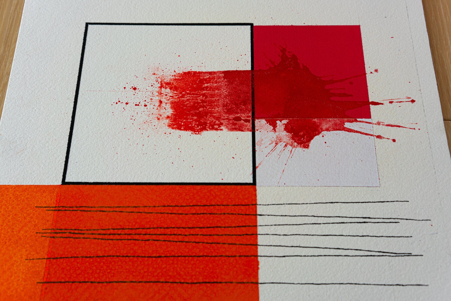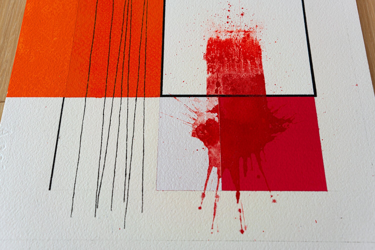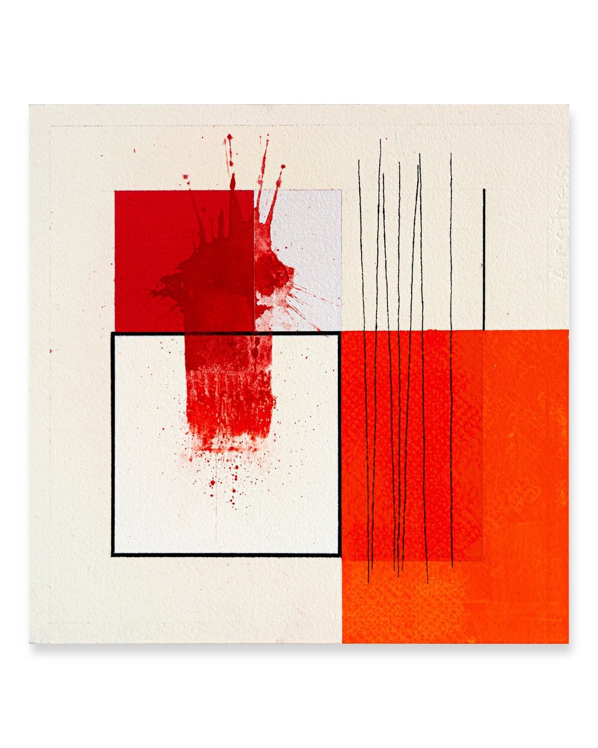 Work on paper; painting on Arches paper: 26X26 cm; glued on Fabriano paper 250gr/m2 in format 50X50 cm.For Piccinelli; the swimming pool represents a metaphor linked to his visual research. He is passionate about creating a visual dialogue between a rigorous and minimal geometric structure with random expressionist elements. The pool is a precise colored shape (often a blue rectangle). The reading of this rectangle is disturbed by the undulations of the water or a dive generating waves and splashes."As minimalist as it is; the composition of A Bigger Splash has been meticulously thought out. This geometry in the forms almost brings us closer to a Mondrian canvas; without falling into total abstraction."