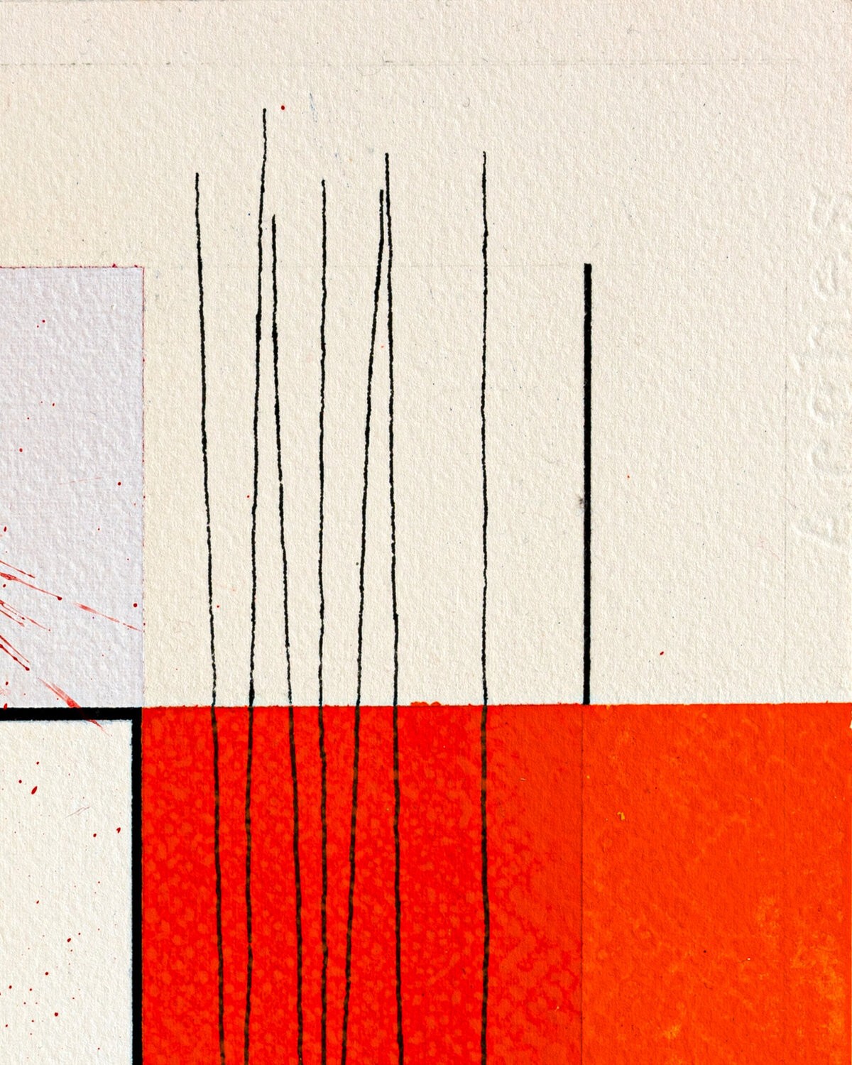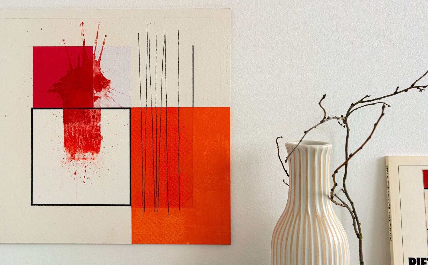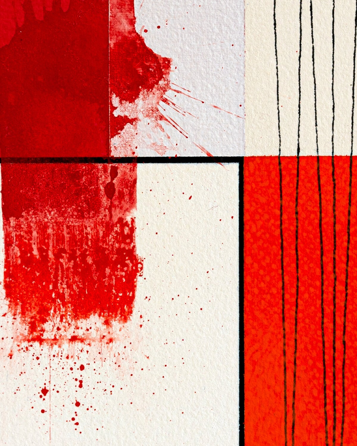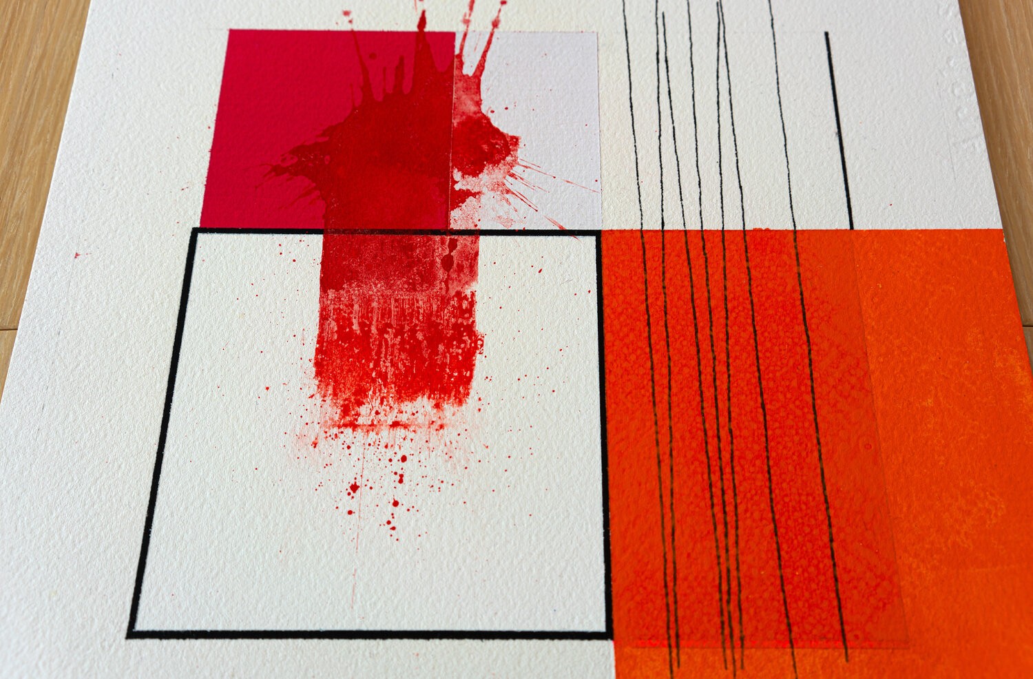 Work on paper; painting on Arches paper: 26X26 cm; glued on Fabriano paper 250gr/m2 in format 50X50 cm.For Piccinelli; the swimming pool represents a metaphor linked to his visual research. He is passionate about creating a visual dialogue between a rigorous and minimal geometric structure with random expressionist elements. The pool is a precise colored shape (often a blue rectangle). The reading of this rectangle is disturbed by the undulations of the water or a dive generating waves and splashes."As minimalist as it is; the composition of A Bigger Splash has been meticulously thought out. This geometry in the forms almost brings us closer to a Mondrian canvas; without falling into total abstraction."