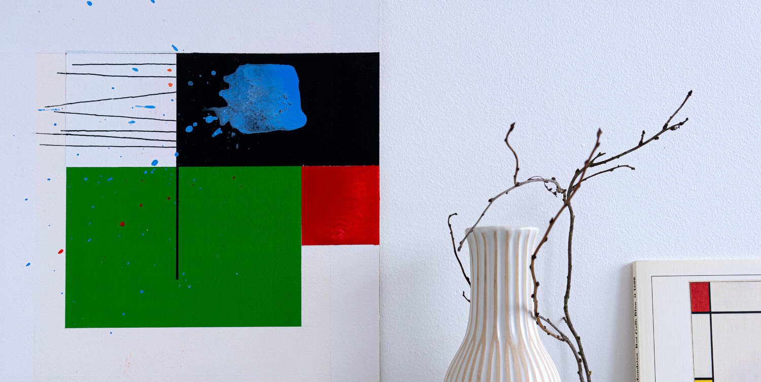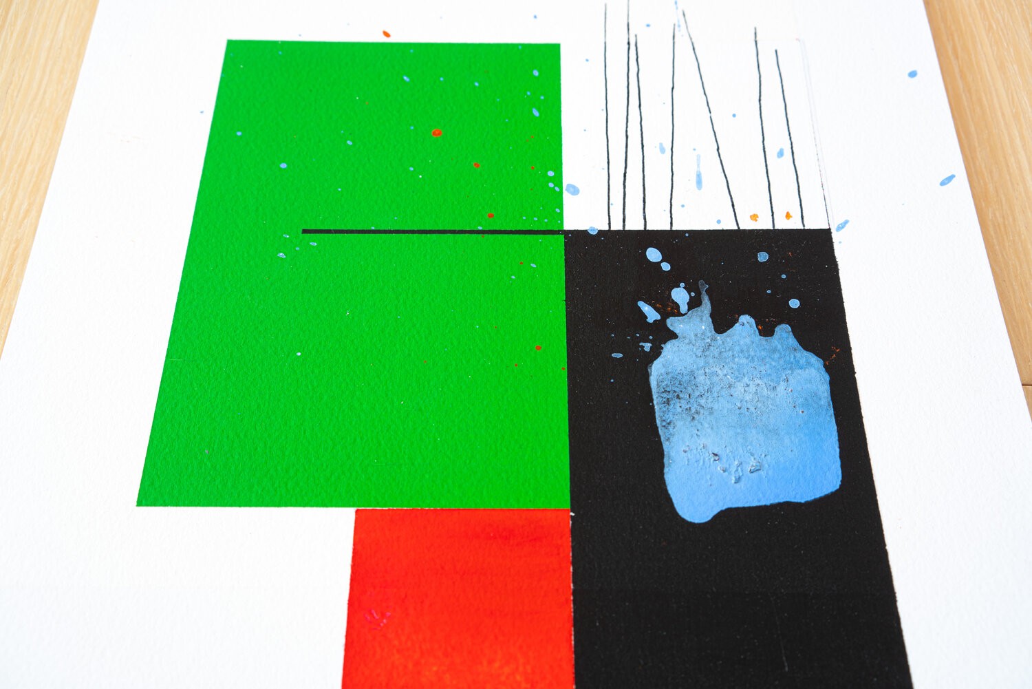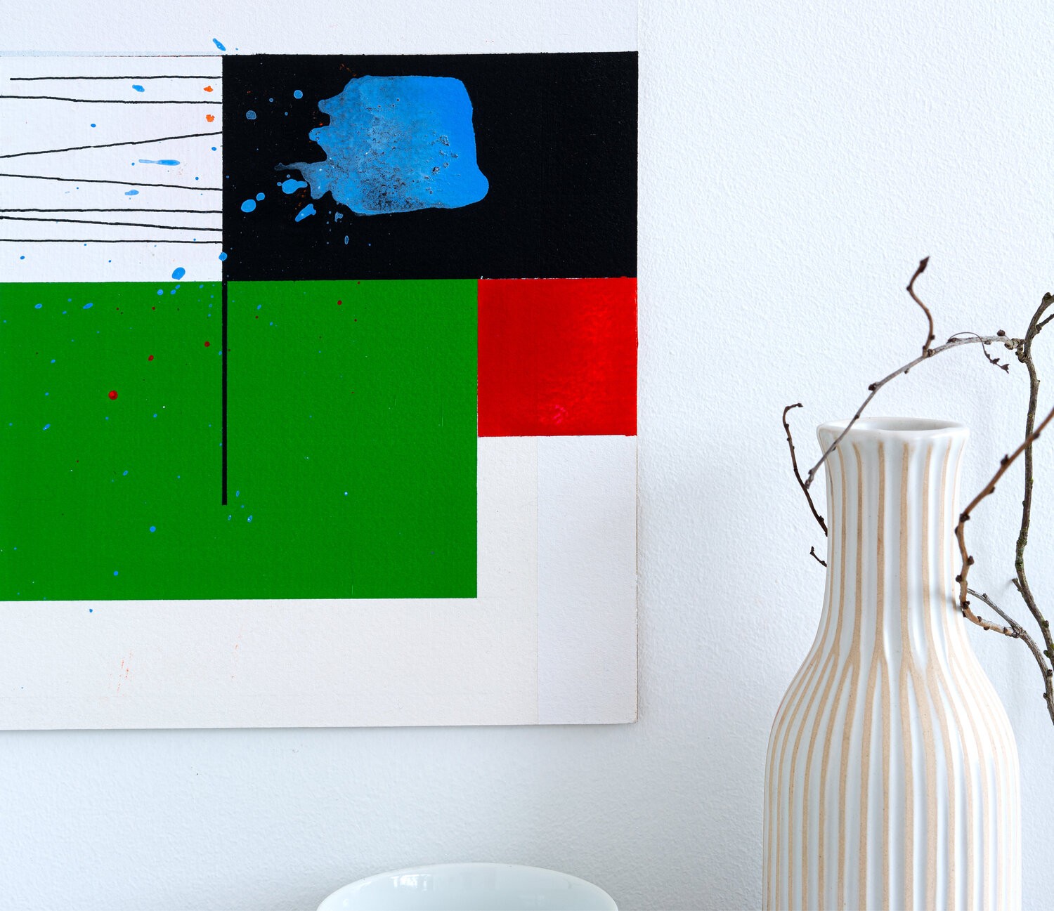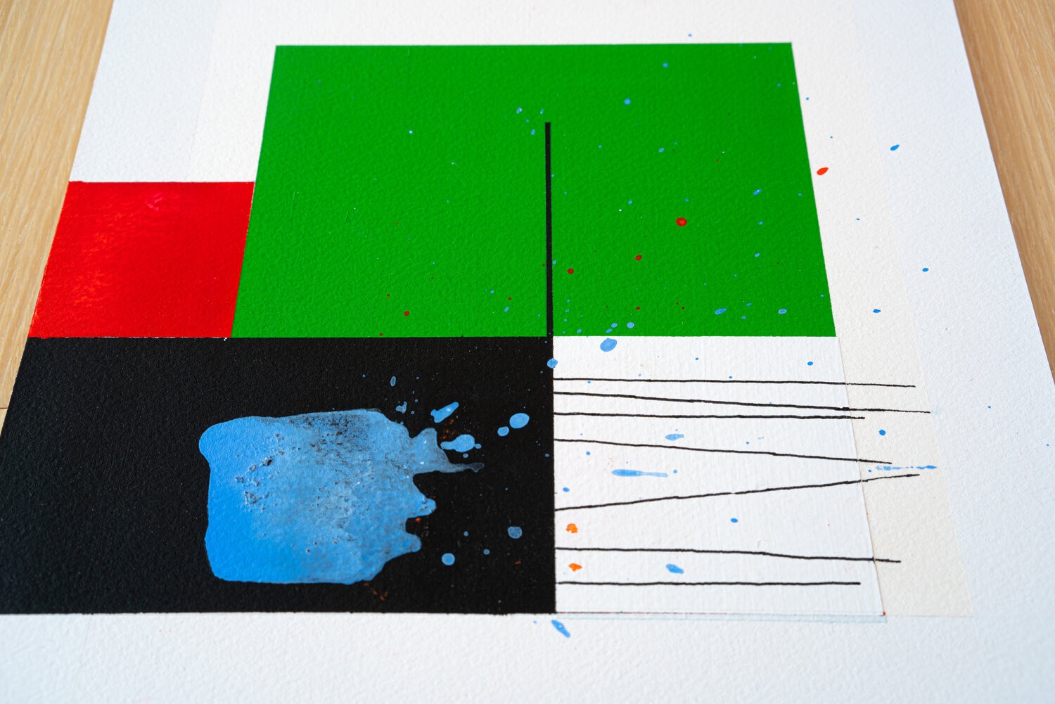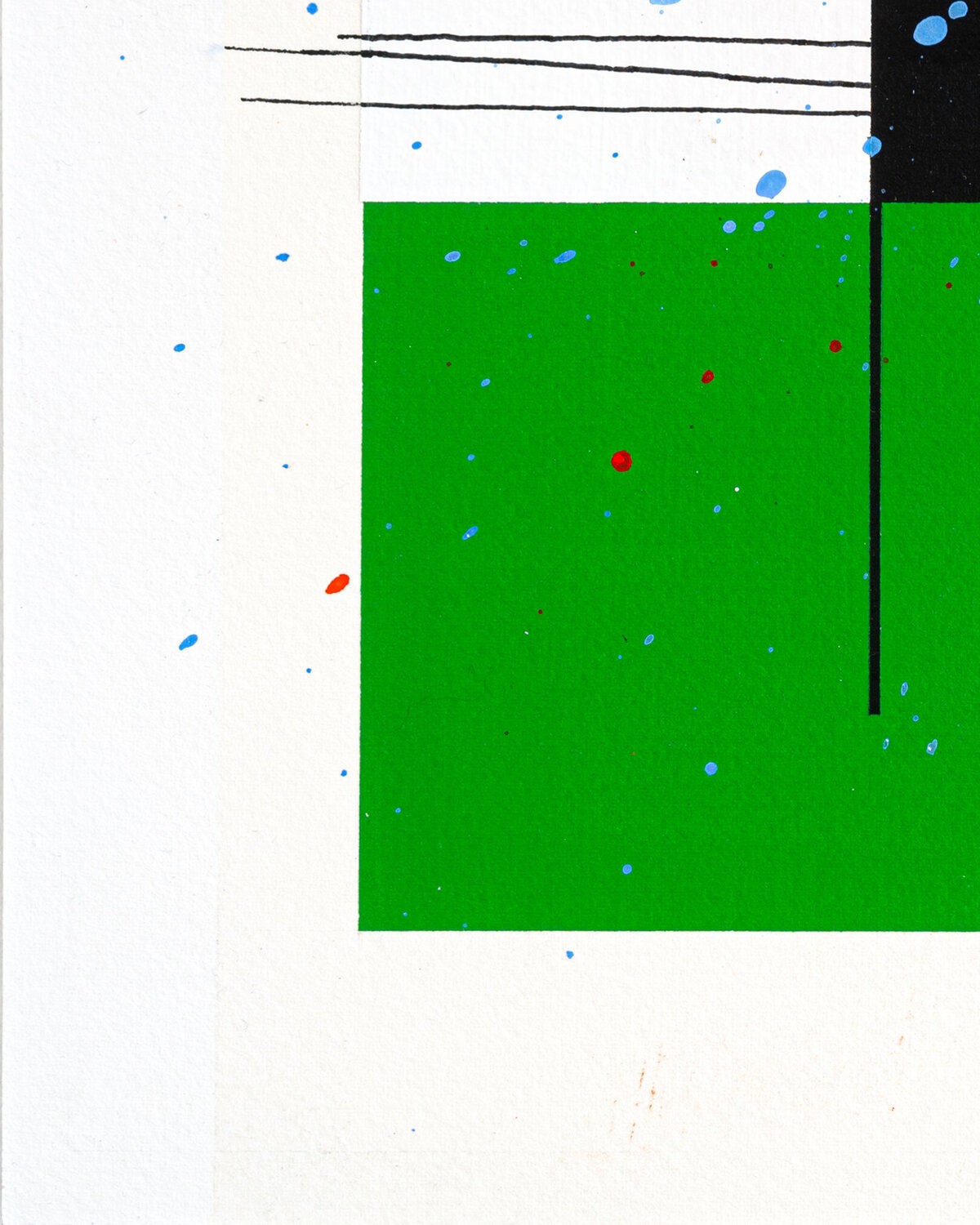 Work on paper; painting on Arches paper: 26X26 cm; glued on Fabriano paper 250gr/m2 in format 50X50 cm.MIlan is the Italian city close to the region where Patrick Piccinelli comes from; these are his Italian roots (even if he has lived all his life in Switzerland). The chromatic composition evokes the Italian flag.For Piccinelli; the swimming pool represents a metaphor linked to his visual research. He is passionate about creating a visual dialogue between a rigorous and minimal geometric structure with random expressionist elements. The pool is a precise colored shape (often a blue rectangle). The reading of this rectangle is disturbed by the undulations of the water or a dive generating waves and splashes.