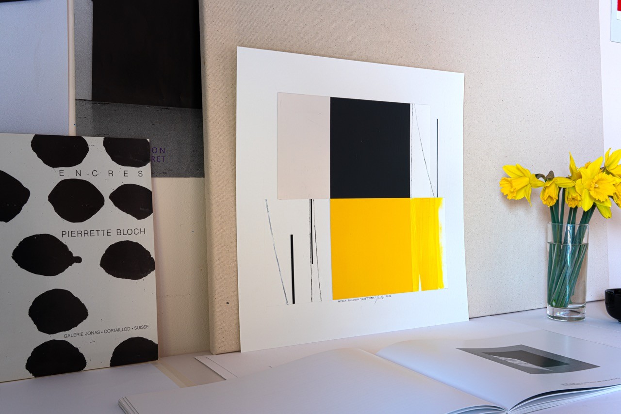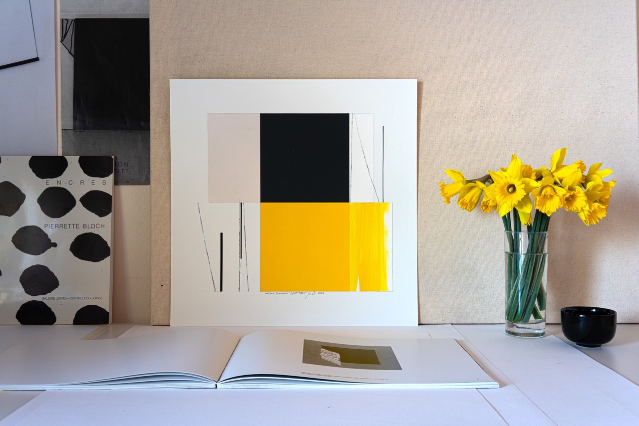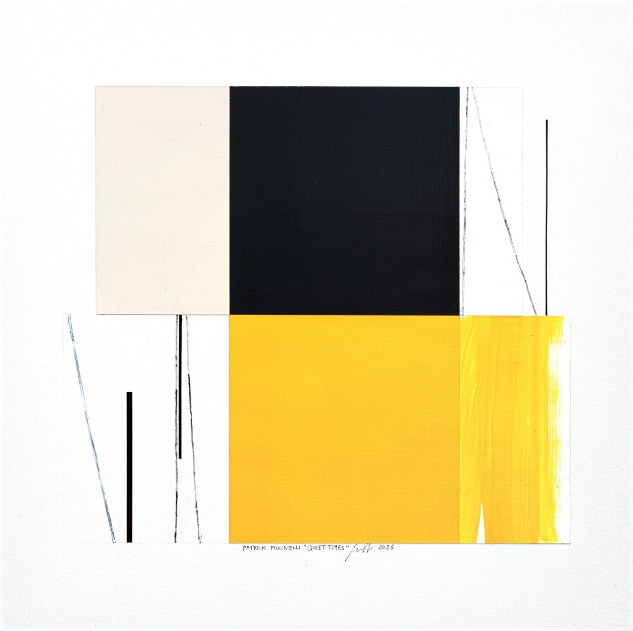 The piece uses only three colors: anthracite gray, off-white, and a vibrant sunny yellow. This mirrors the structure of the Third Plane trio: Ron Carter on double bass, Herbie Hancock on piano, and Tony Williams on drums. Three voices, nothing more. No frills.