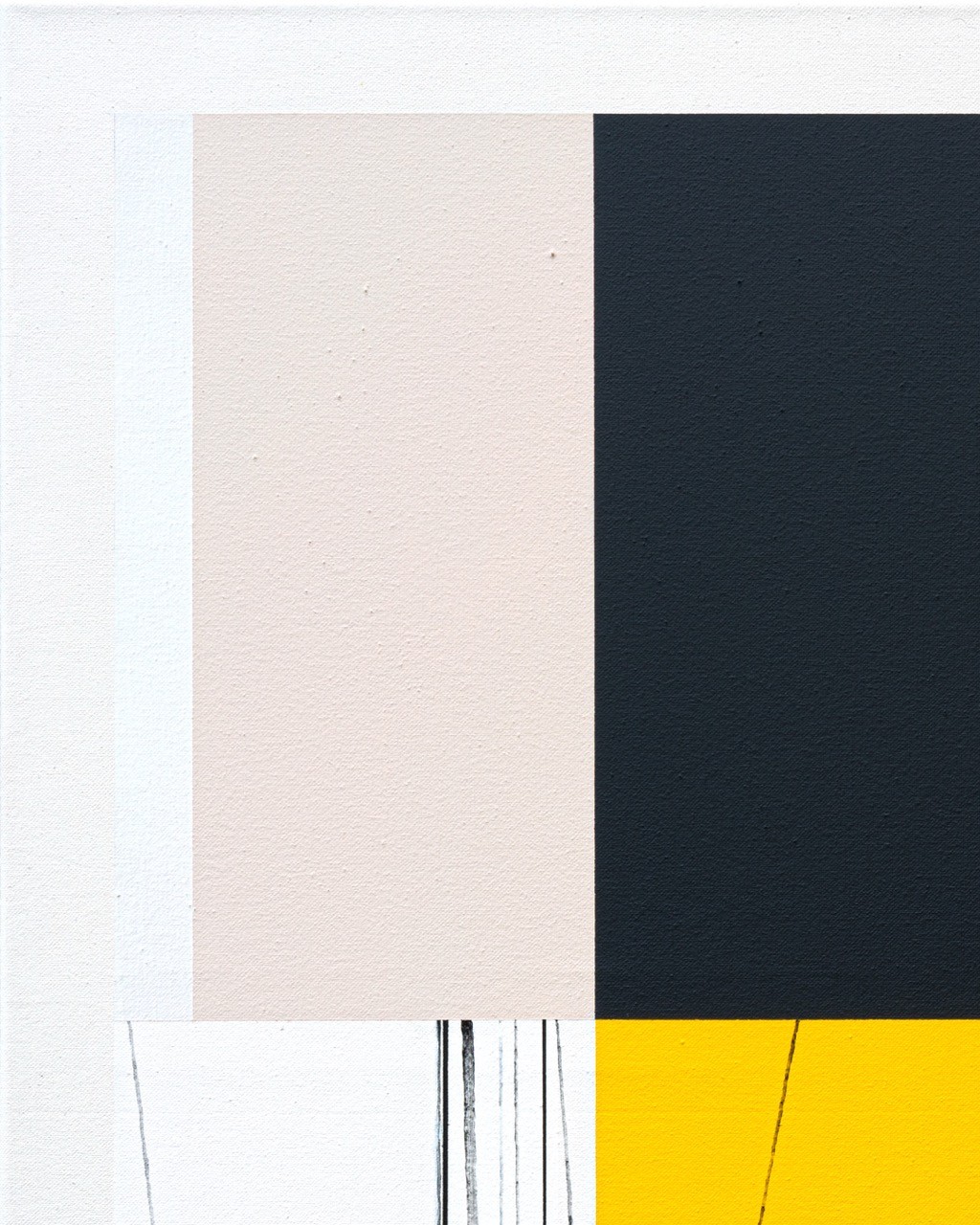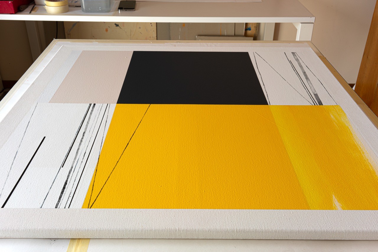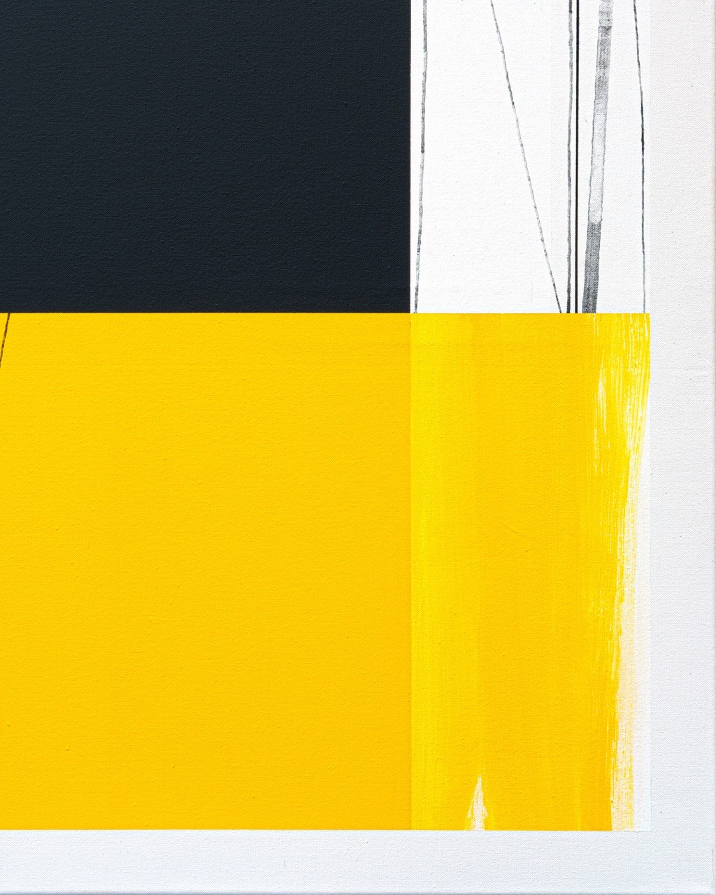 This painting uses only three colors: black, off-white, and a vibrant sunny yellow. This mirrors the approach of the Third Plane trio: Ron Carter on double bass, Herbie Hancock on piano, and Tony Williams on drums. Three voices, nothing more. No frills. Each element occupies its space with a quiet authority.