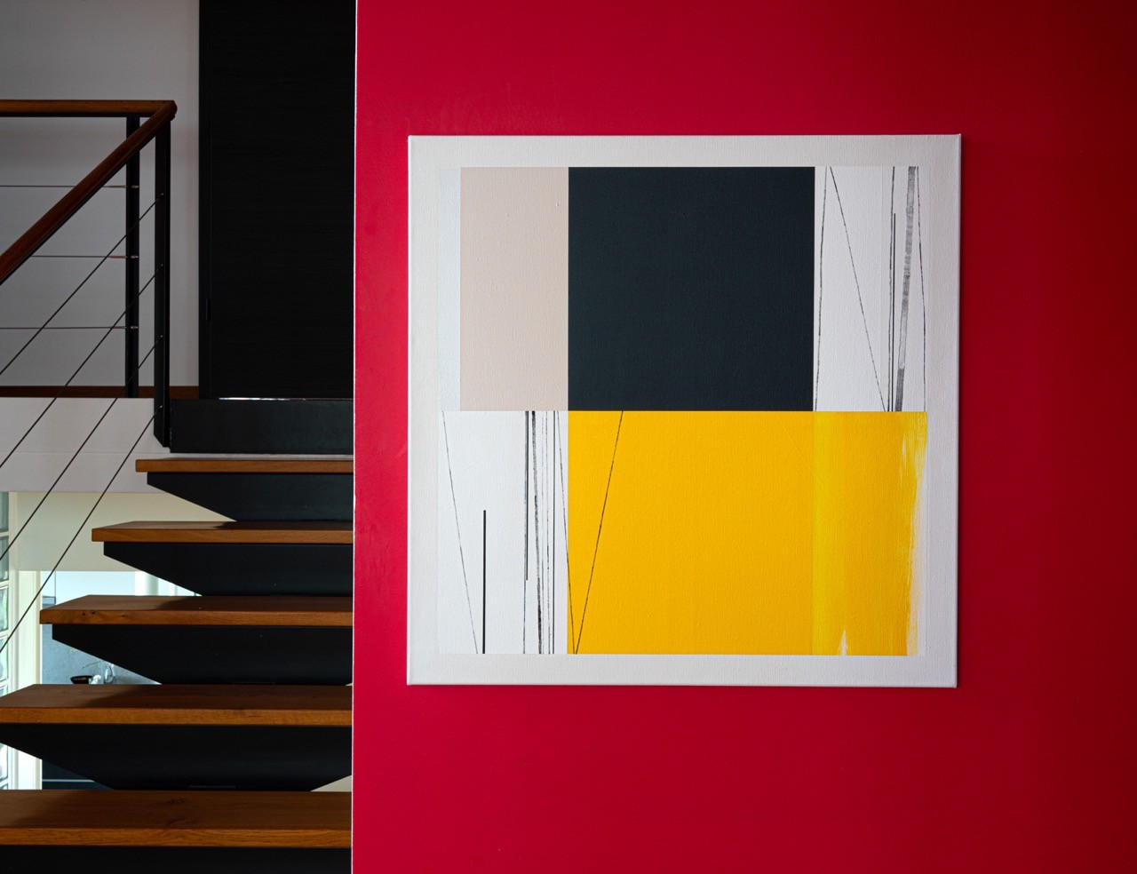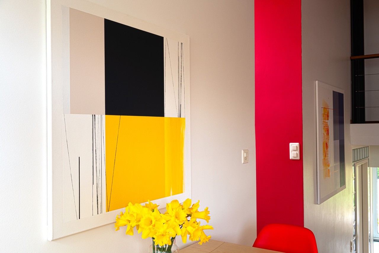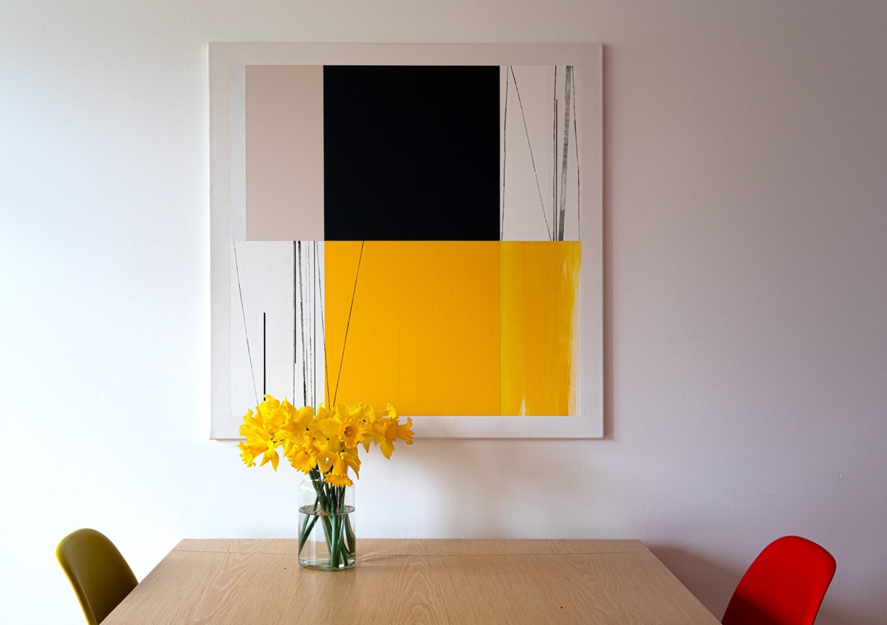 This painting uses only three colors: black, off-white, and a vibrant sunny yellow. This mirrors the approach of the Third Plane trio: Ron Carter on double bass, Herbie Hancock on piano, and Tony Williams on drums. Three voices, nothing more. No frills. Each element occupies its space with a quiet authority.