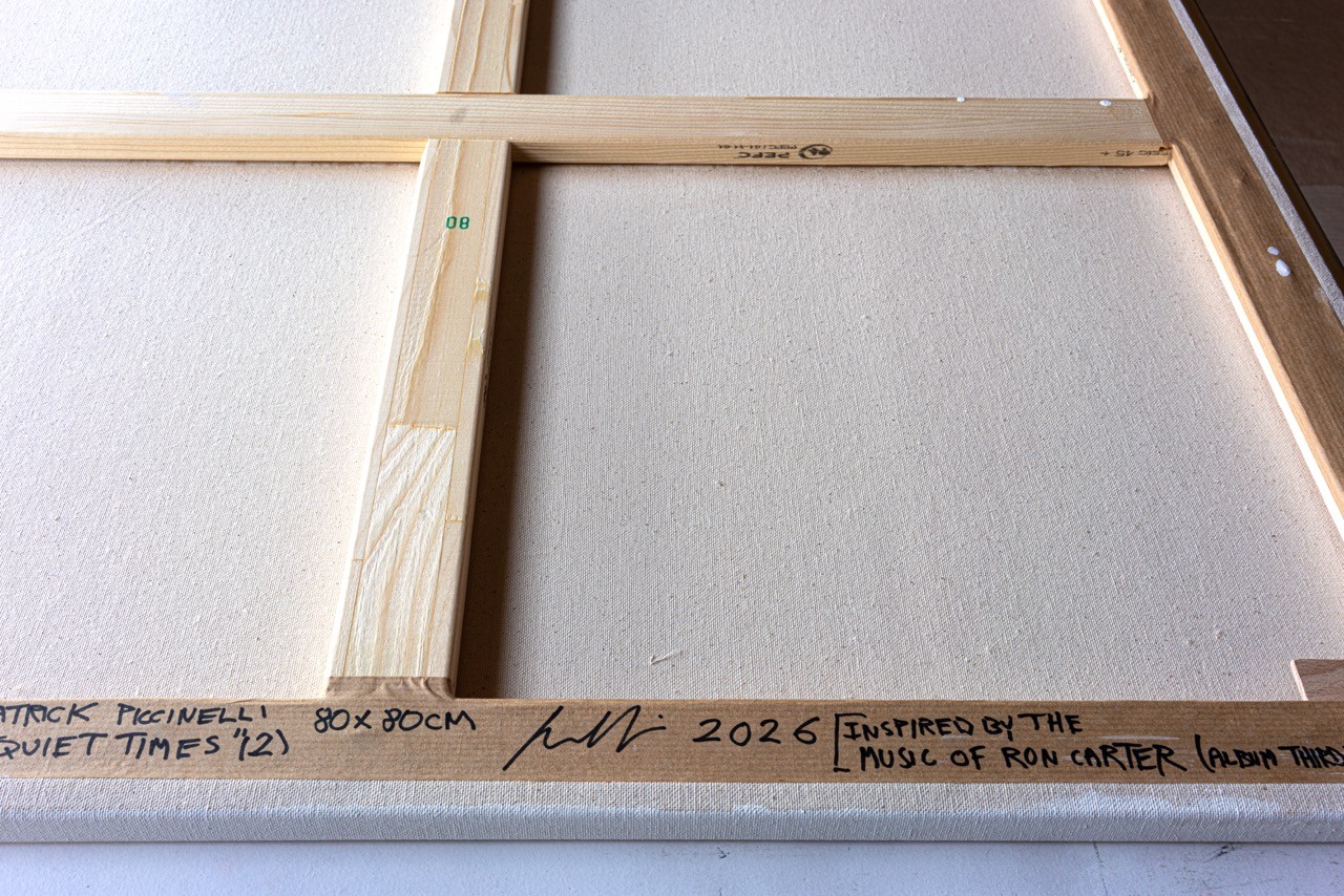 The blocks of color are clearly defined, but the edges of the yellow in the lower right reveal the painter’s touch—the visible brushstroke that bleeds slightly. The Penguin Guide to Jazz hails the album as “Carter’s most impressive performance under his own name.” This tension between formal rigor and spontaneous momentum is precisely what we see in the painting: the geometry holds, but the painter’s hand remains present.