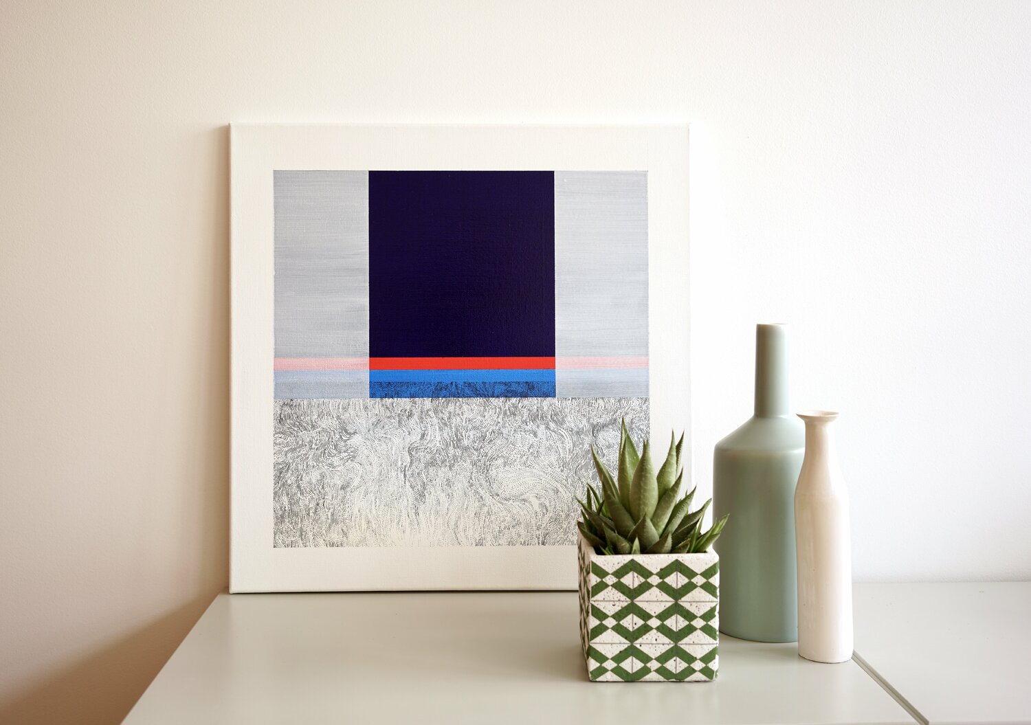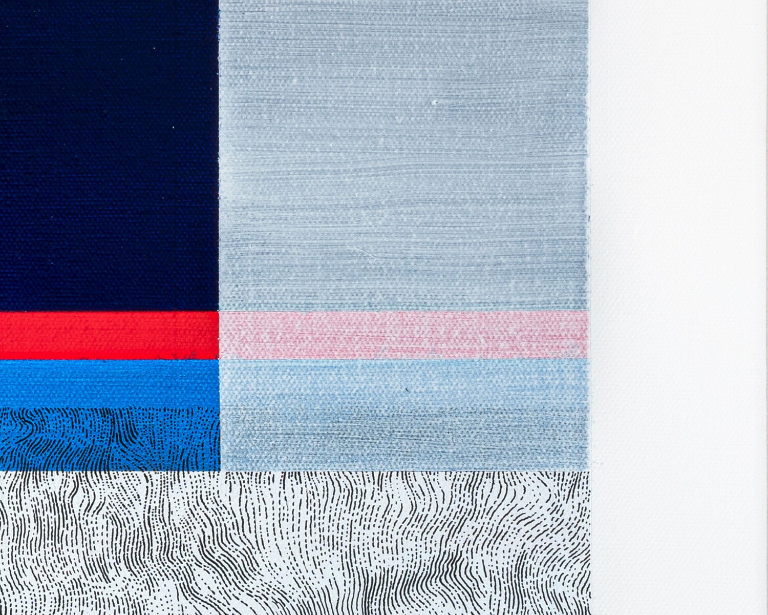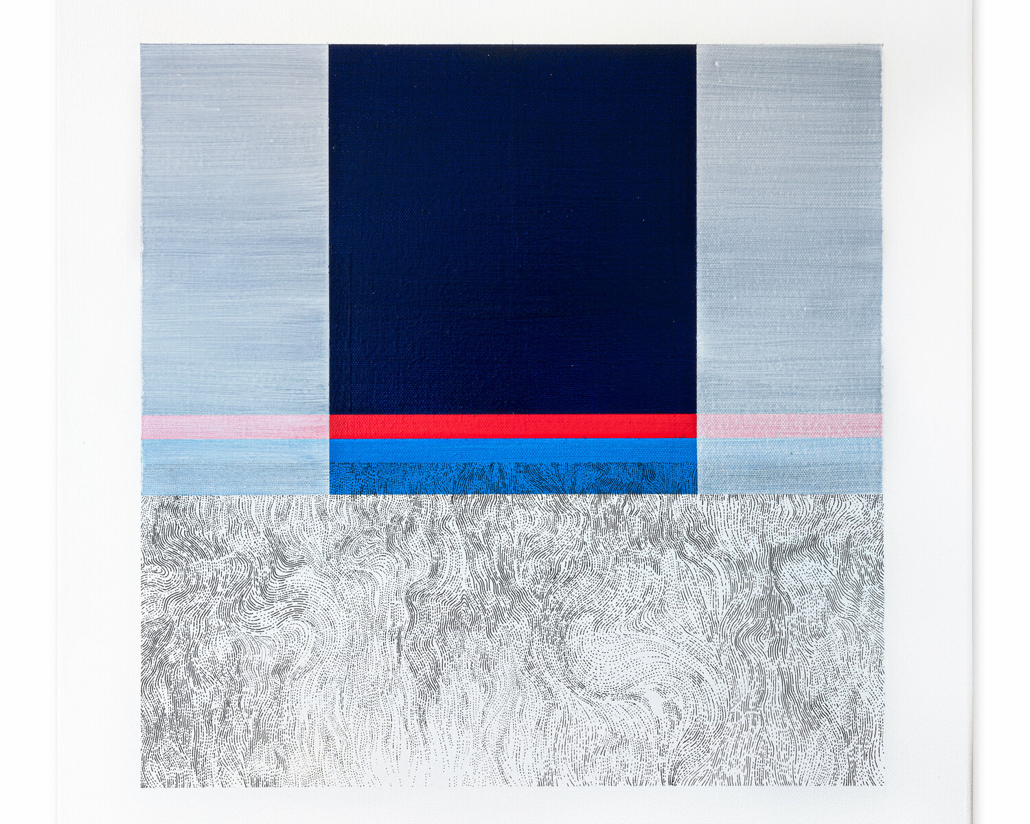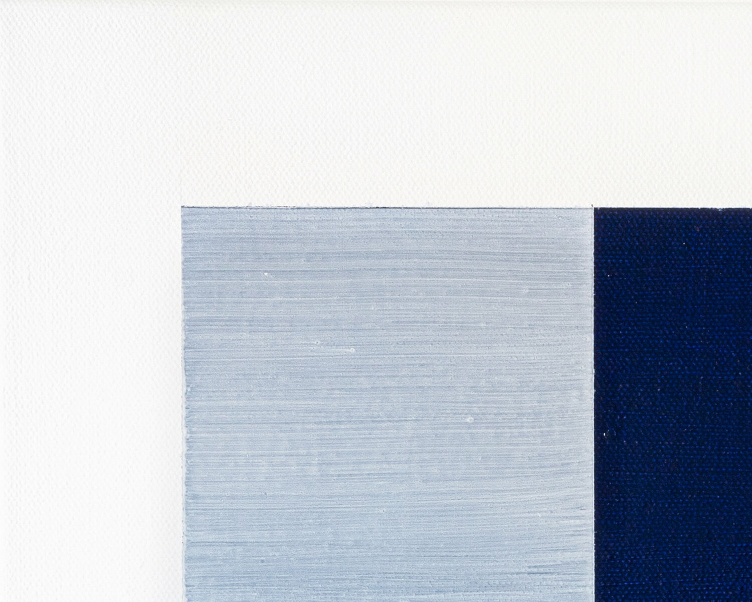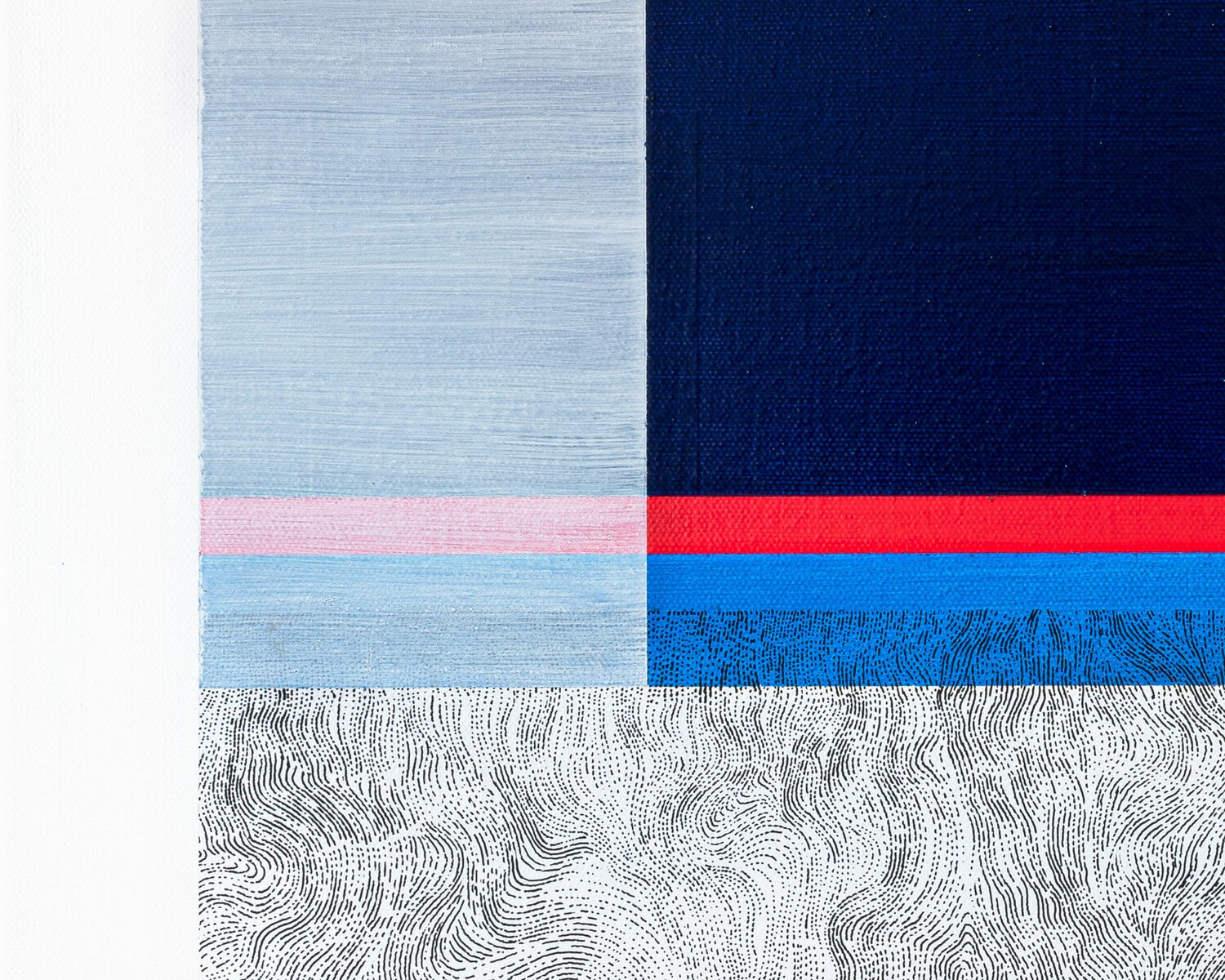 Blanc de titane; bleu de prusse; bleu de cobalt; bleu indigo; rouge de cadmium clair; paintmarker noir.