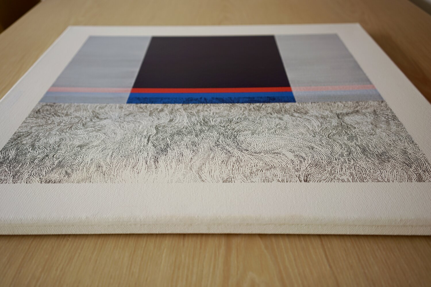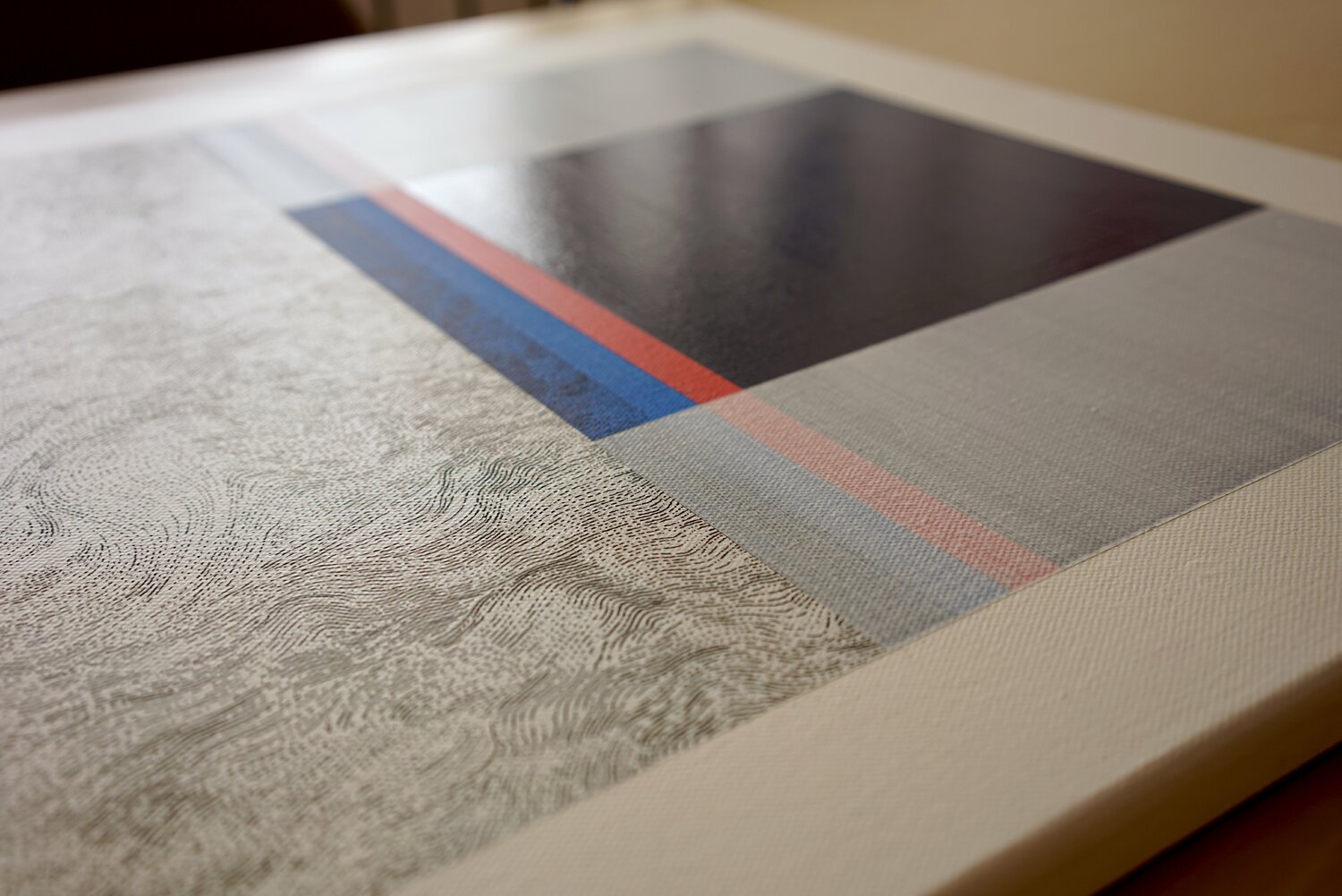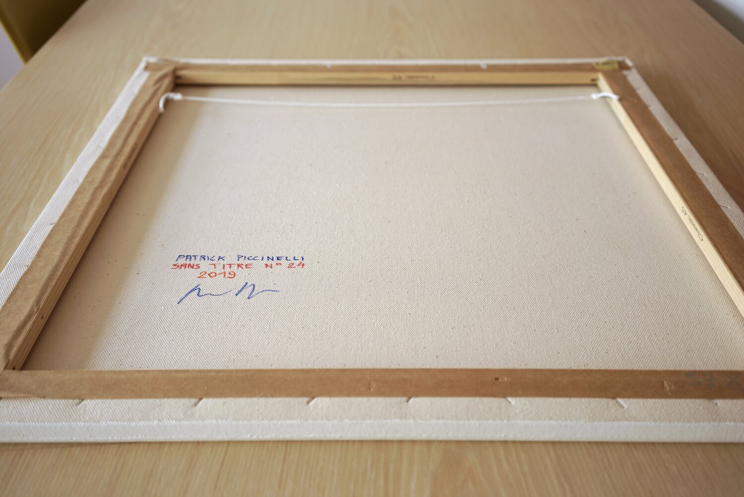 Dans la zone colorée; le peintre a recouvert à gauche et à droite le bleu indigo; le rouge et le bleu cyan avec une couche de blanc de titane adoucissant ainsi la composition géométrique tout en la laissant apparaître.