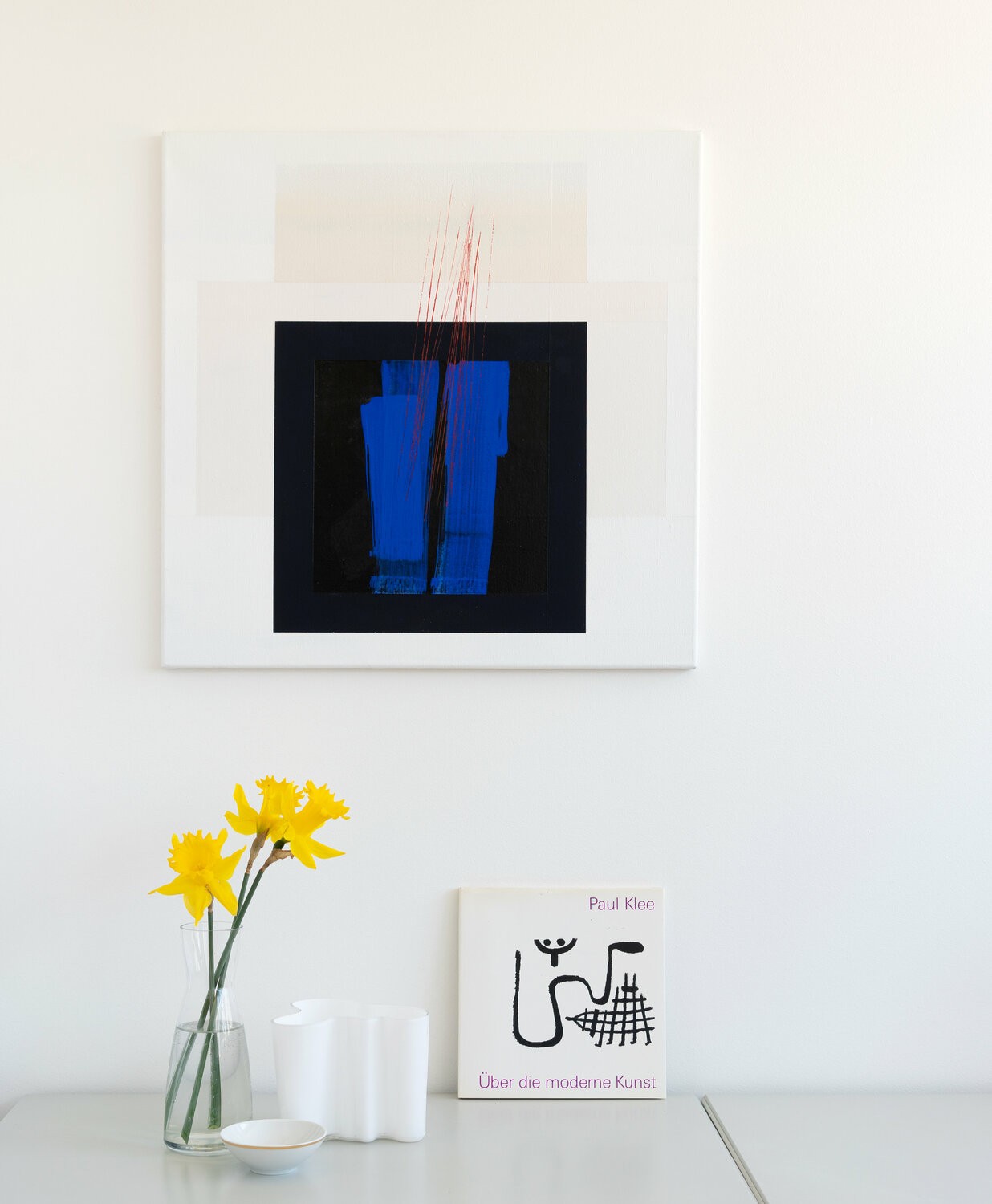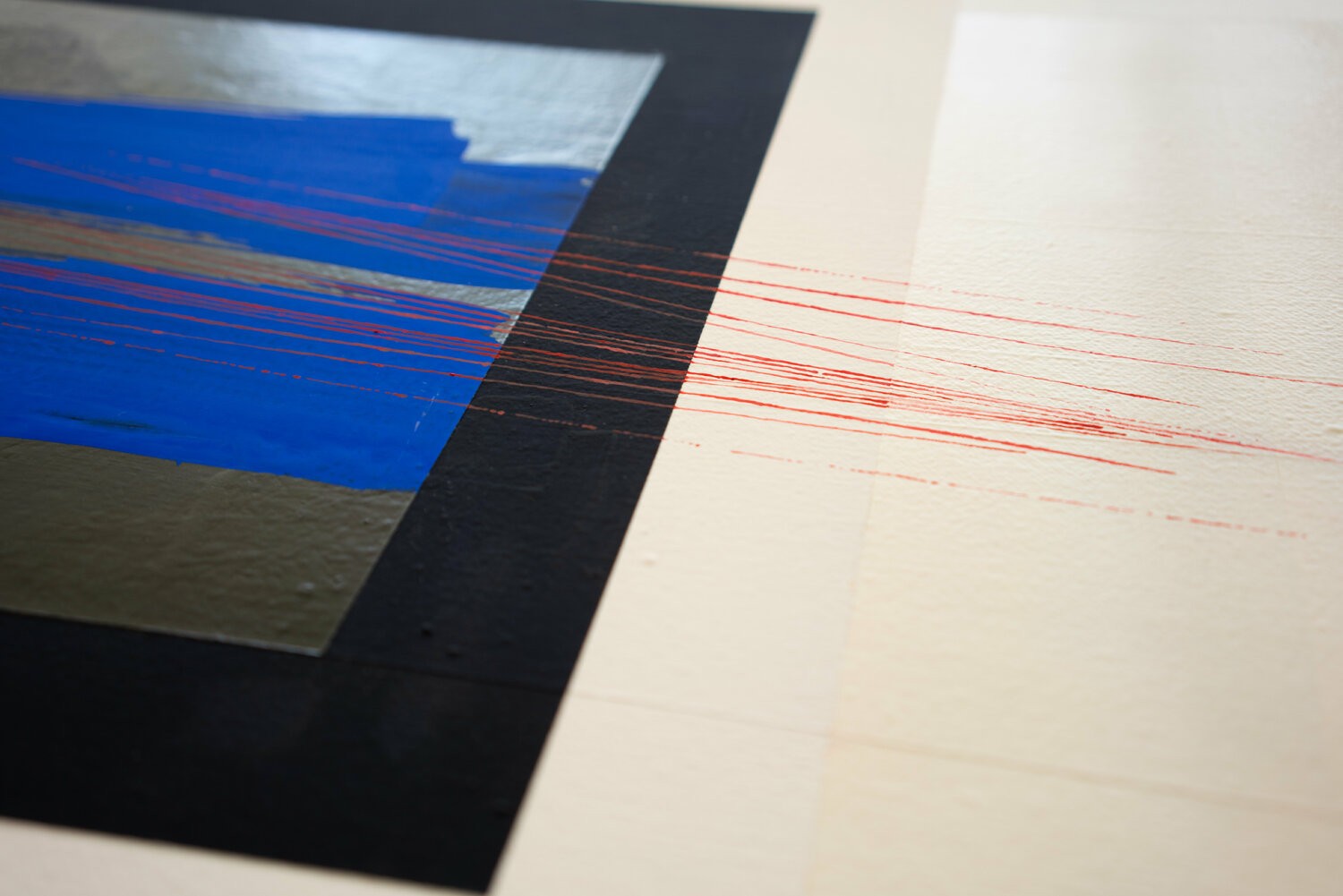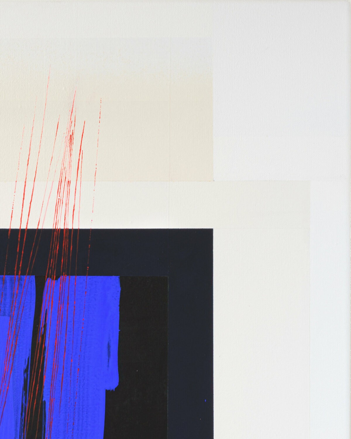 The composition sets up a double formal dialogue. First; between geometric structure and informal random traces. Second; between the matt of the traces and the gloss of the black square. Matt blue is obtained by the use of an extraordinary ultramarine pigment with the addition of acrylic binder.The beige rectangle located at the top of the table; visually dialogues with the charcoal gray and black square via the red lines.