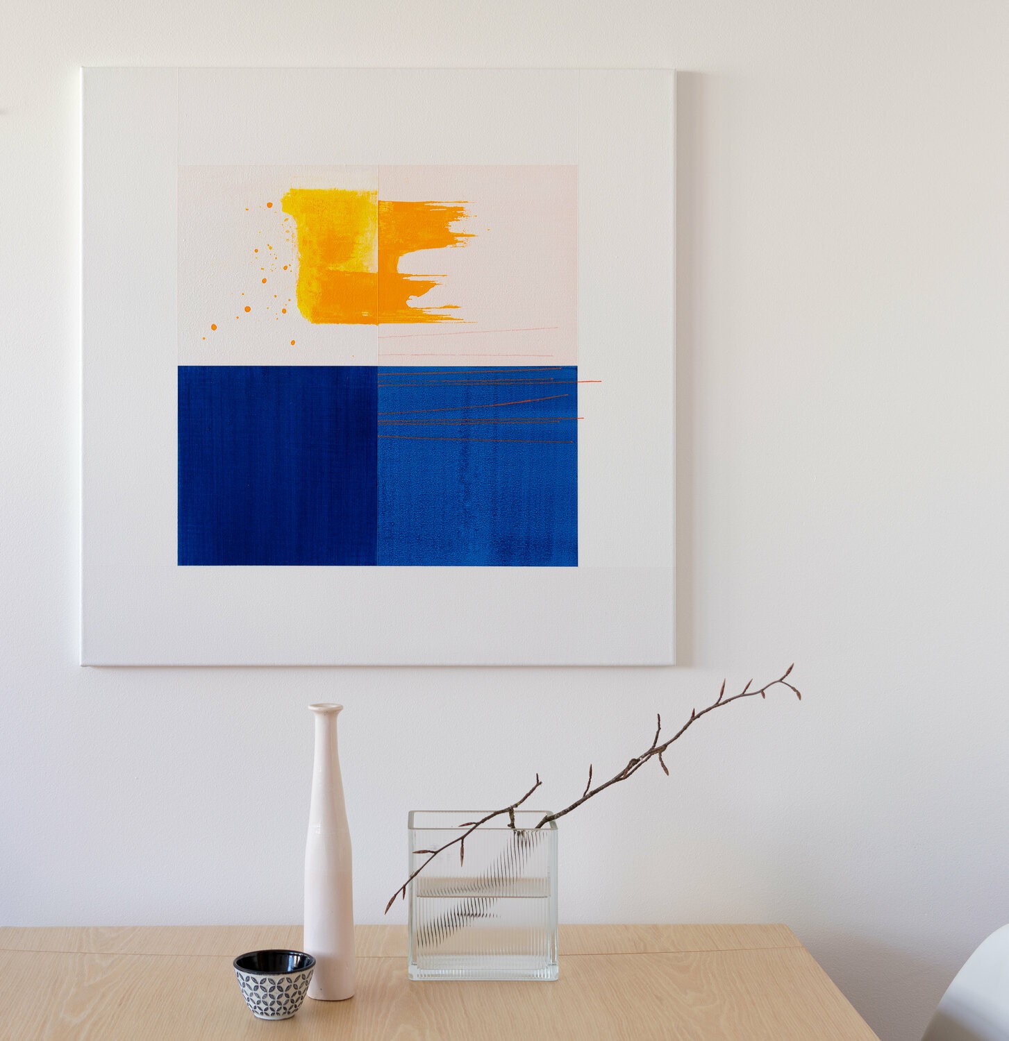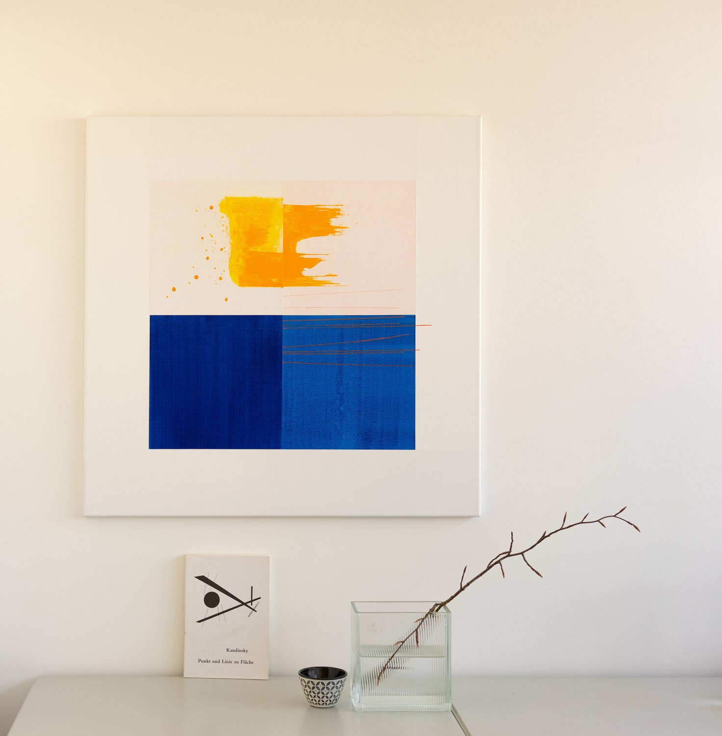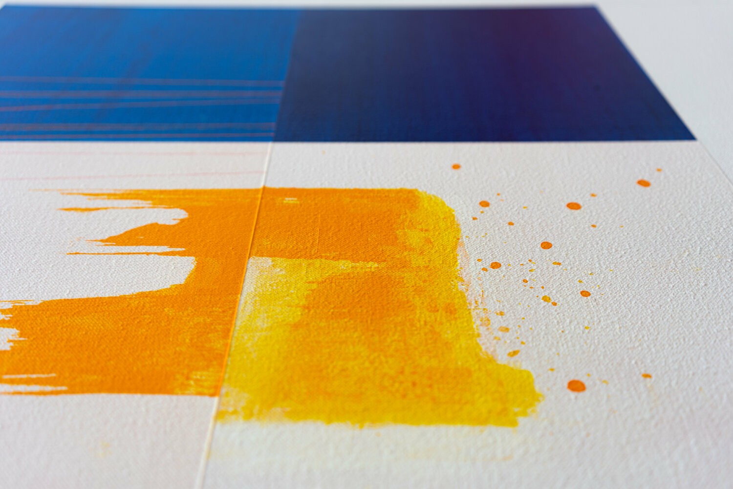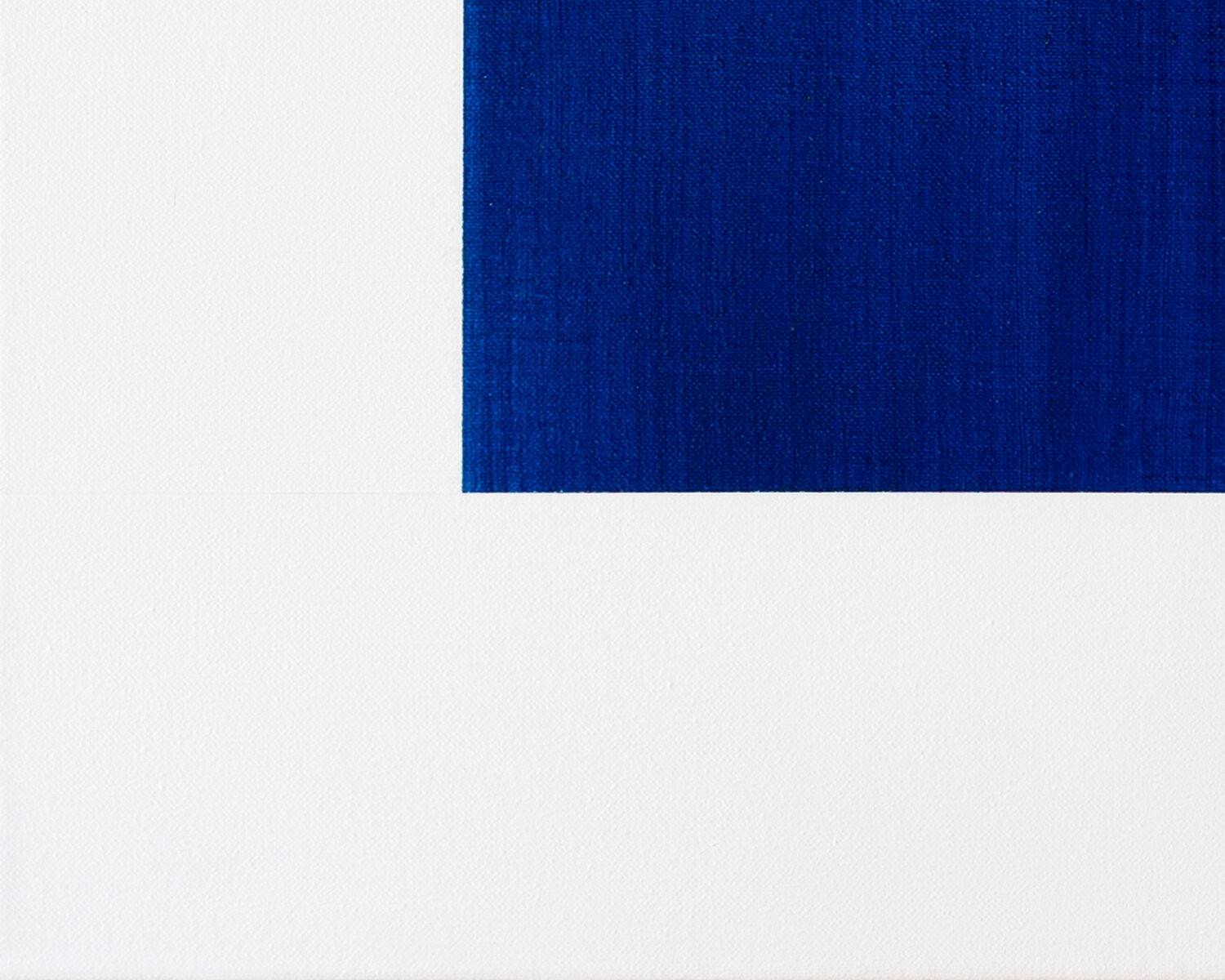 The composition is articulated on a double axis of symmetry. The horizontal axis shares the blue area with the "white" area.