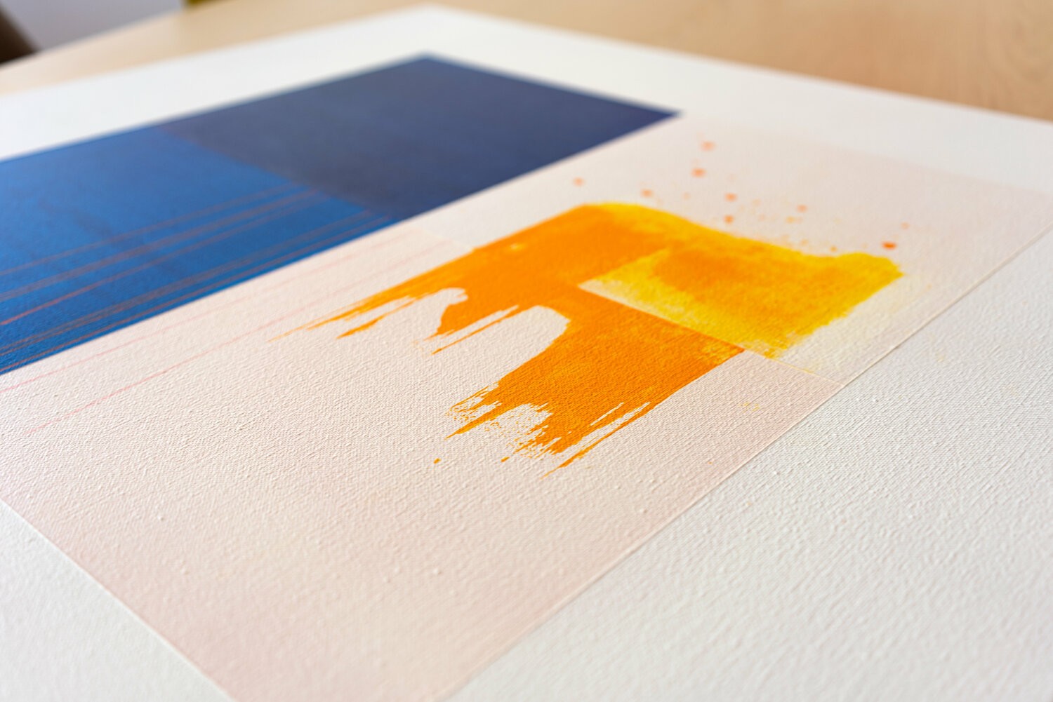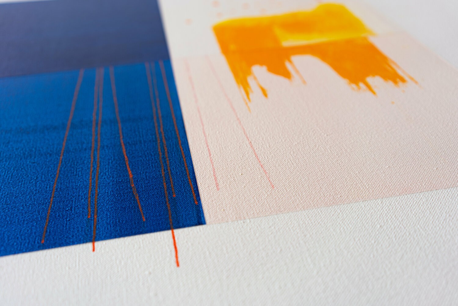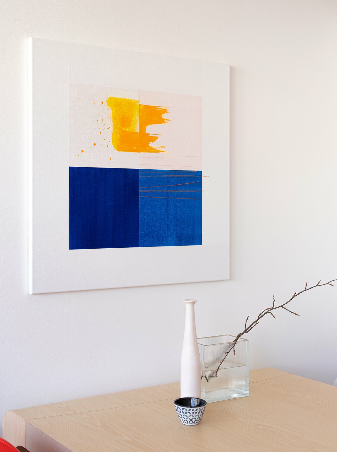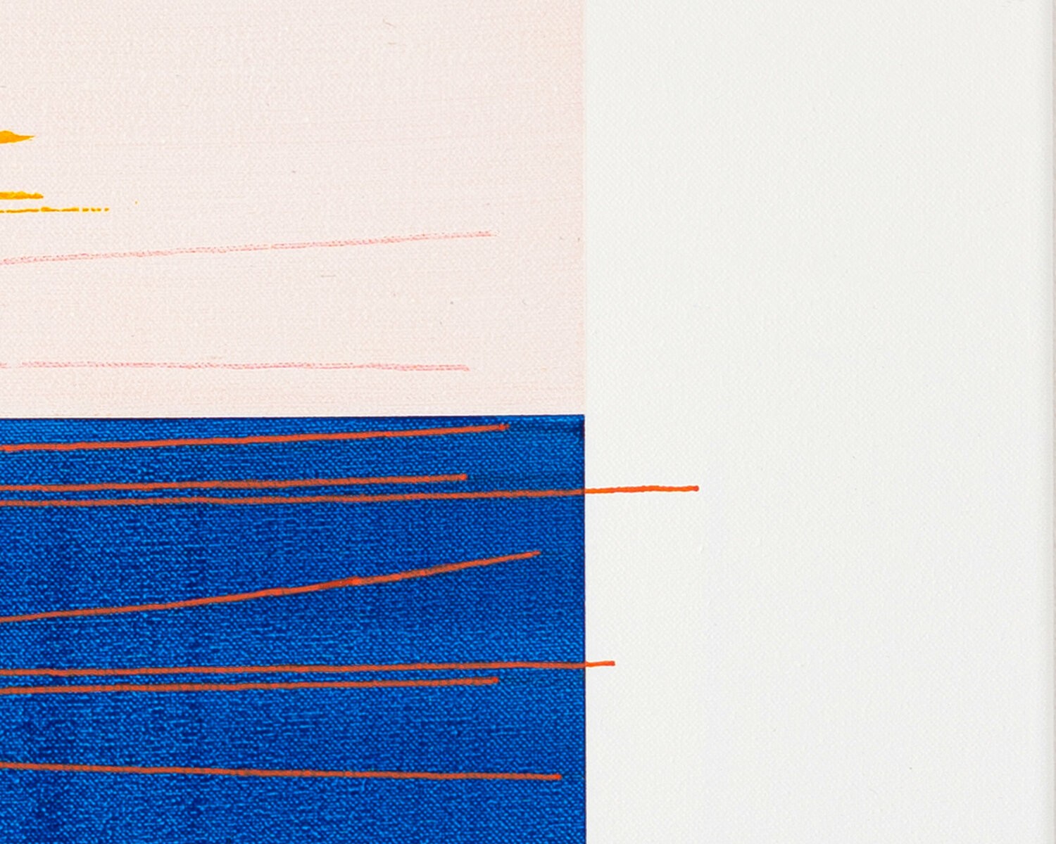 The composition is articulated on a double axis of symmetry. The horizontal axis shares the blue area with the "white" area.