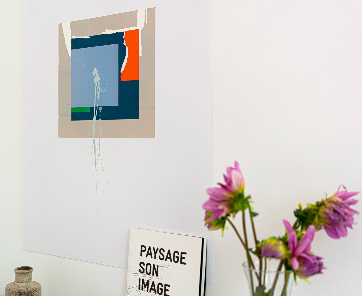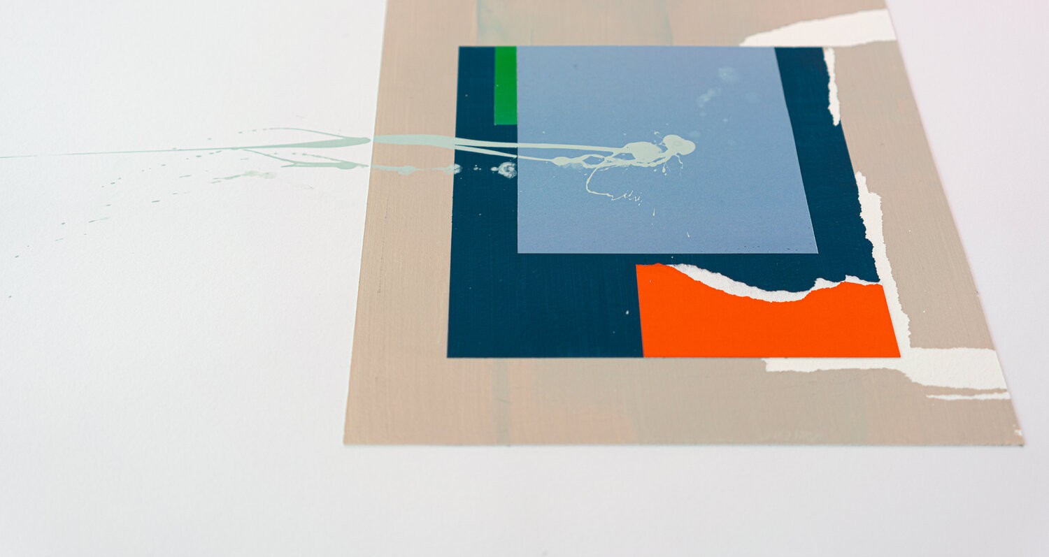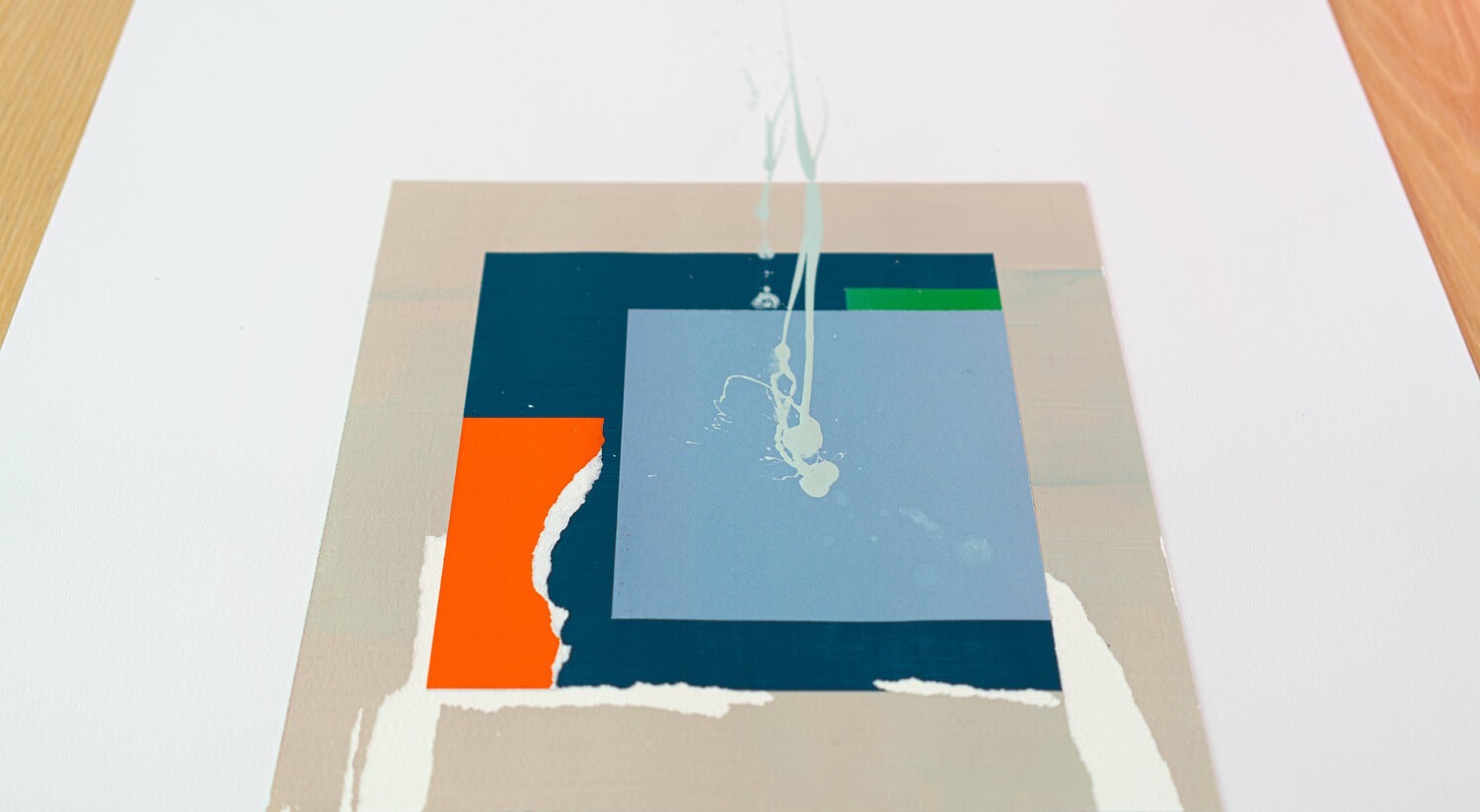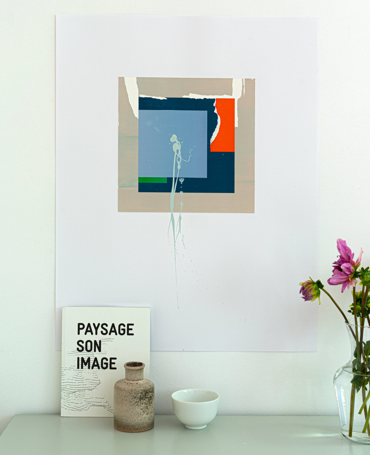 Piccinelli produced this work on paper using collage and acrylic paint. the white paper areas were obtained by tearing the paper but also by tearing it off after gluing.