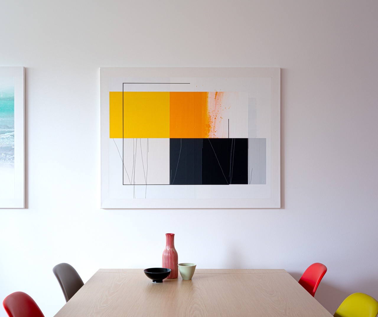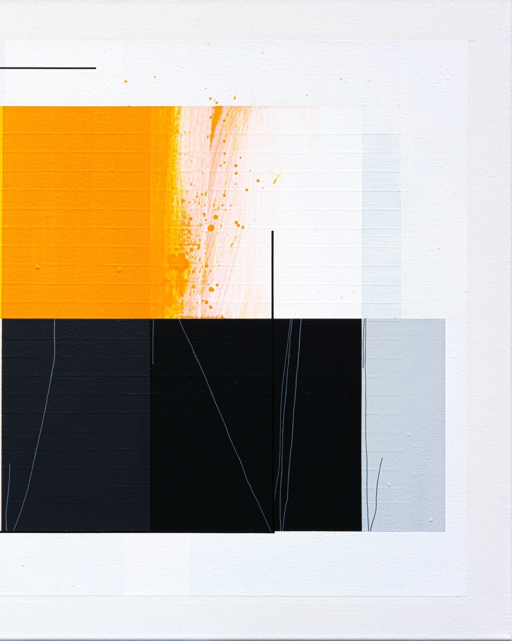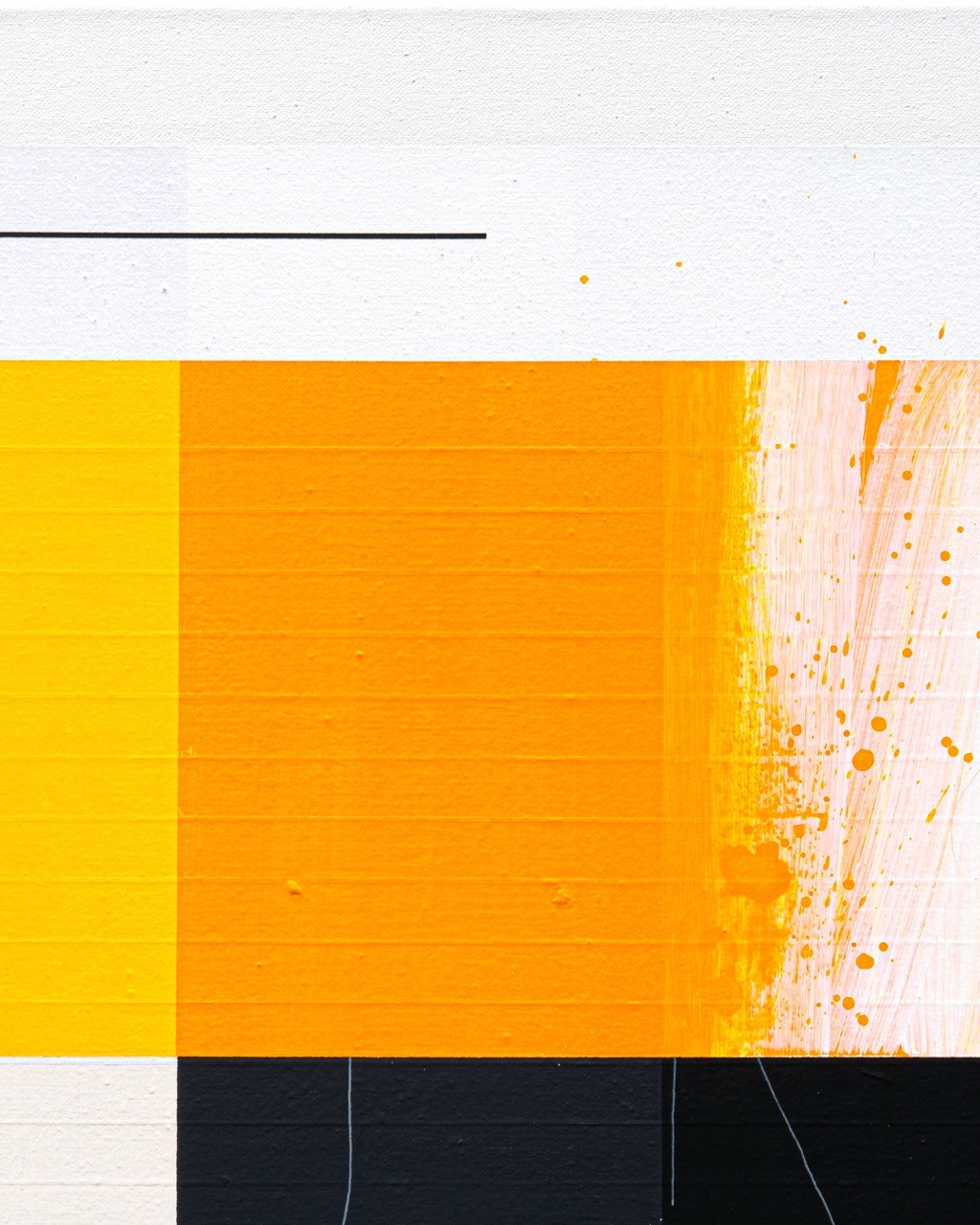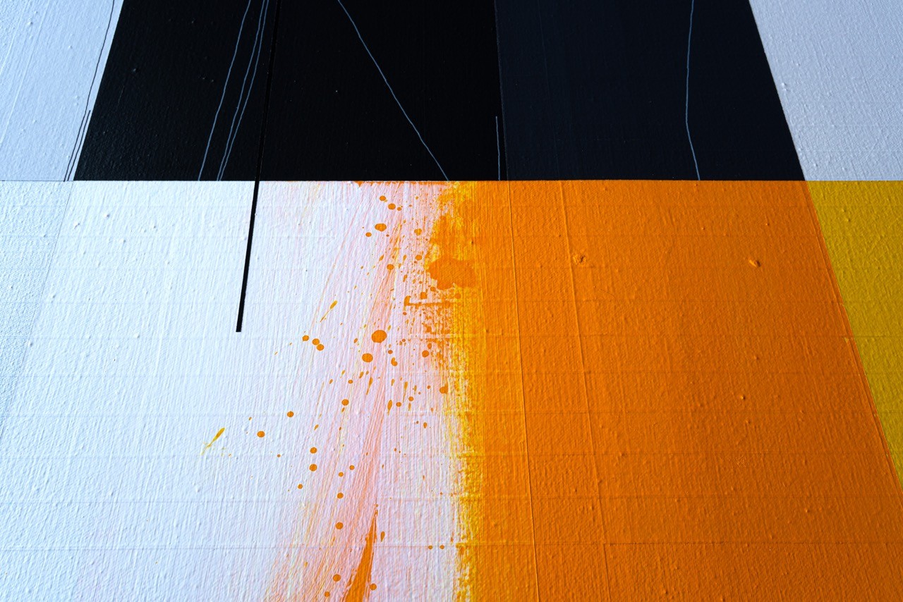 Each section has its own density and silence, like the brief, spaced-out movements of the musical piece. Cage incorporated random operations into his composition. Here, the fine lines that cross the work seem unpredictable, almost accidental. The orange splashes that dissolve the boundary between yellow and black evoke the element of indeterminacy so dear to the composer. The large empty areas (beige, white) function like the essential silences in Cage's work—not as absence, but as active presence.