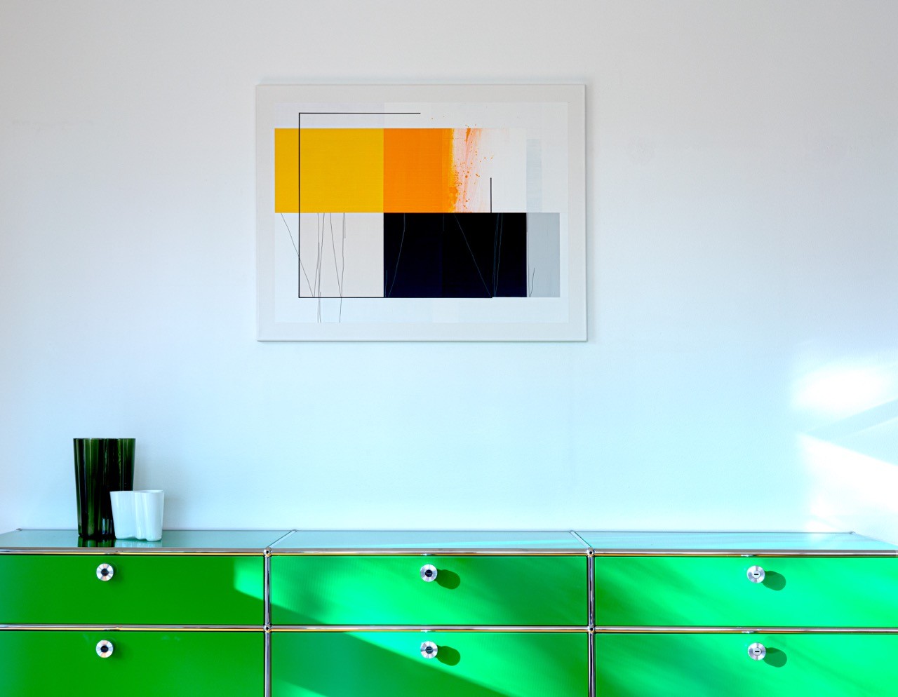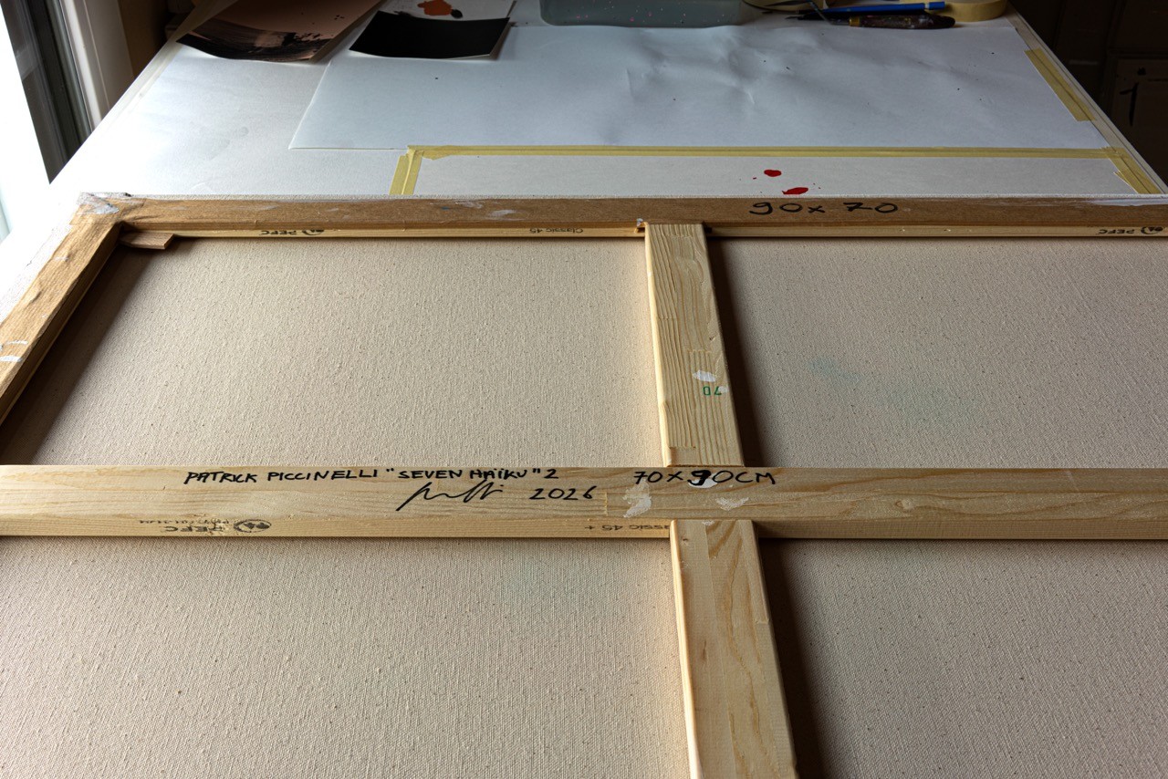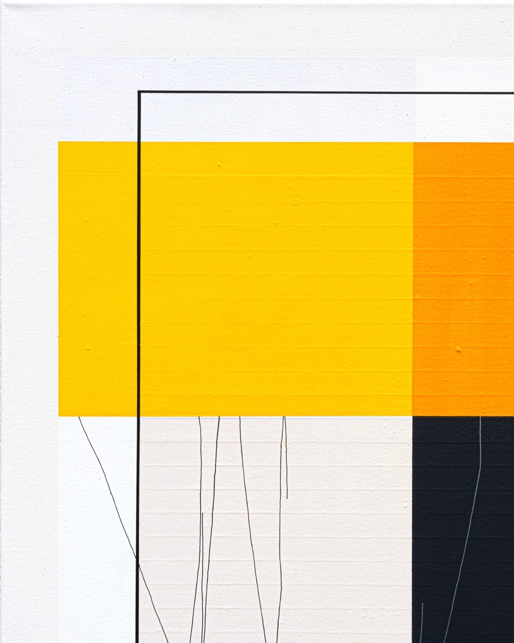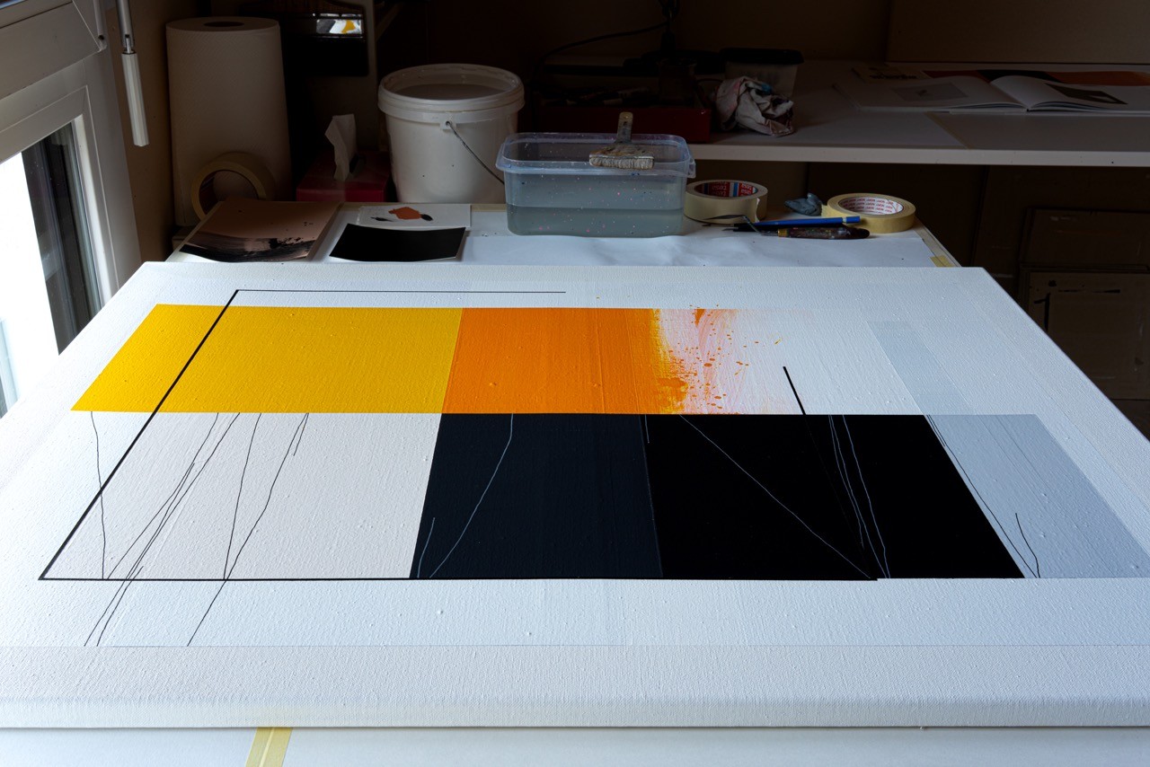 This abstract work establishes a dialogue between John Cage's music and my painting. The visual composition plastically translates Cage's principles. There are seven areas: the blocks of color (bright yellow, orange, deep black, gray-blue) and the spaces between them create a segmentation that evokes Cage's seven haikus.