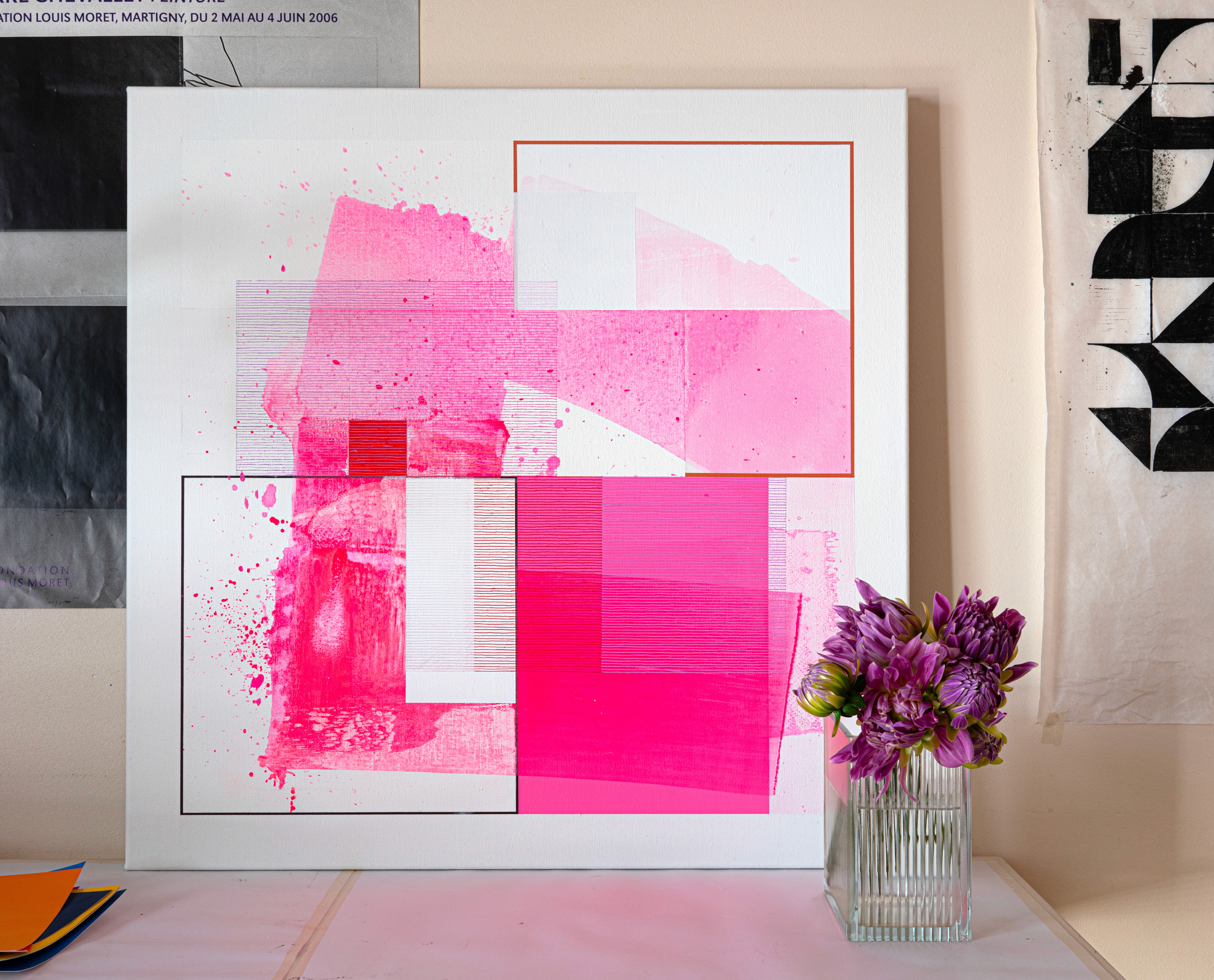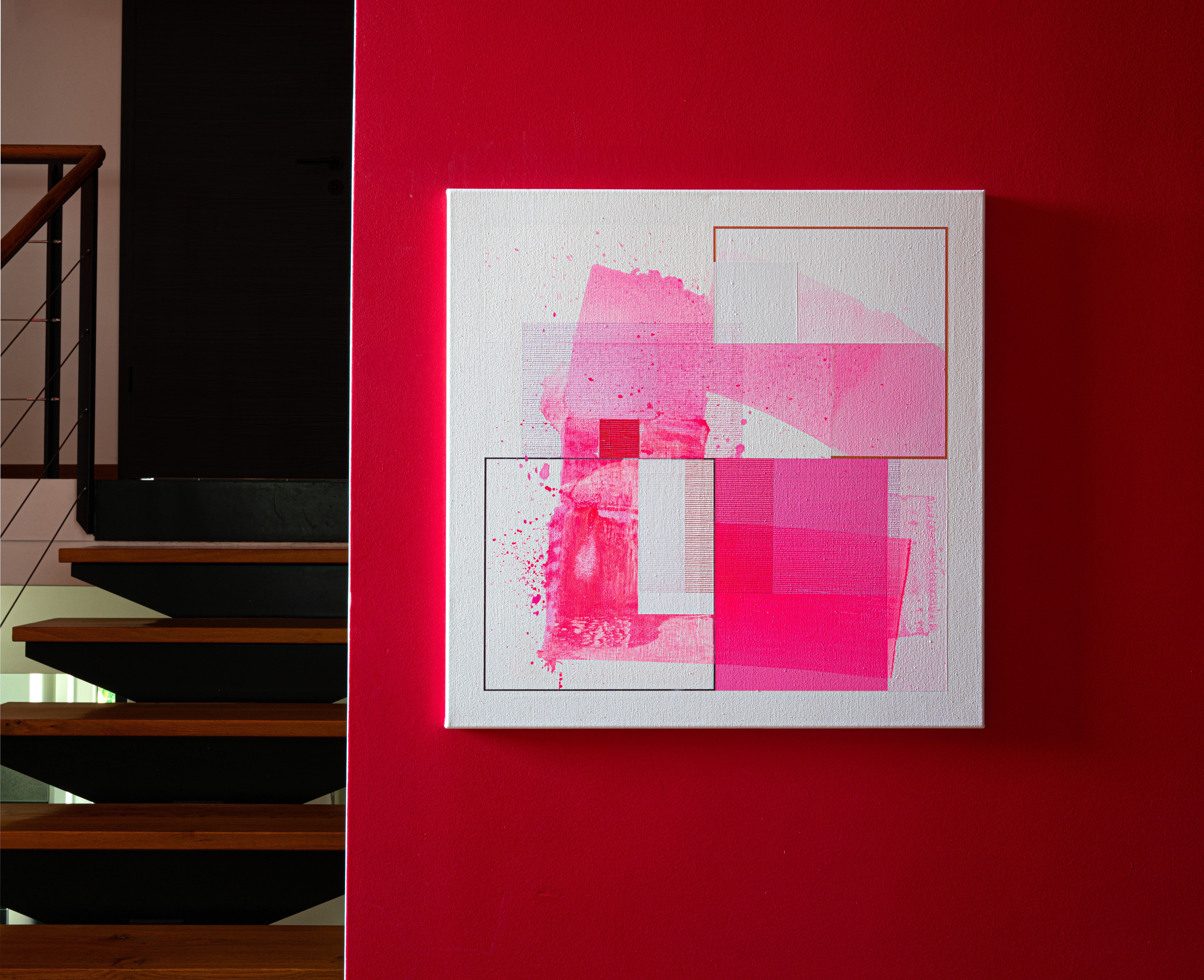 The title “Softly As A Morning Sunrise” evokes a gentle, progressive temporality. The pictorial composition conveys this same temporal quality through its transparencies and superimpositions, which suggest a gradual unfolding, like the dawn breaking.