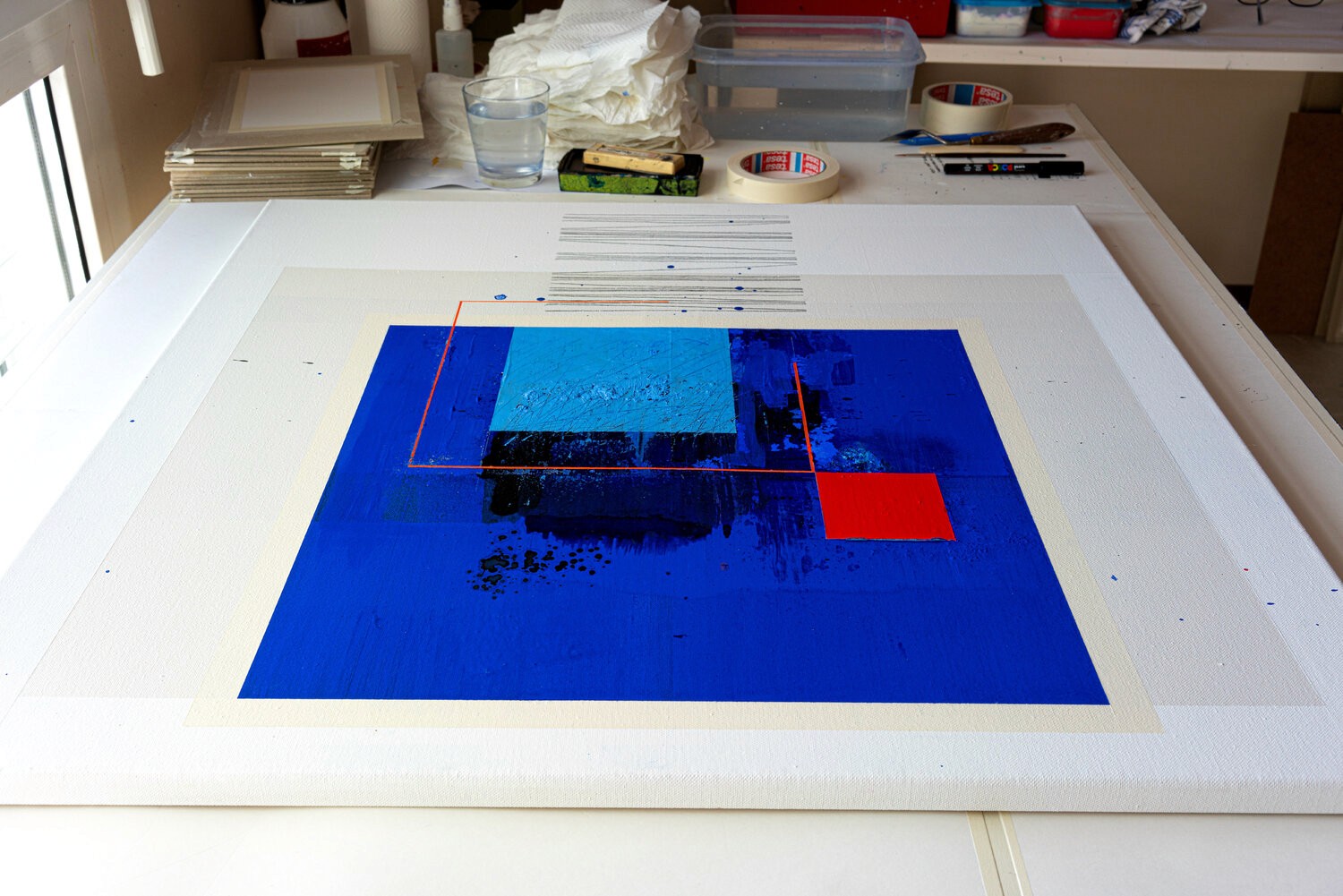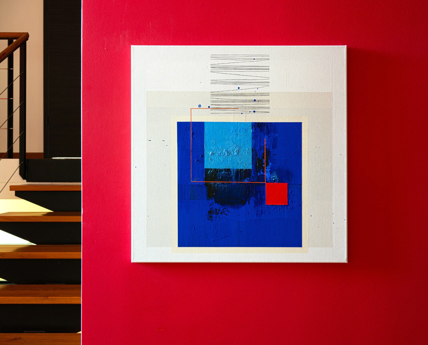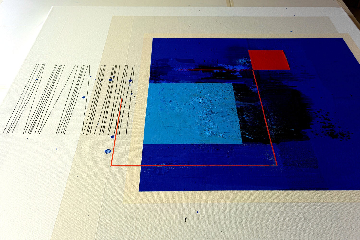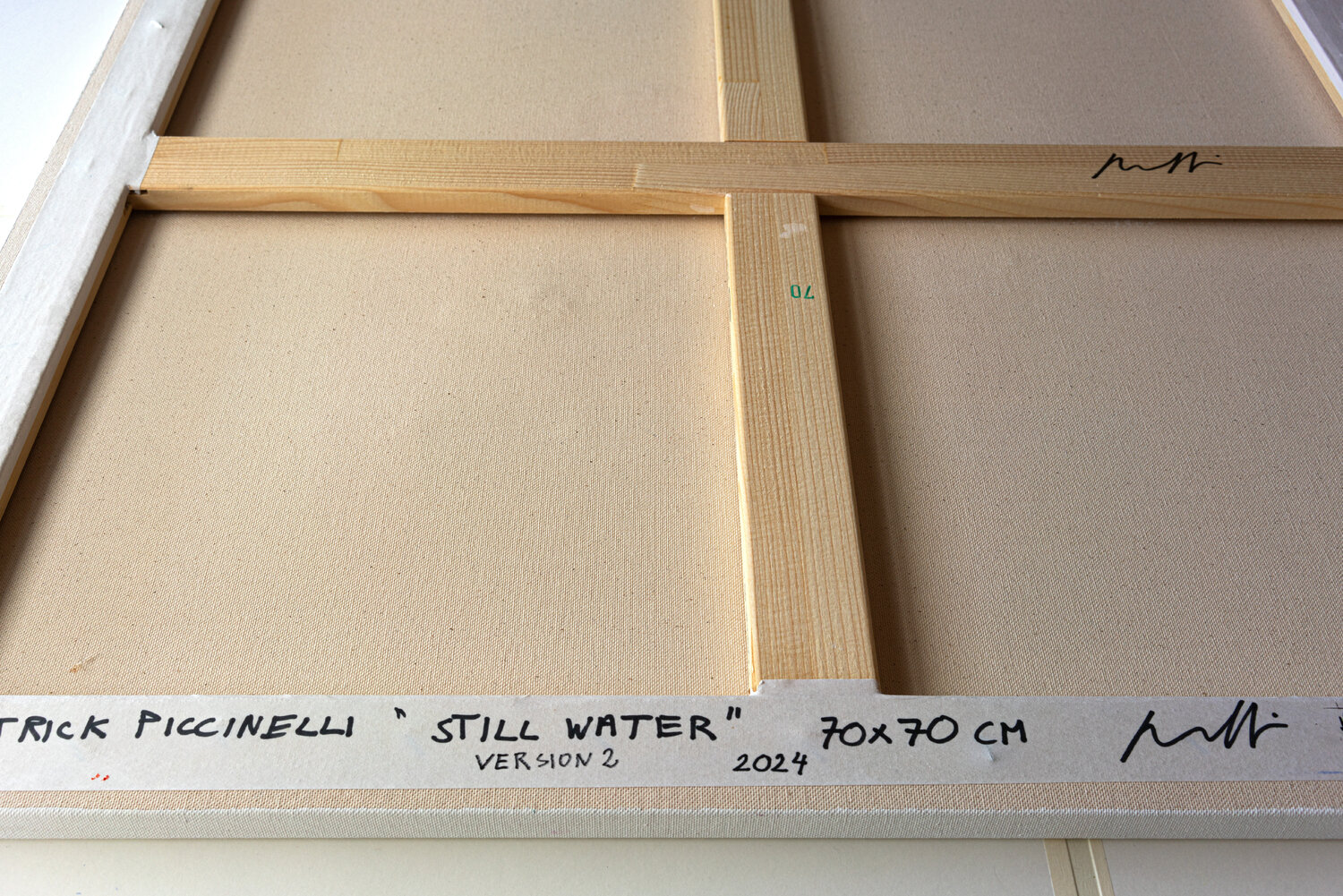 I created this work with high quality artist acrylic paint; ultramarine pigment; Indian ink and an oil pastel from the famous French brand Sennelier; which only uses pigments from first quality.For me; still water metaphorically represents serenity and inner peace. I love seeing a perfectly still surface of water; a clear mirror reflecting the blue sky and floating clouds. This tranquil water symbolizes a peaceful soul; freed from the disturbances and turbulence of daily life.Like Lake Neuchâtel (near my studio in Switzerland); peaceful at sunrise; the calm water evokes a moment of clarity and contemplation. It invites reflection and introspection; providing a space where thoughts can rest gently; undisturbed by waves or strong currents. So still water is a powerful metaphor for inner peace; deep reflection and strength.