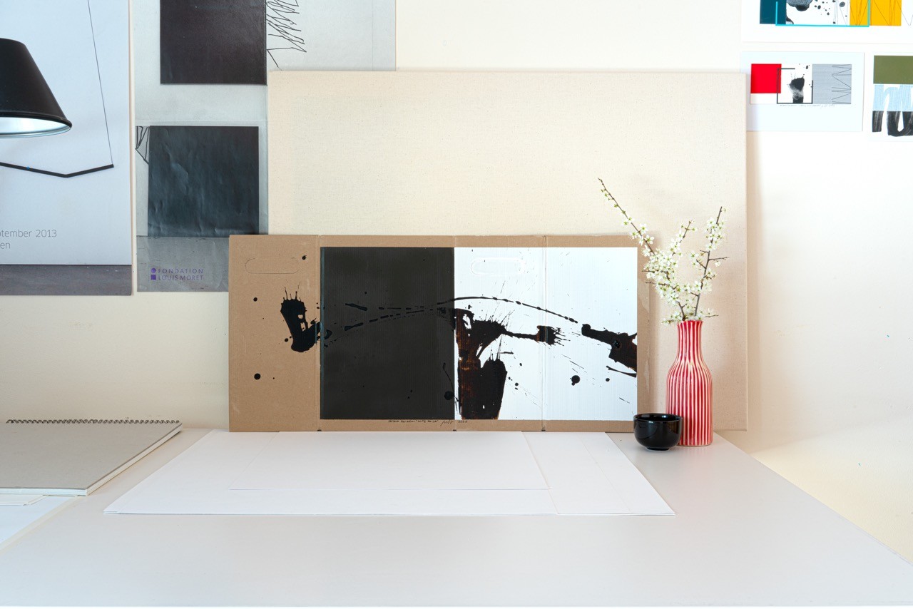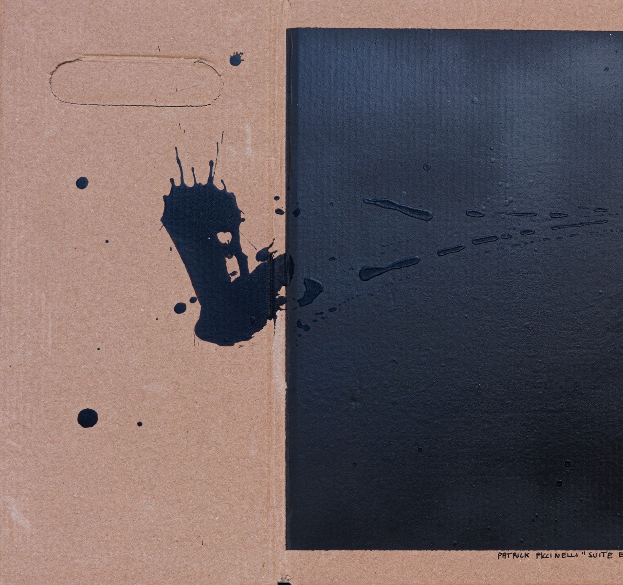 The walnut stain is sprayed, splashed, and dragged. We can clearly distinguish several types of gestures that correspond to the different movements of the “Suite in A”
