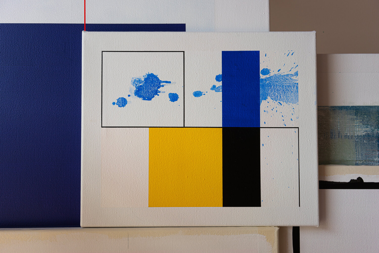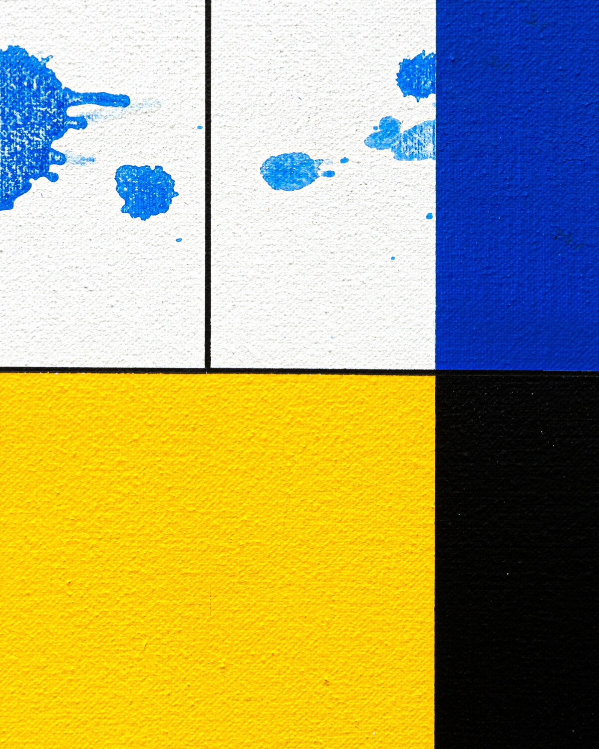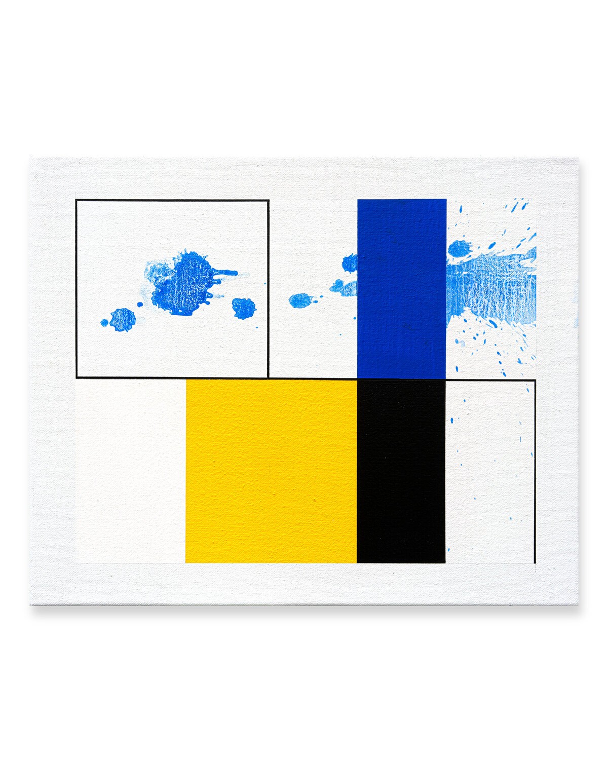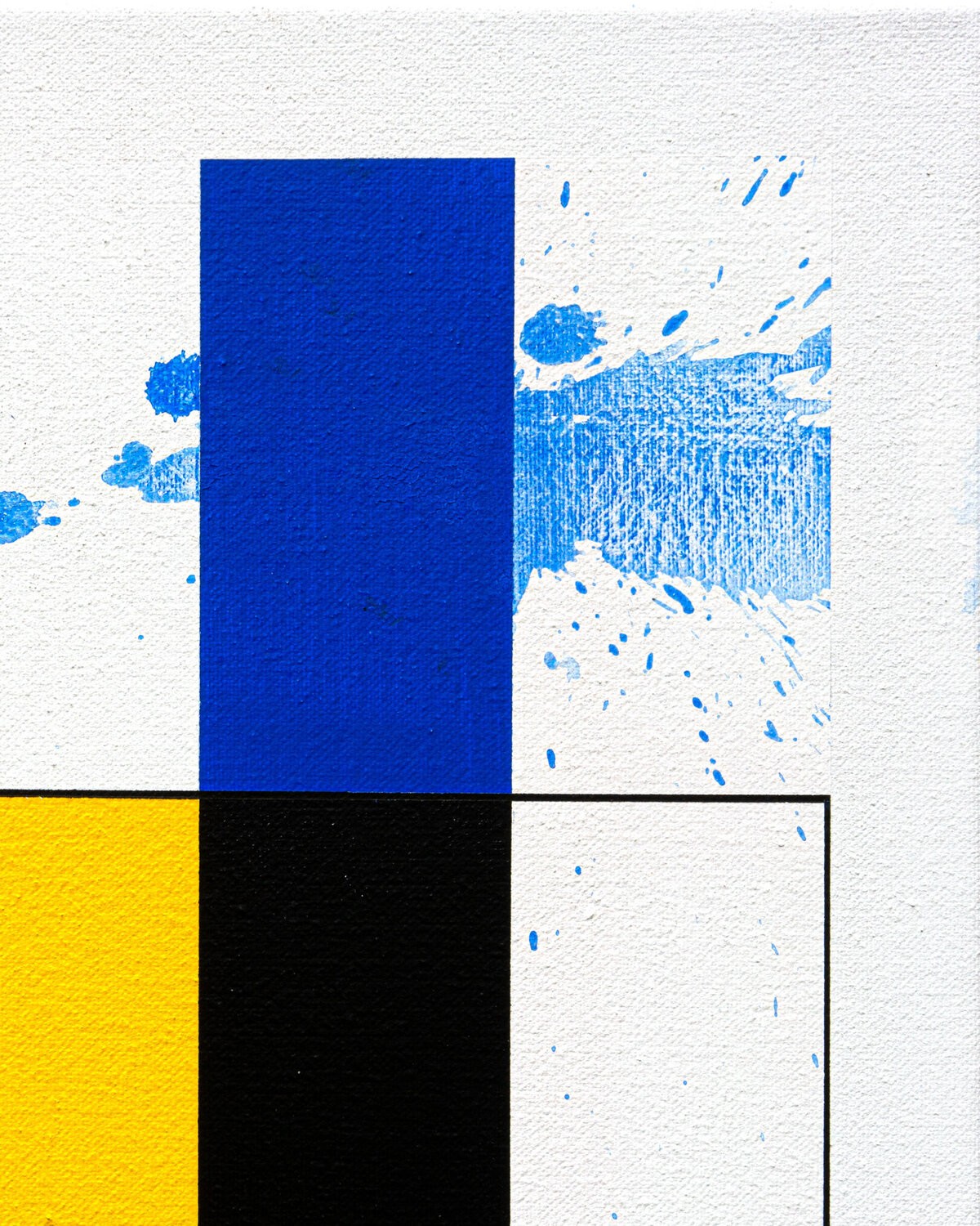 This work by Patrick Piccinelli evokes the rigorous compositions of Piet Mondrian. But Piccinelli uses these aesthetic codes to divert them towards another expression. He creates a geometric composition and then disrupts its reading with traces and splashes of fluid paint. As if Jackson Pollock was having fun intervening on a Mondrian painting! These traces and these spots of blue shades crossing the composition to escape to the right evoke for the painter; the blue and the summer breezes which begin to fade with the end of the beautiful season.