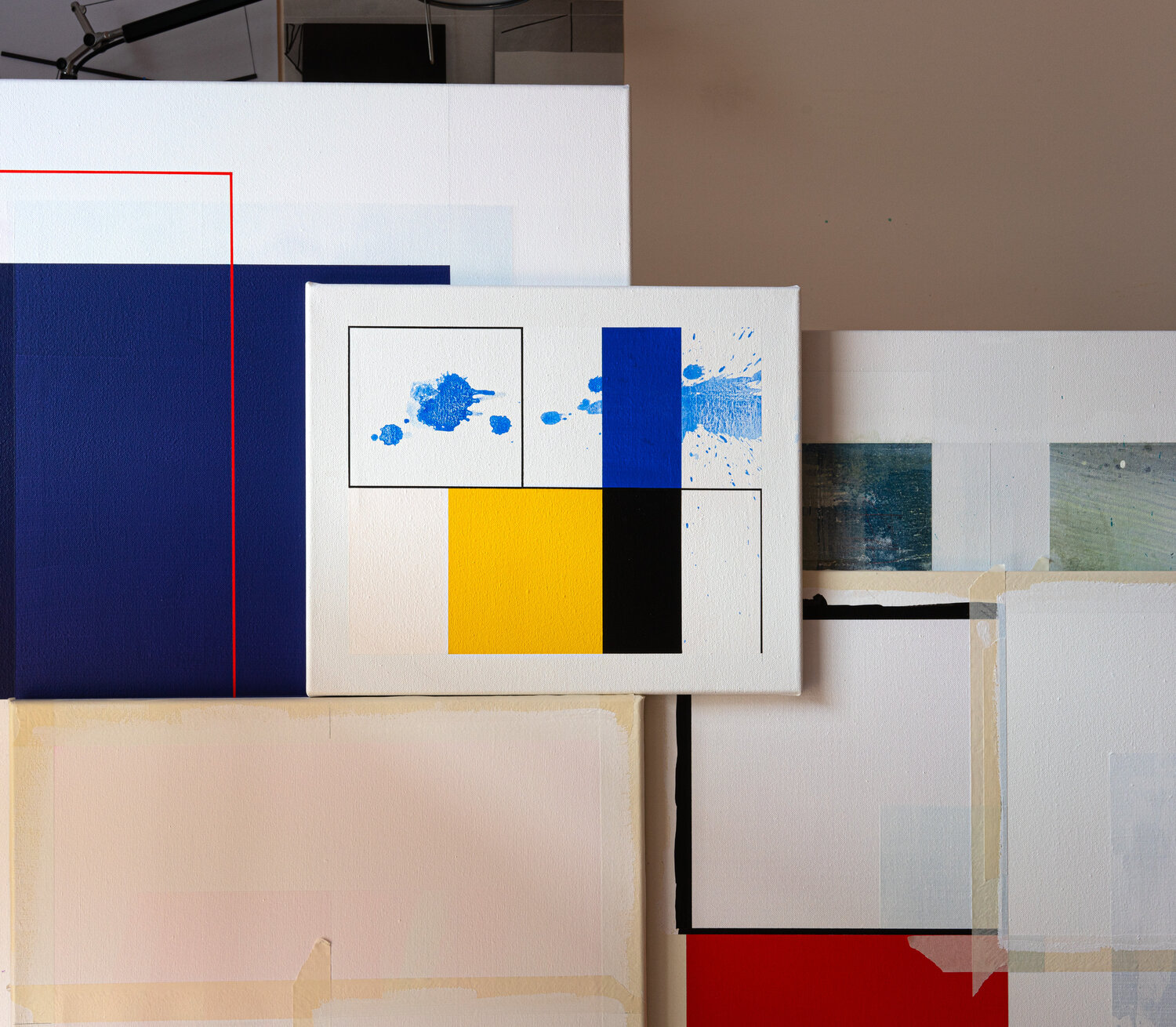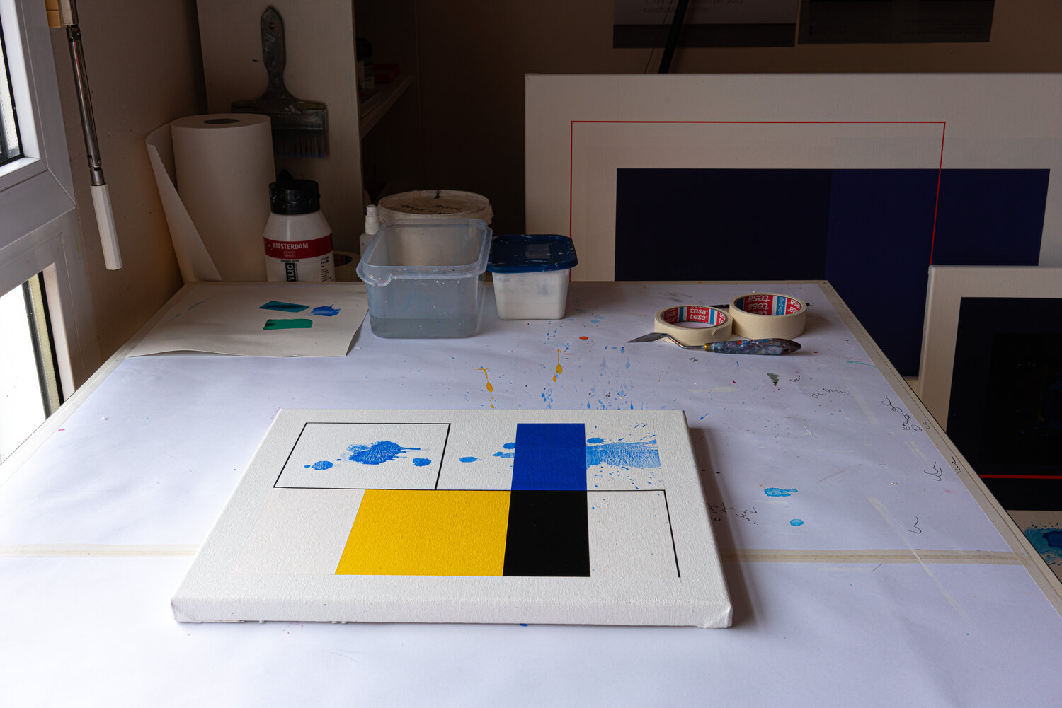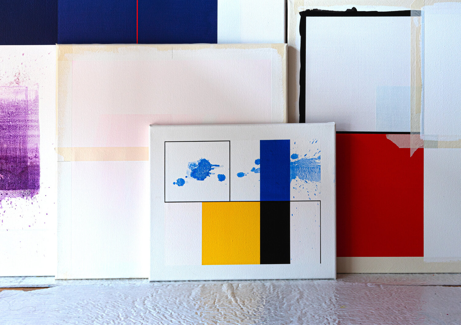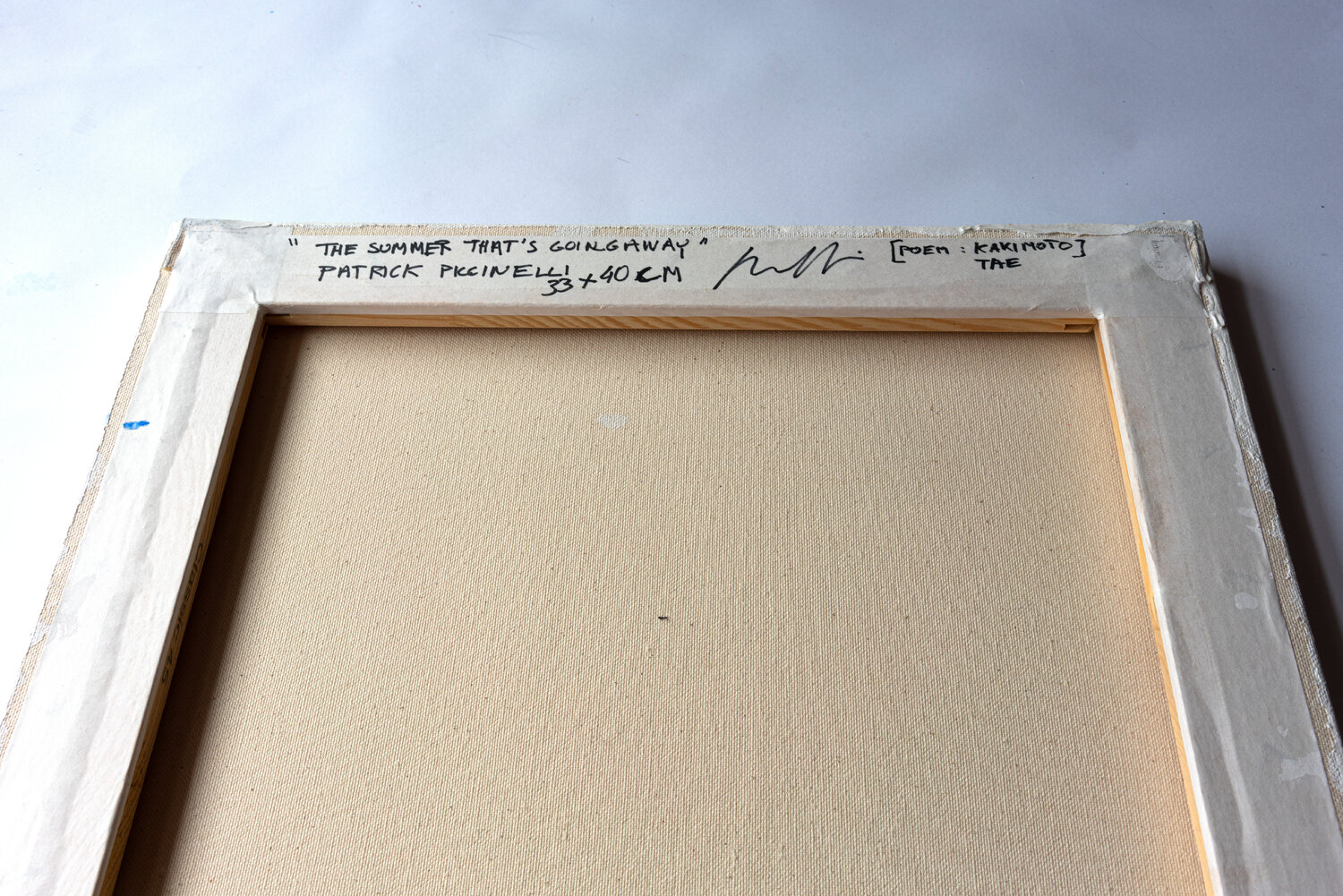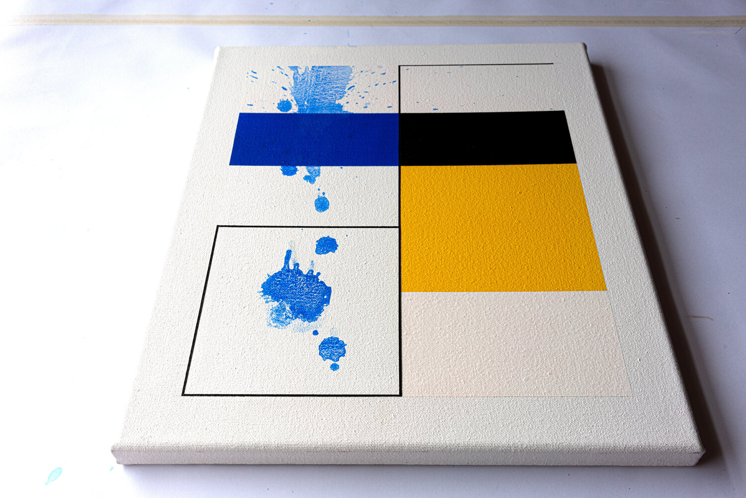 This work by Patrick Piccinelli evokes the rigorous compositions of Piet Mondrian. But Piccinelli uses these aesthetic codes to divert them towards another expression. He creates a geometric composition and then disrupts its reading with traces and splashes of fluid paint. As if Jackson Pollock was having fun intervening on a Mondrian painting! These traces and these spots of blue shades crossing the composition to escape to the right evoke for the painter; the blue and the summer breezes which begin to fade with the end of the beautiful season.