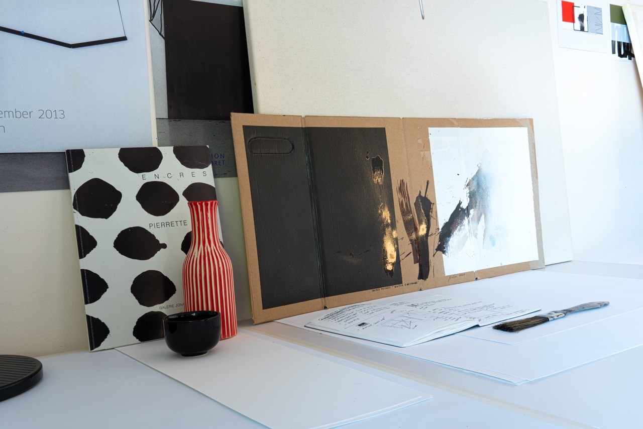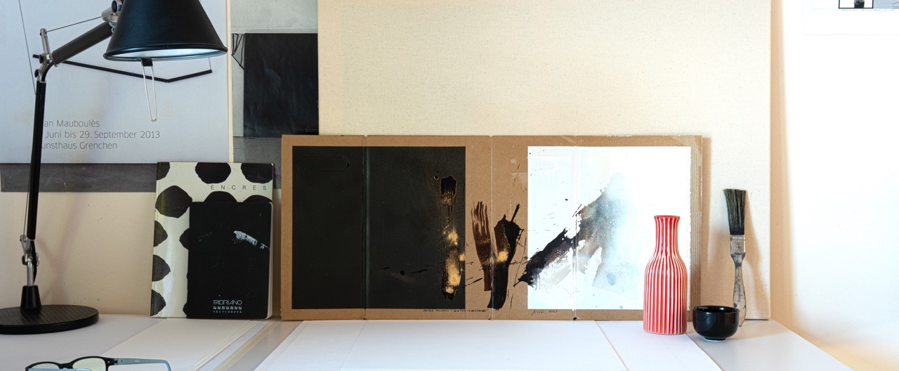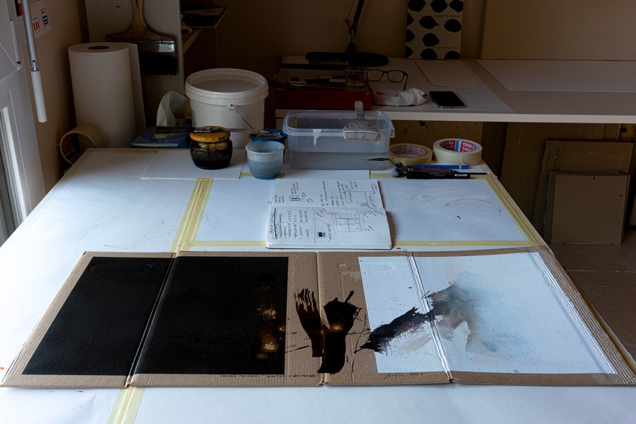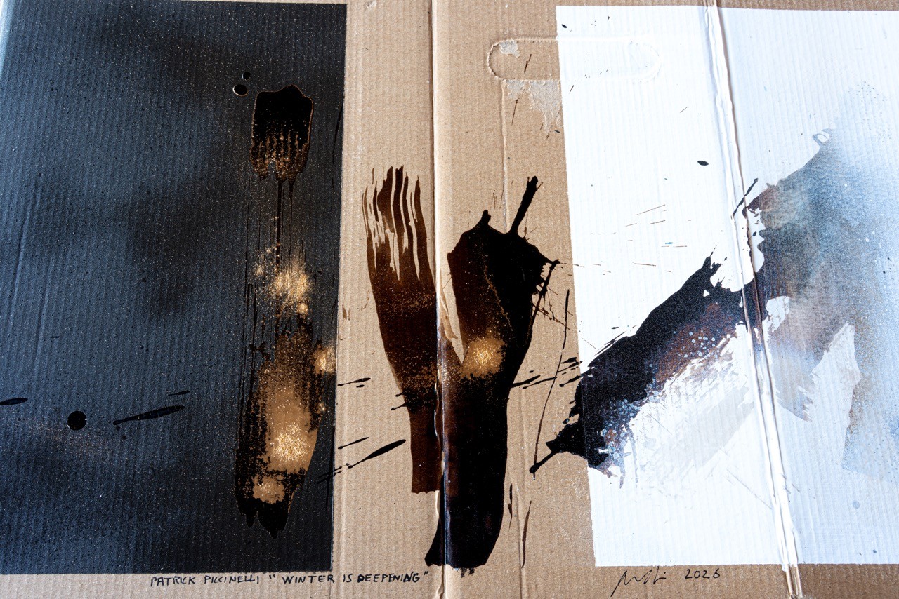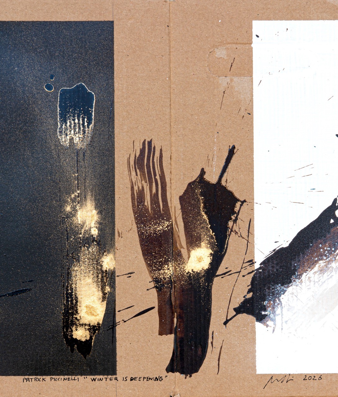 I used walnut stain and a mineral pigment to create this piece on recycled cardboard. The Japanese poet Iida Ryûta wrote: “Winter deepens / Just as deepens / A father’s love.” My work is inspired by this haiku. What we see is a “triptych” on raw cardboard—a humble, rough, unadorned material—arranged from left to right as a progression from black to white, from night to light. The haiku is a simple, stripped-down form, devoid of ornamentation. Painting on industrial cardboard—a transient, ordinary material—is to choose the same rejection of refinement. The truth of winter, and of paternal love, does not require a beautiful medium.