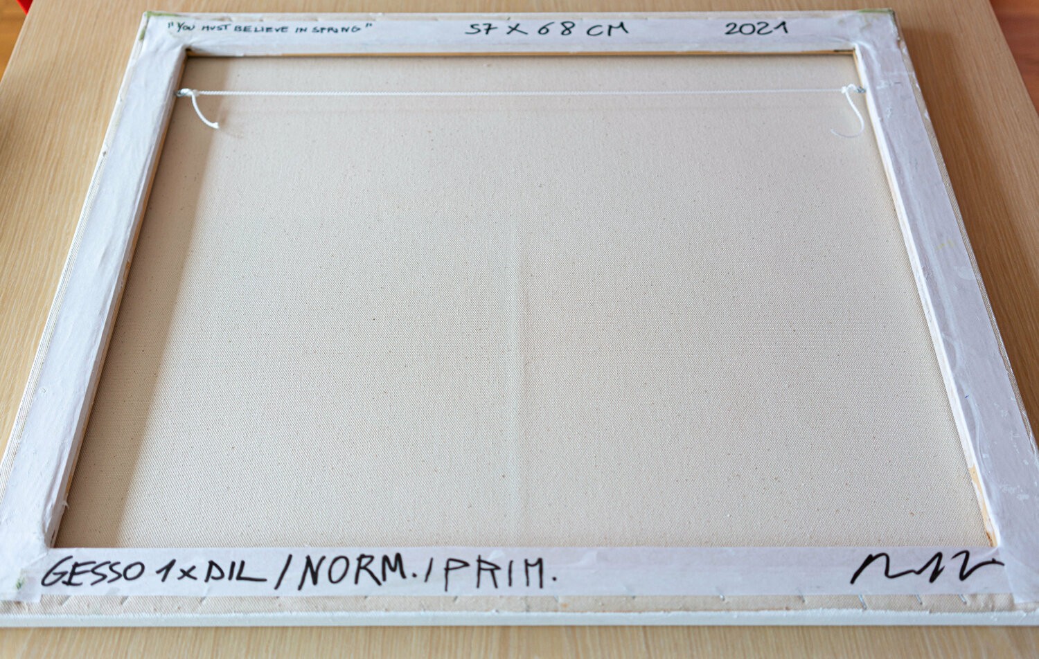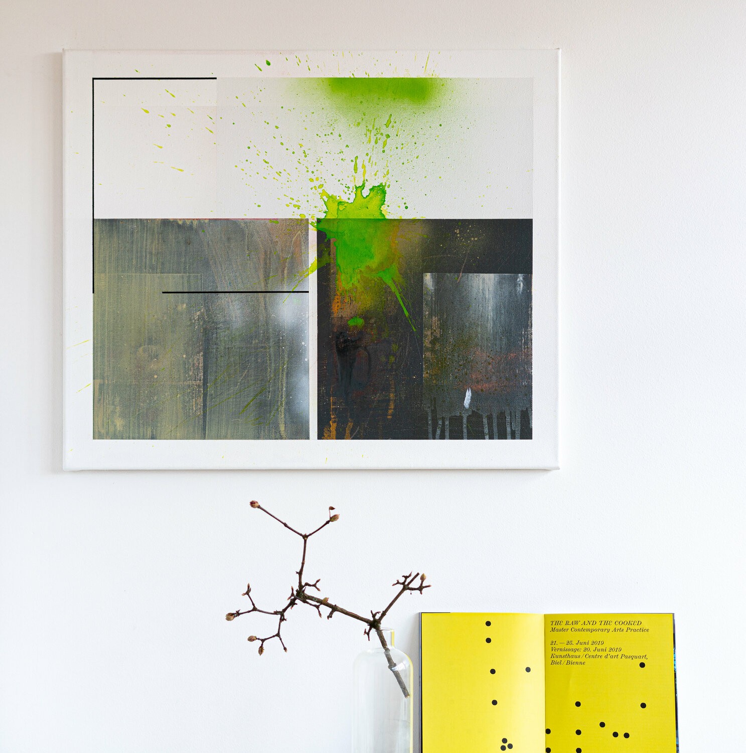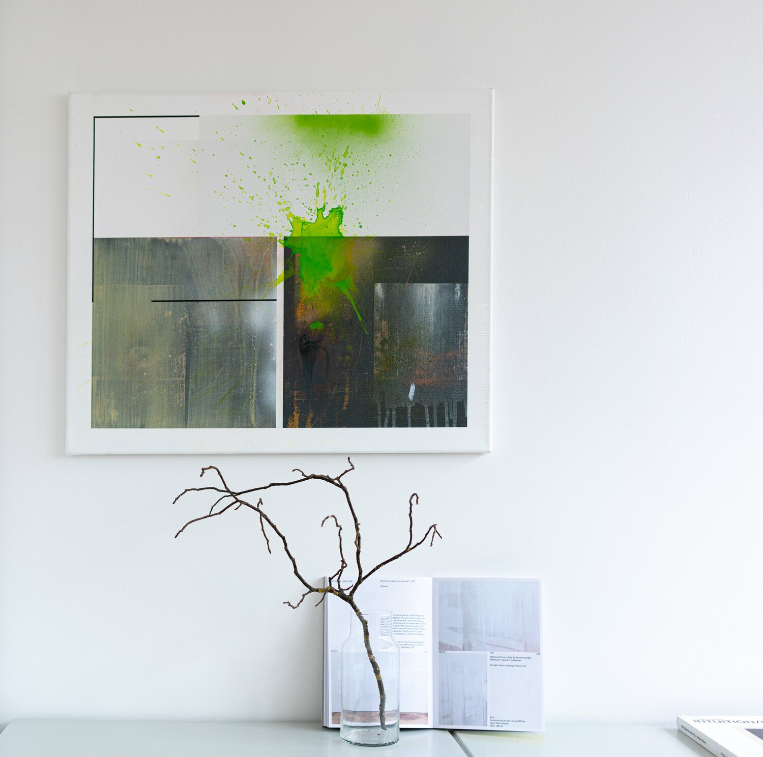 Piccinelli evokes the passage from winter to spring in this work. The textures and shades present in the 2 squares refer to the plant elements at the end of winter. The projection of green acrylic ink (almost fluorescent) evokes the first shoots of the new season and all the effervescence of spring. The composition is balanced between the geometric structure and the informal and free pictorial dimension.By experimenting with a fundamental and archaic pictorial gesture; devoid of any ostentatious virtuosity but which does not exclude the jubilation provided by chromatic sparkles; Claude Viallat sets himself the goal of rediscovering the “origins of painting”. Or to quote the artist: "I am not learning painting; it is she who teaches me what it is".